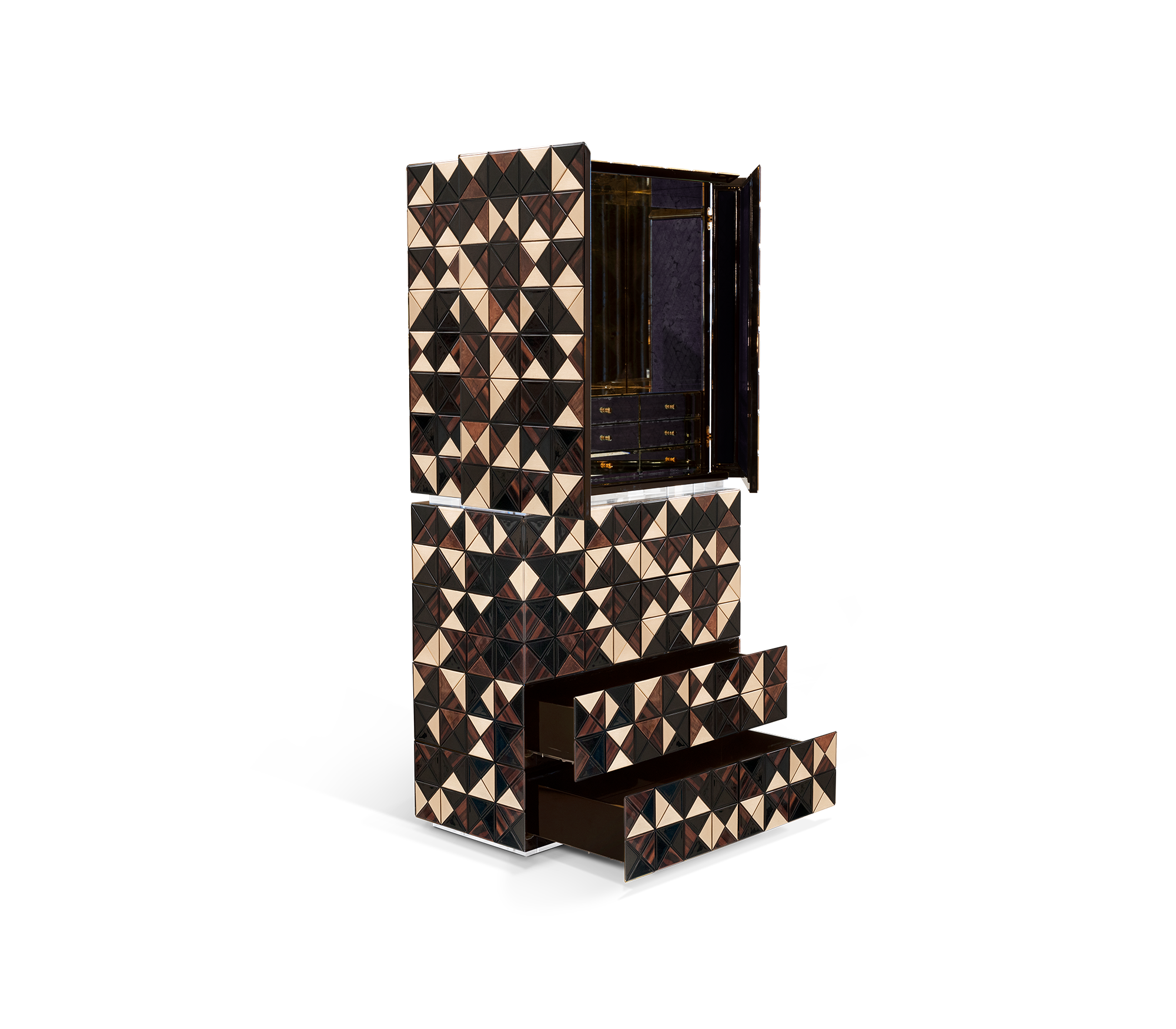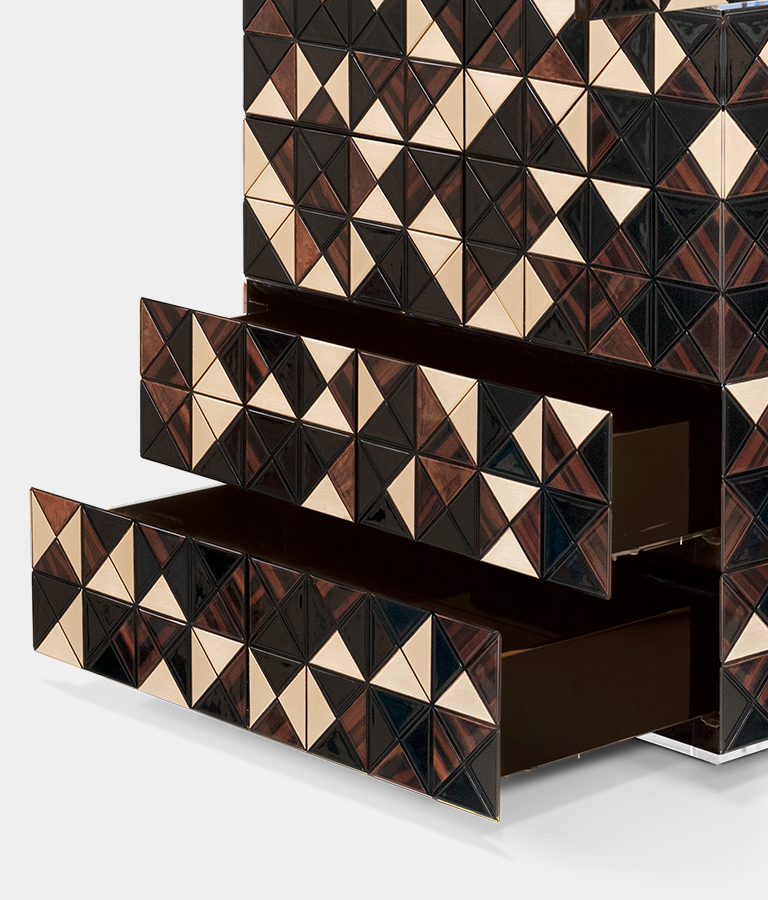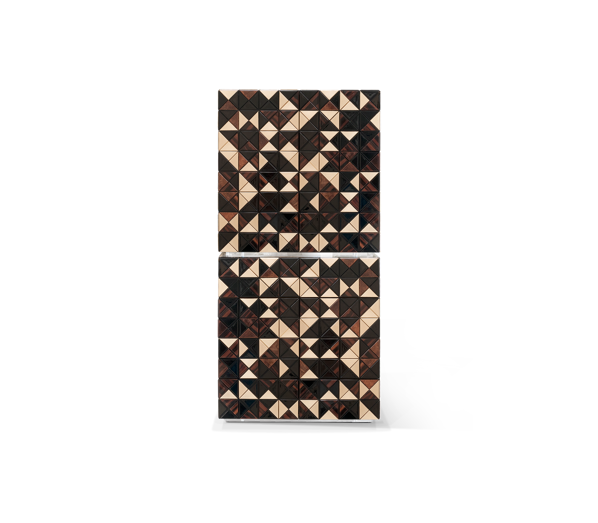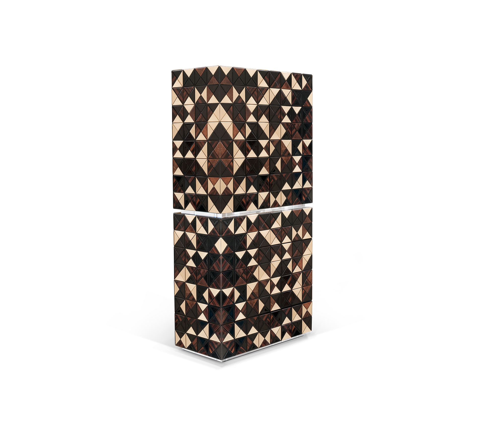 Iconic and unparalleled, the Pixel II Bar Cabinet presents a ground-breaking work of pioneering design. This piece carries the dedication and art of those who built it, and a variety of traditional production techniques to craft an avant-garde furniture piece that is authentic, joyful and a perfect match for the digital age. Its playful character is captured in shape and colour palette, challenging design and finest craftsmanship. Made out of 1088 triangles, the upper part of the Pixel Bar Cabinet plays with perception and combines exceptional materials with a walnut composition to give the cabinet a unique, striking design.