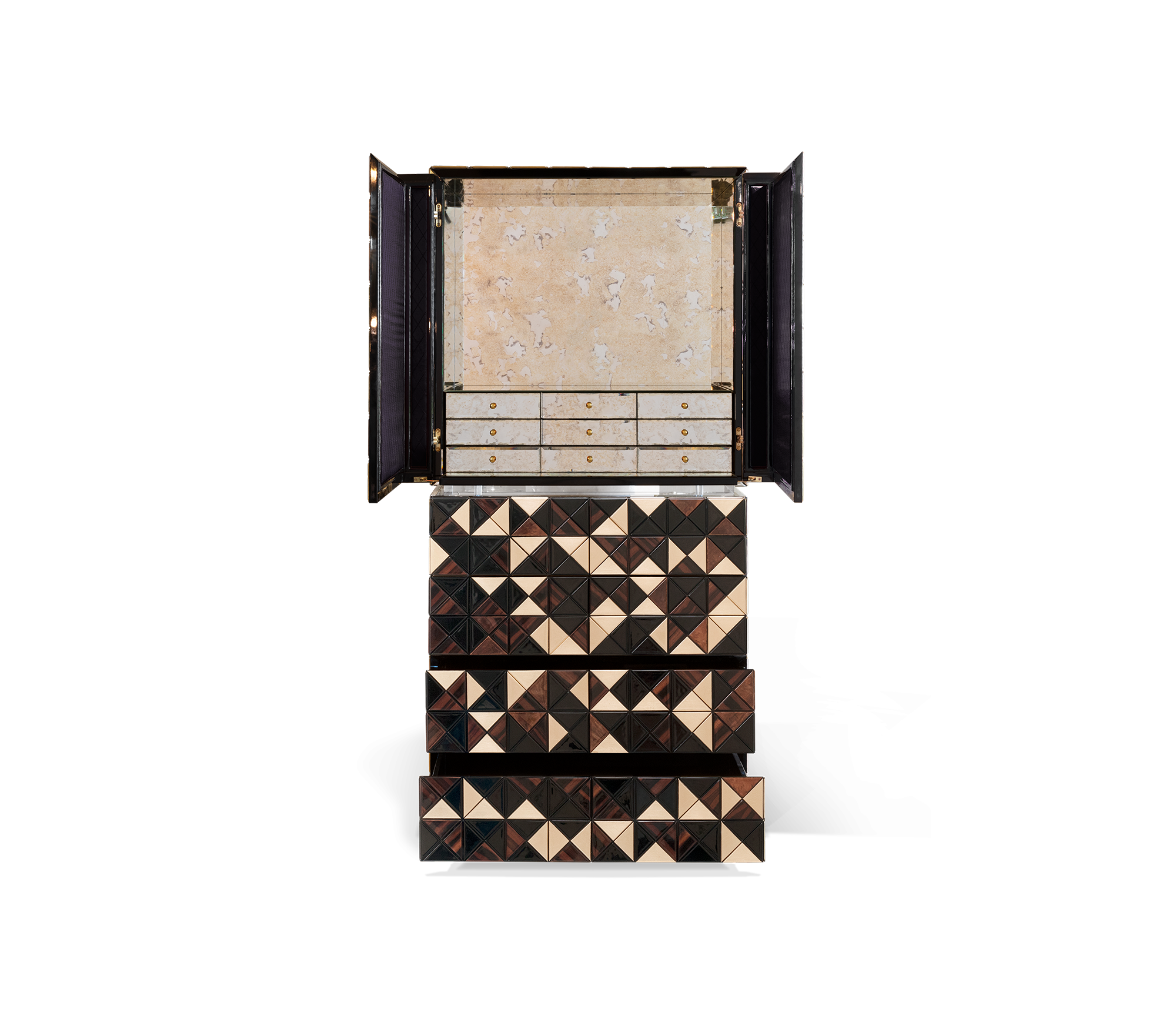 Wood, Mirror, Acrylic. Triangulos: Lacquered Wood, Gold Leaf, Walnut Root Veneer and Ebony Veneer.