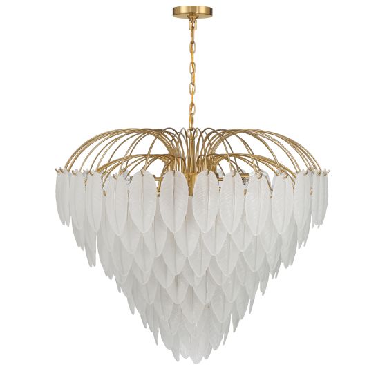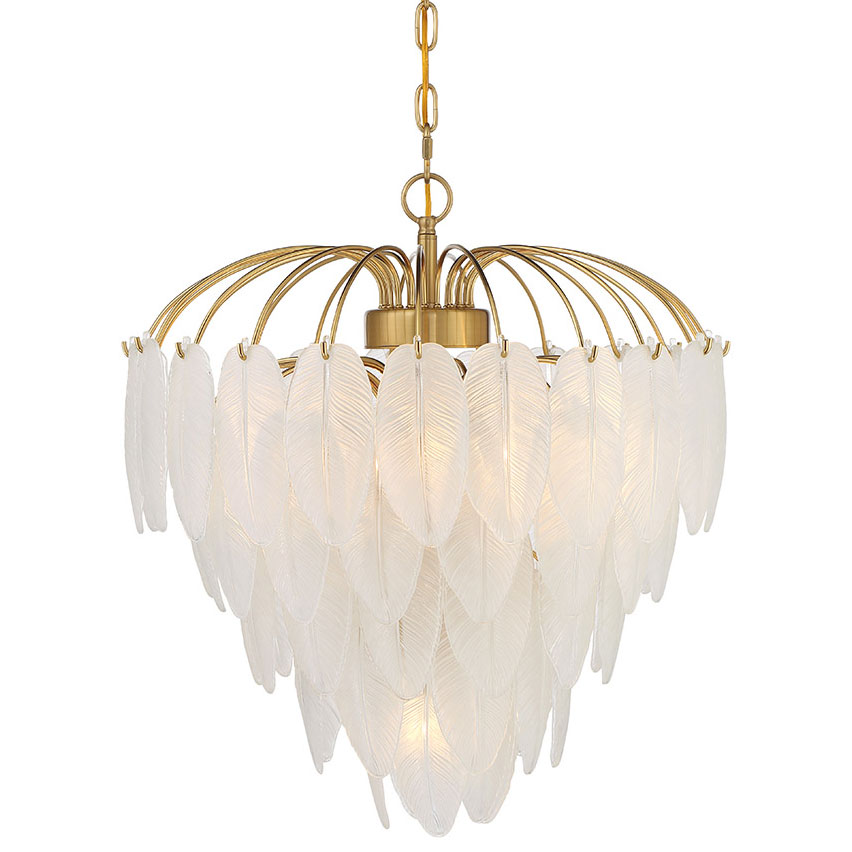 Plume is infused with luxurious Old Hollywood glamour. Frosted glass feathers cascade down in overlapping rows, creating a look that is sure to turn heads, and the Warm Brass finish. Plume is 30″ in height and 34″ in width.