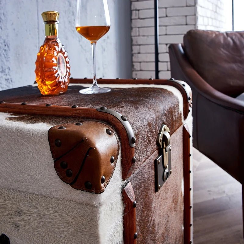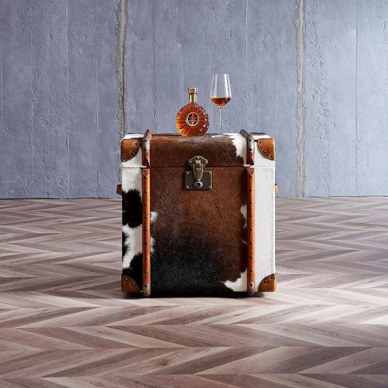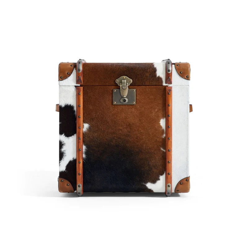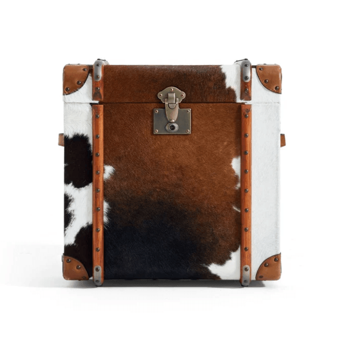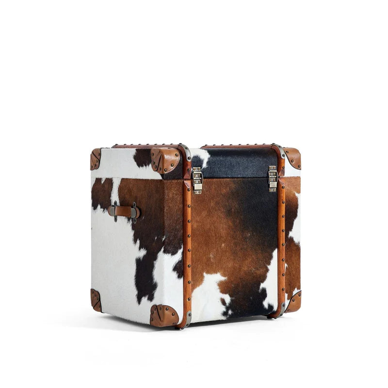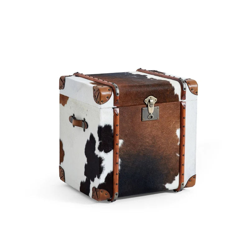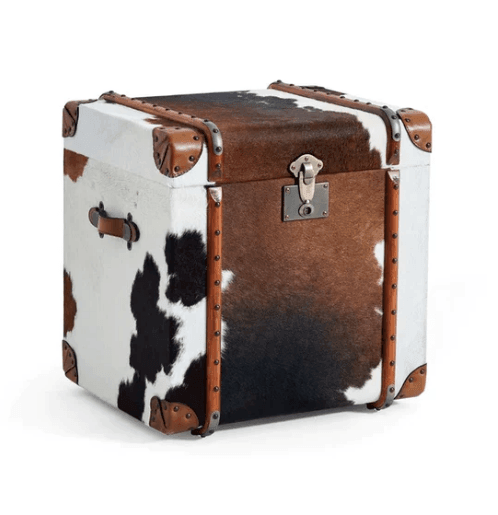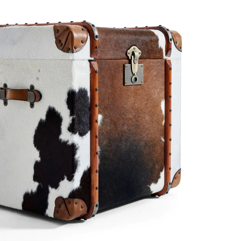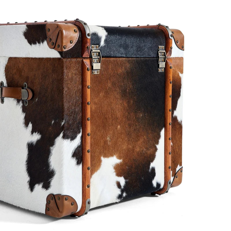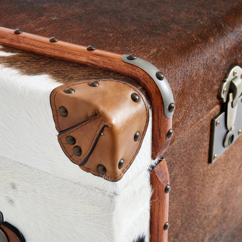 Animal print is an emerging trend for 2022 and beyond. This luxurious trunk with Brown and white cowhide leather exterior, spring locks, and brass studs, can be used for storage or as a side table. Each cowhide print is unique due to natural variations.