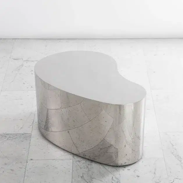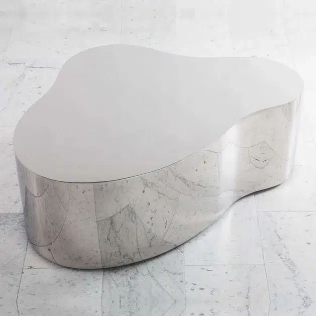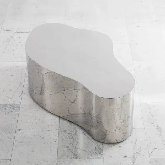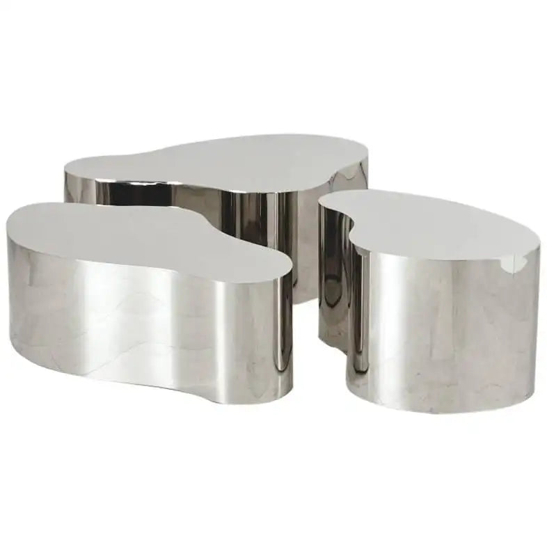 Exceptional complete set of 3 “Free Form Coffee Tables” in 304 polished stainless steel on hidden casters. Complete set in polished stainless steel. These are seamlessly welded and meticulously crafted.