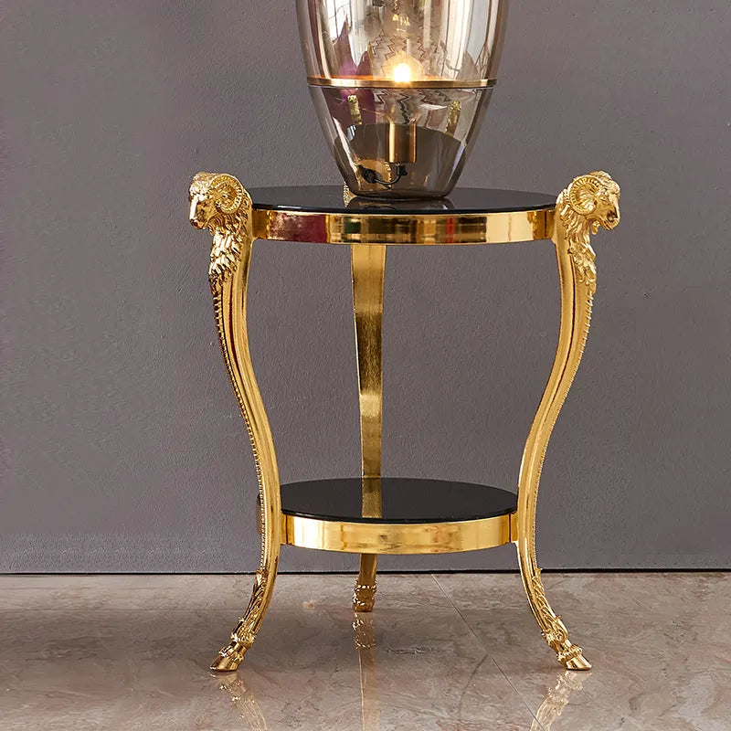 This stunning Regal Brass Ram Head Glass Sidetable features black glass top polished brass metal finish. Handcrafted by skilled artisans.