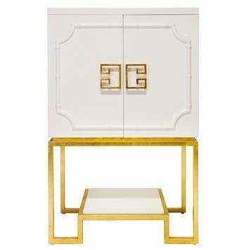 Atop a geometric gold leaf base, a white lacquer case captivates with raised bamboo detailing and gold Greek key hardware. A mirrored interior with five glass shelves delivers functional storage.