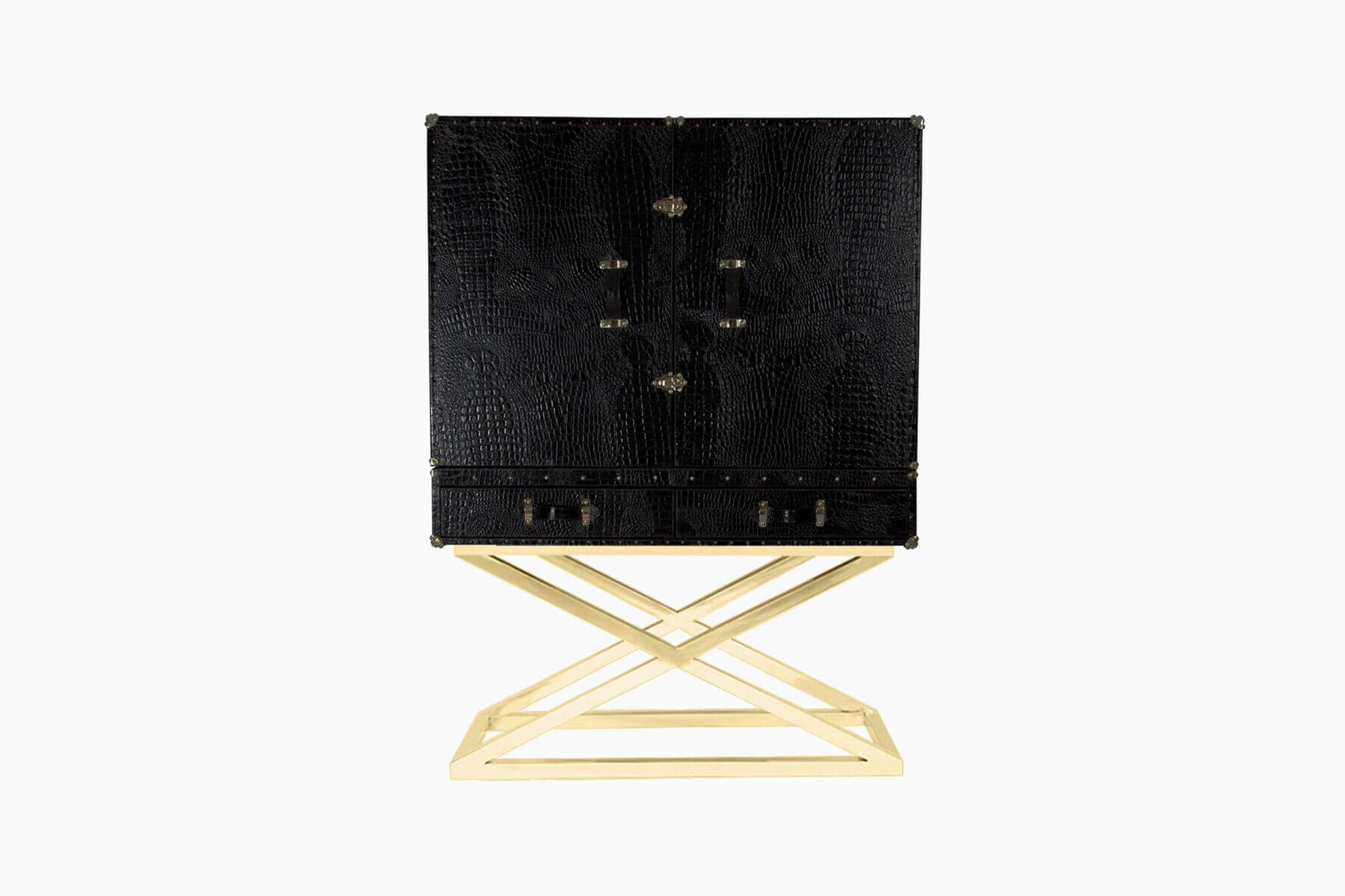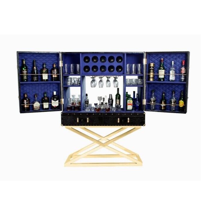 Our Designer Crocodile Leather Liquor Cabinet Range features Full Grain Black Leather with Crocodile embossed with exquisite polished gold 304 Stainless steel finishes. This wine cabinet range is a fantastic addition to your bar, lounge and personal man cave, providing you with plenty of storage for your wine, liquor and glasses while adding a luxurious enigmatic style to your home. Available in 2 different configurations, this wine cabinet is not only practical and fully functional, but it is also sure to be a wow factor when you have guests over for drinks. With its high-quality antique croc leather paired with its polished gold trim frames, this wine cabinet range is perfect for those who are looking to add classic sophistication and a touch of masculinity to their homes. Enjoy your drinks in luxury and style by adding our Regency Crocodile Leather Wine Cabinet to your home today!