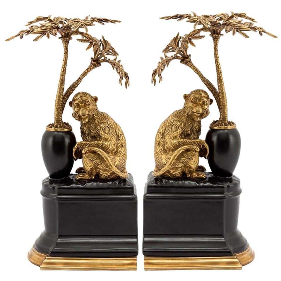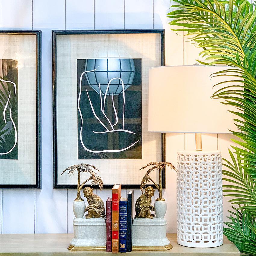 Carefully handcrafted brass monkeys and palm trees sit atop a delicate yet strong porcelain base that has been finished in a stunning black finish.