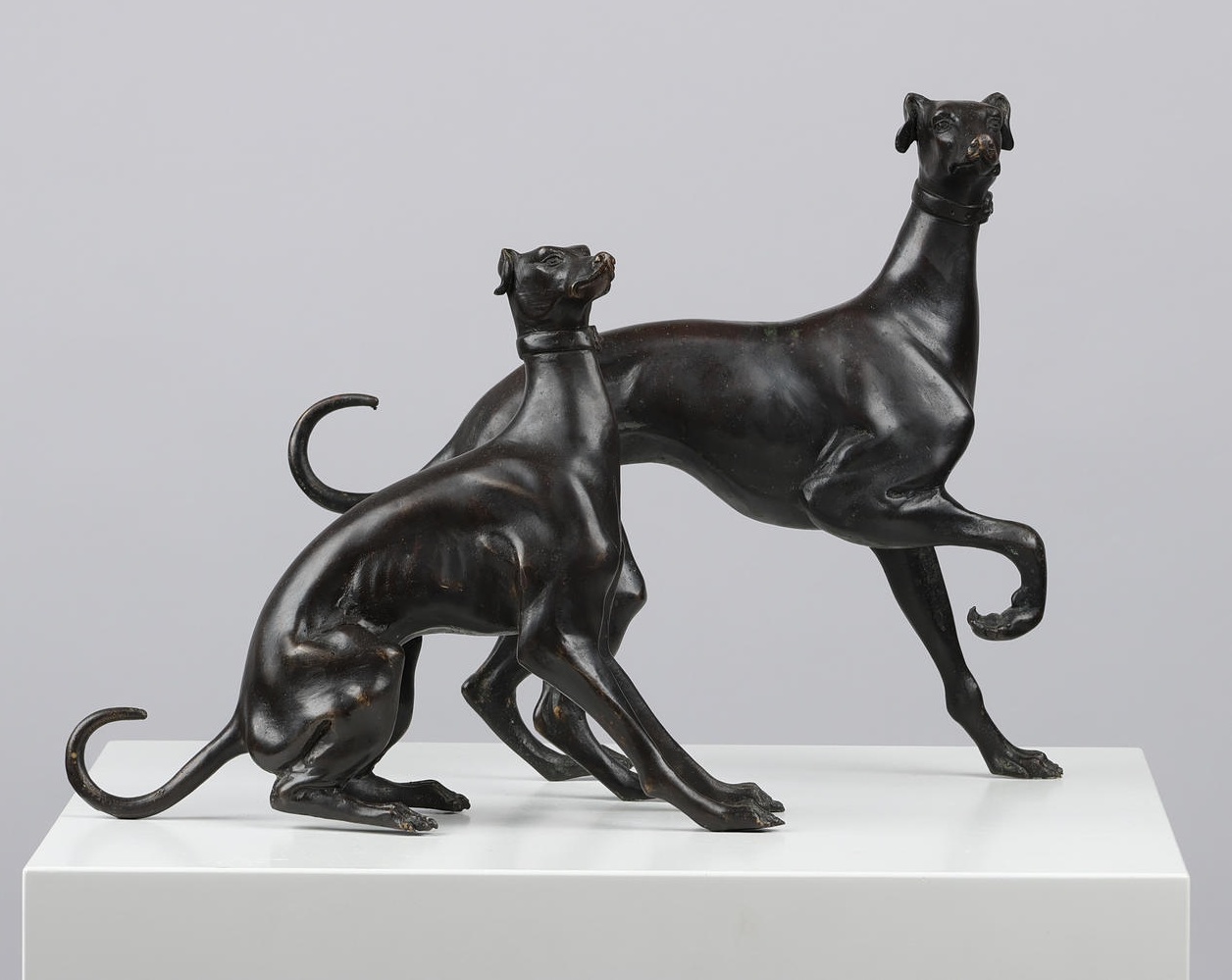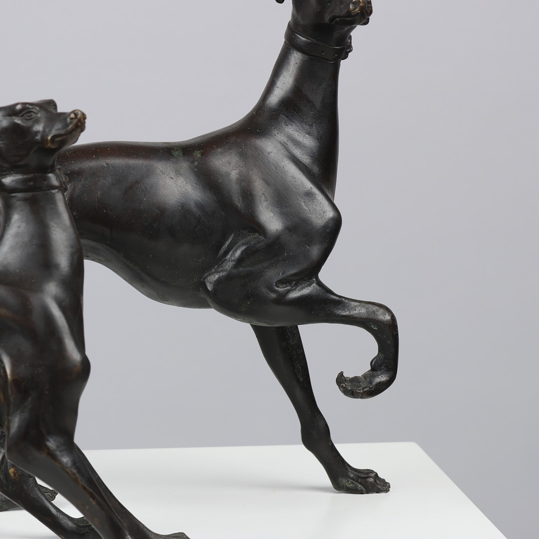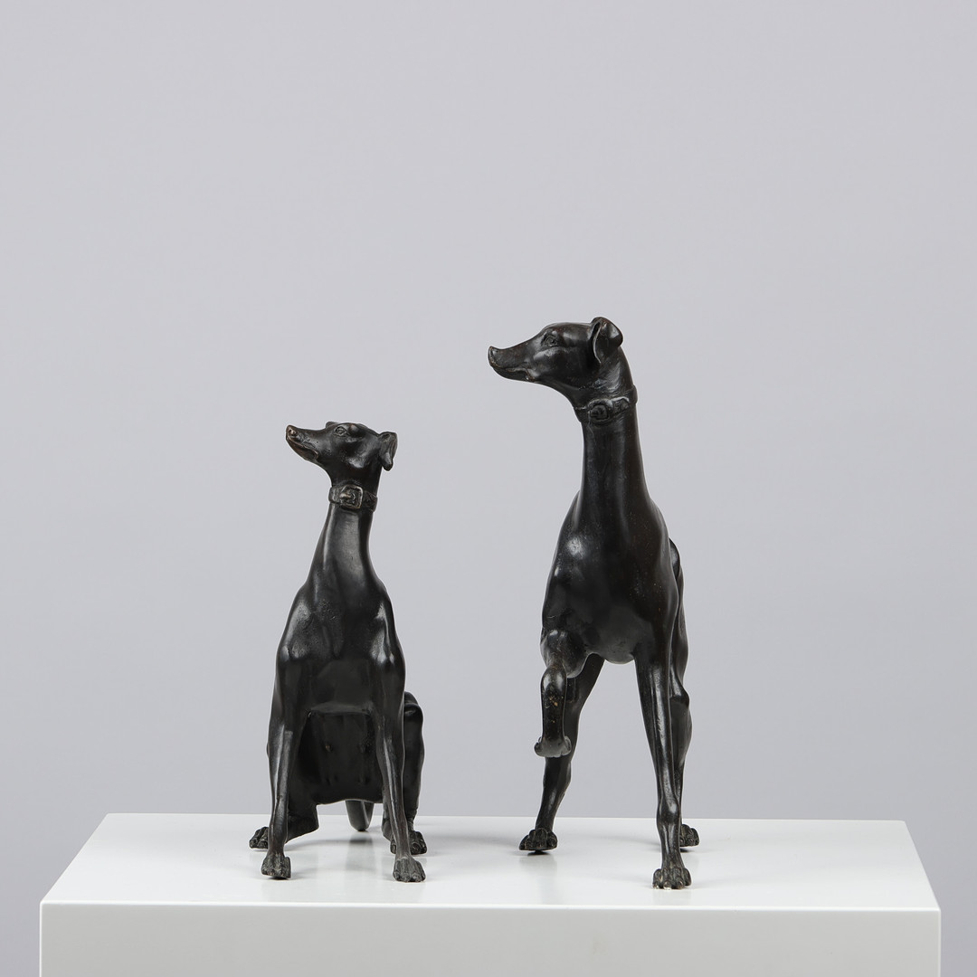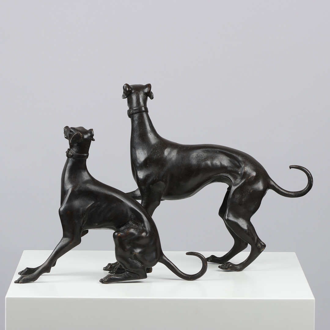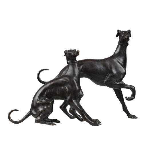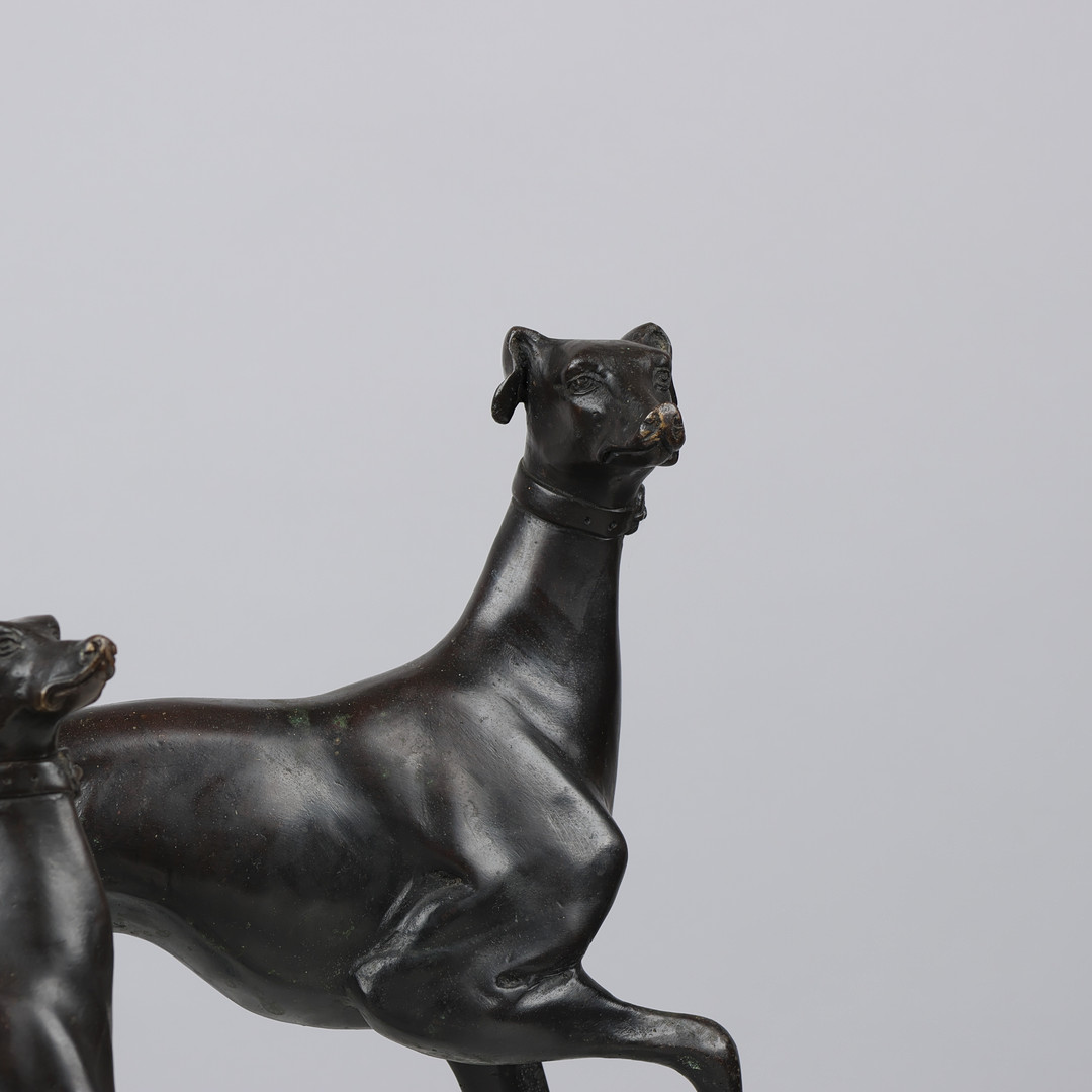Regency Italian Greyhound Bronze Patina depicting two Italian greyhounds, one female and one male.