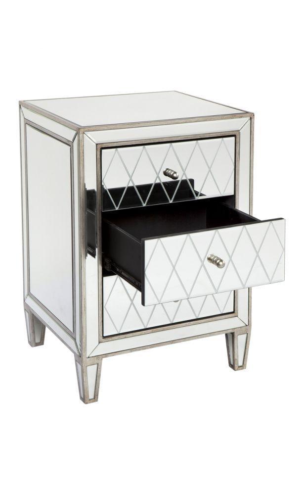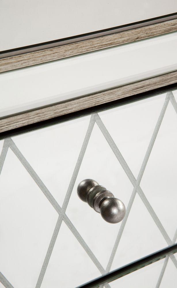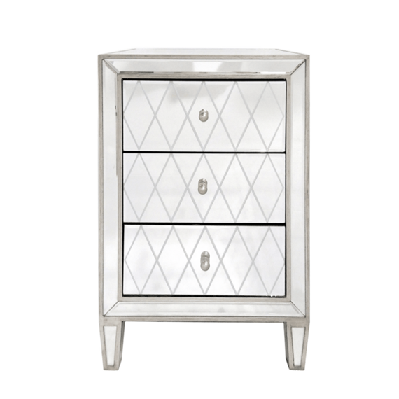Antique silver and mirror, 3 drawer bedside table with etched detail on the drawer fronts. Antique silver finished knobs. Fully Assembled.