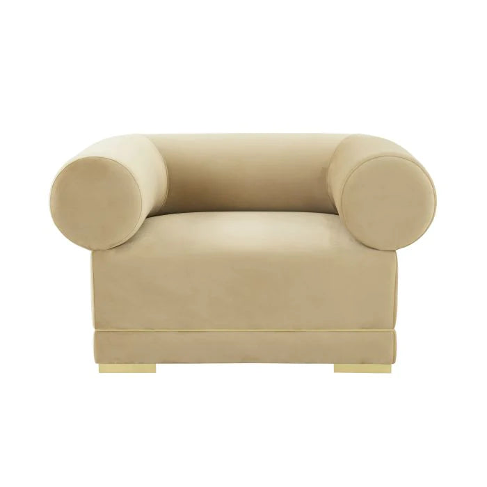 The Riccardi chair is the perfect sculptural addition to your stylish home. Featuring a soft velvet fabric with dramatic rolled arms perched upon gold legs. This chair is sure to elevate your space with a sense of chicness and extravagance.