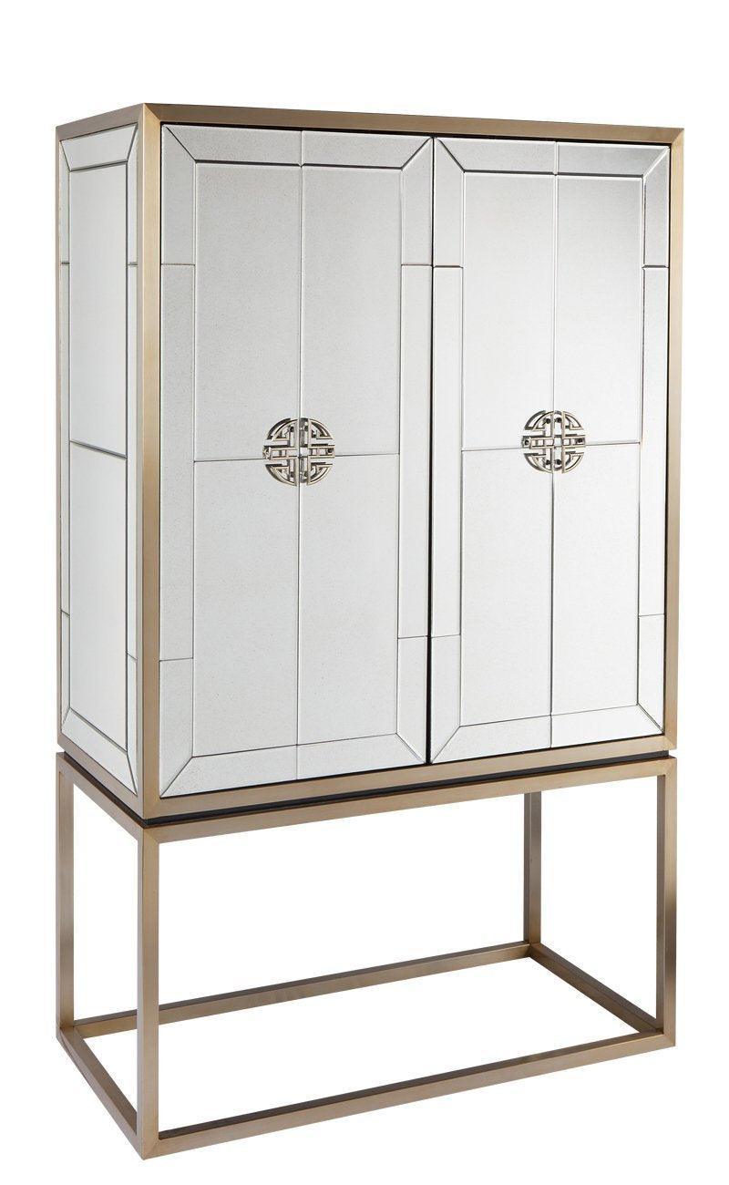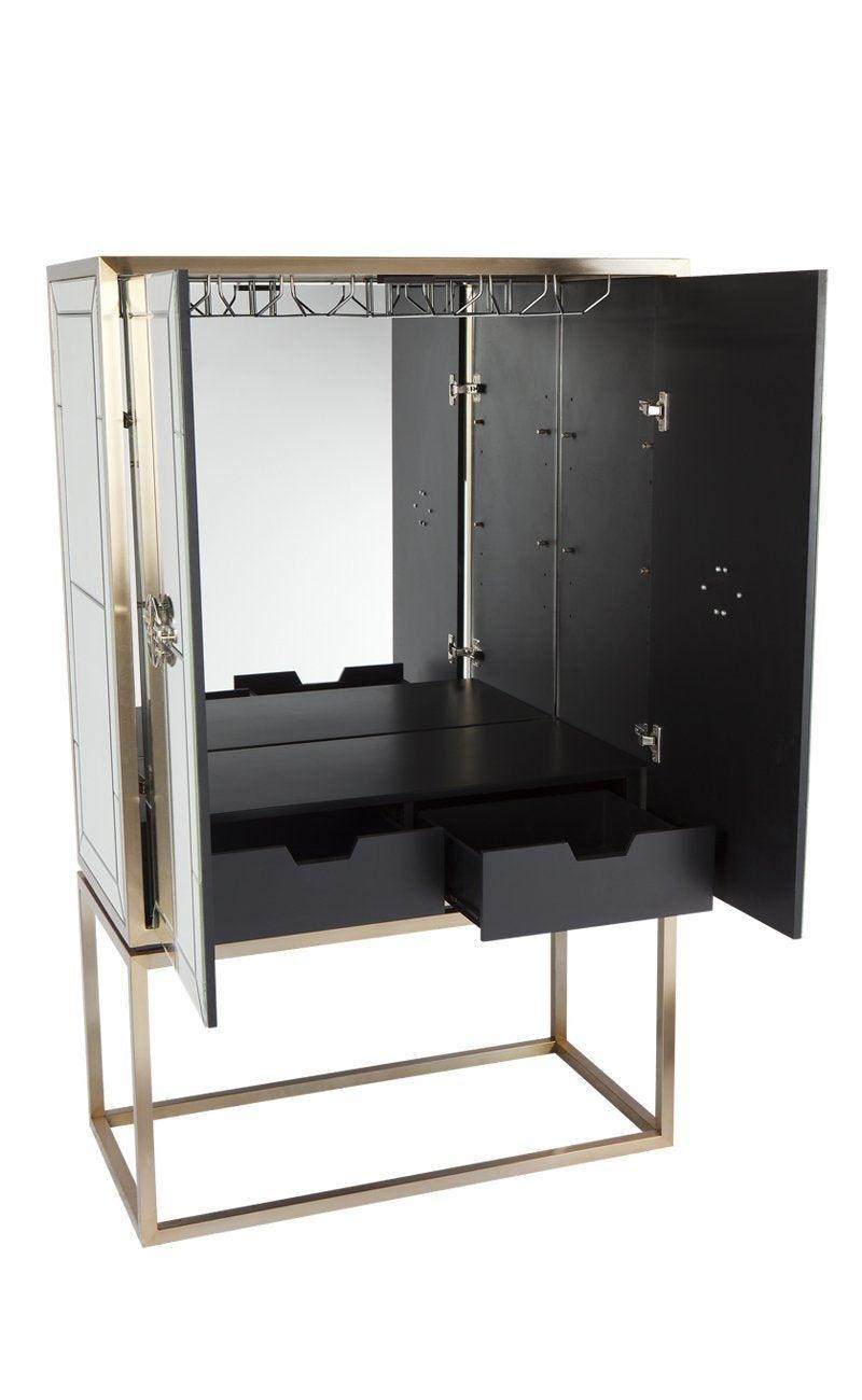 Antique mirrored drinks cabinet on an antique brass metal frame with antique brass Greek key handles. Inside is painted black with a bevelled mirror backing. Includes two adjustable glass shelves, two drawers and glass racks. Some assembly is Required