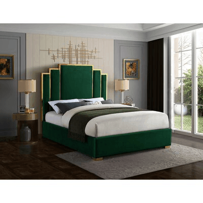 The Rochester Collection is Elegant and eye-catching, the stunning oversized handcrafted Gold Frame exudes elegance into any space and evokes old world Hollywood Glamour. The velvet Commercial velvet Rochester upholstered Bed is the perfect addition to any space. This luxurious velvet upholstered  design features plush oversized channel headboard in beautiful thick plush commercial velvet fabric with deep channel tufted design for added comfort. This stunning collection features bespoke polished gold metal hardware which exudes class into any space. The Rochester Collection features luxurious matching footboard design to enhance this Art deco Classic.