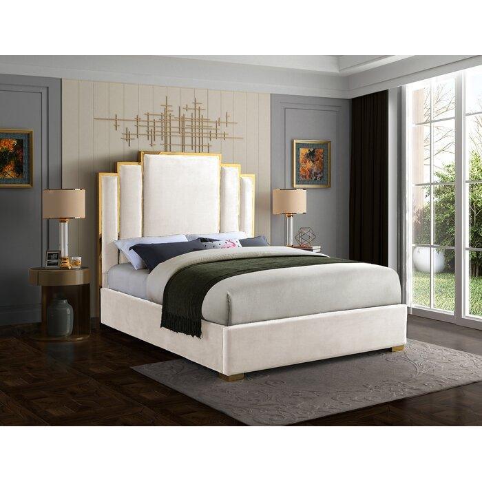 The Rochester Collection is Elegant and eye-catching, the stunning oversized handcrafted Gold Frame exudes elegance into any space and evokes old world Hollywood Glamour. The Rochester upholstered Bed is the perfect addition to any space. This luxurious velvet upholstered design features plush oversized channel headboard in beautiful thick plush commercial velvet fabric with deep channel tufted design for added comfort. This stunning collection features bespoke polished gold metal hardware which exudes class into any space.