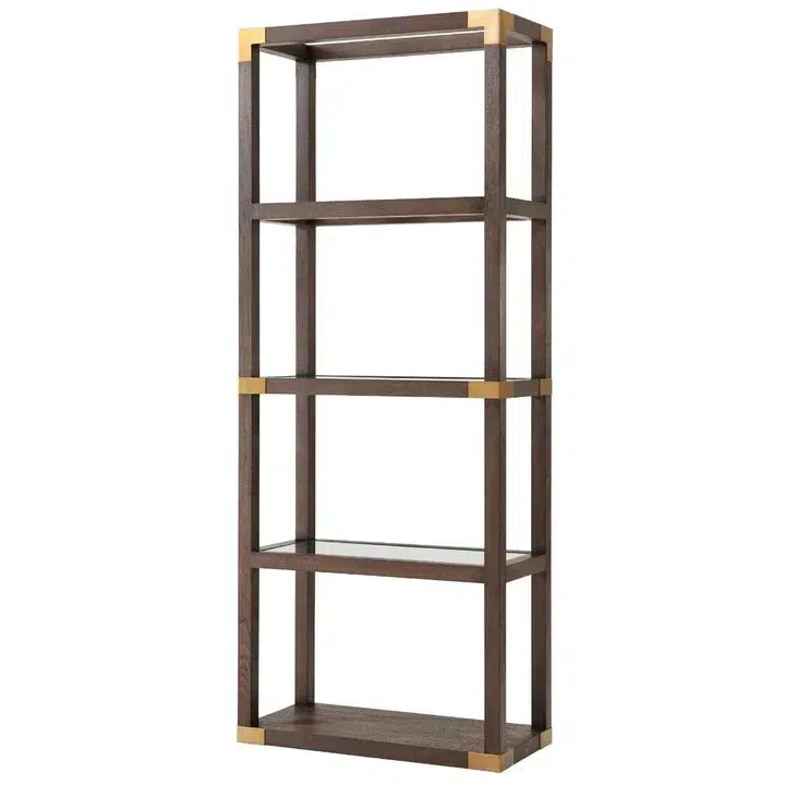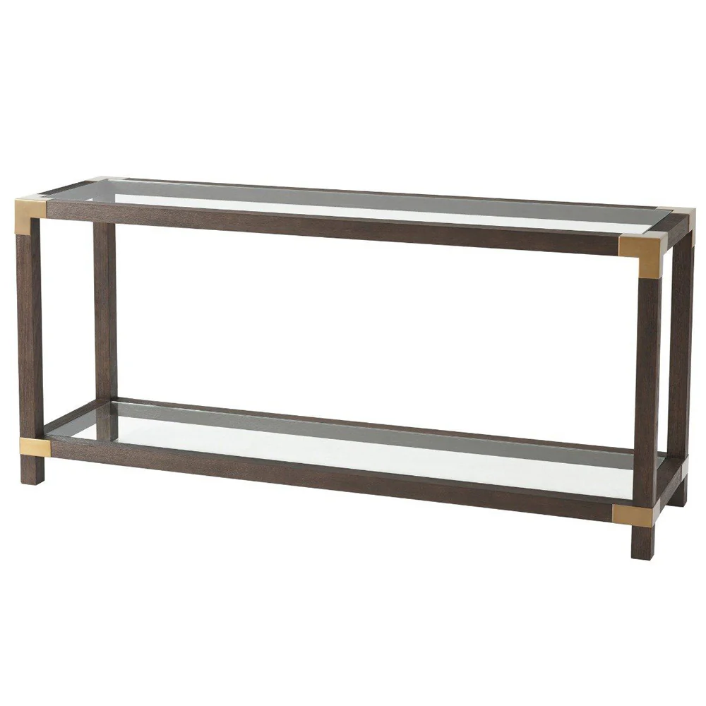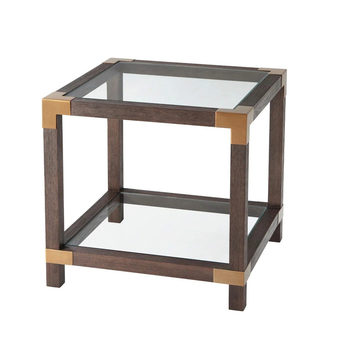 Royalton Solid Brown oak and brushed brass side table with clear glass top and shelf