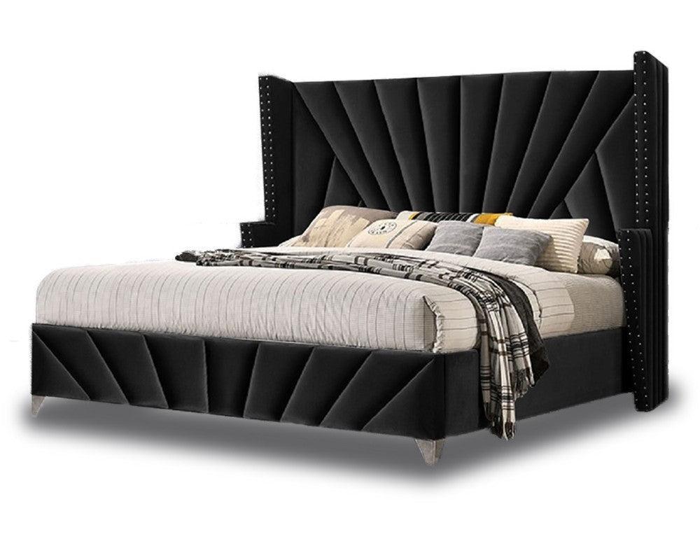 Savoy Art Deco Black Velvet Channel King Bed. The Savoy Art Deco Bed is an opulent addition to any space. Wrapped in luxurious velvet, this grand King size bed features an elegant silver studded design and classic wing headboard. It is expertly crafted with a solid wood and metal base, ensuring years of comfort and style. Transform your bedroom with this timeless masterpiece.