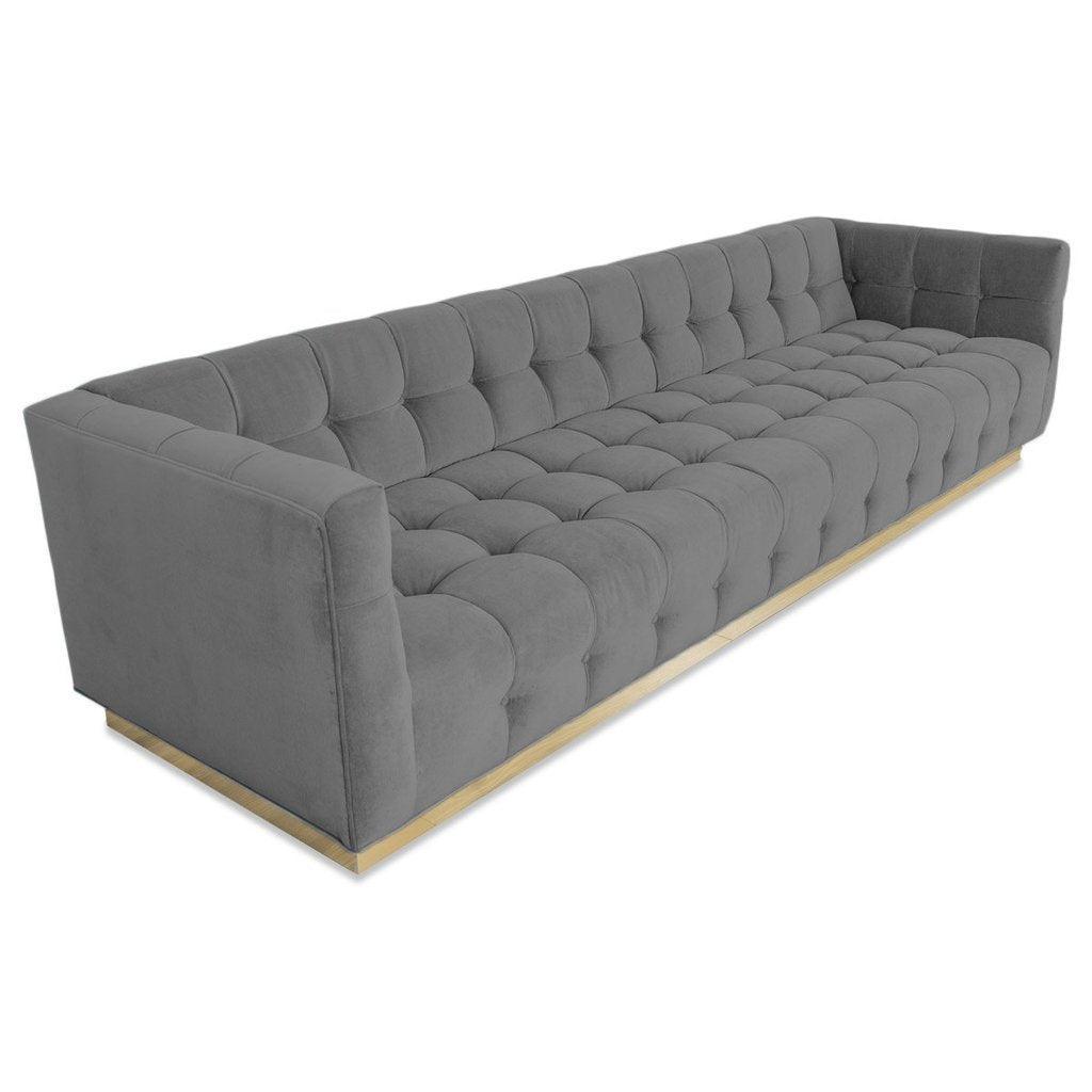 Instantly create a sense of drama and luxury in any room with the stylish Savoy Sofa in Velvet. This handcrafted sofa features a Polished brass toe kick base and delicately folded biscuit tufting with pulled buttons in soft Velvet