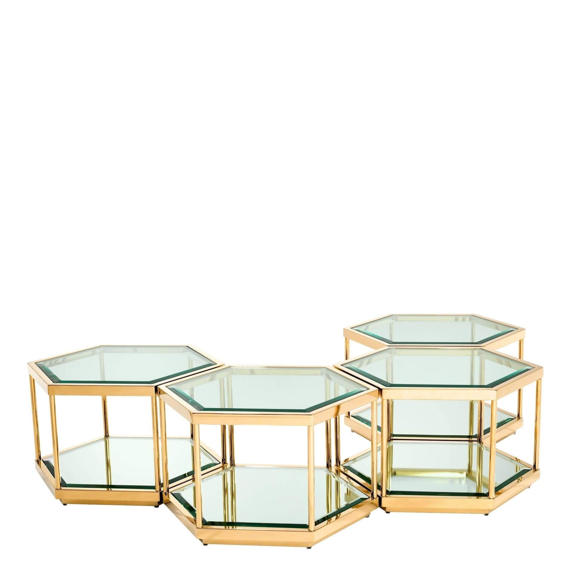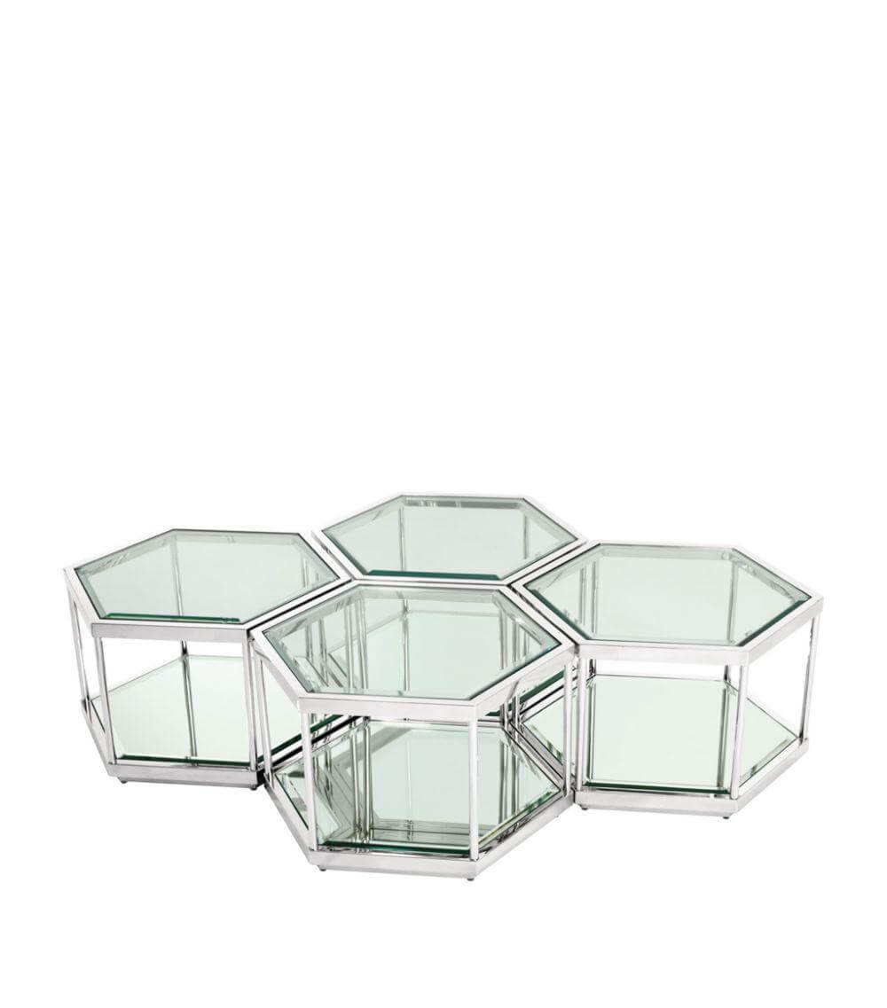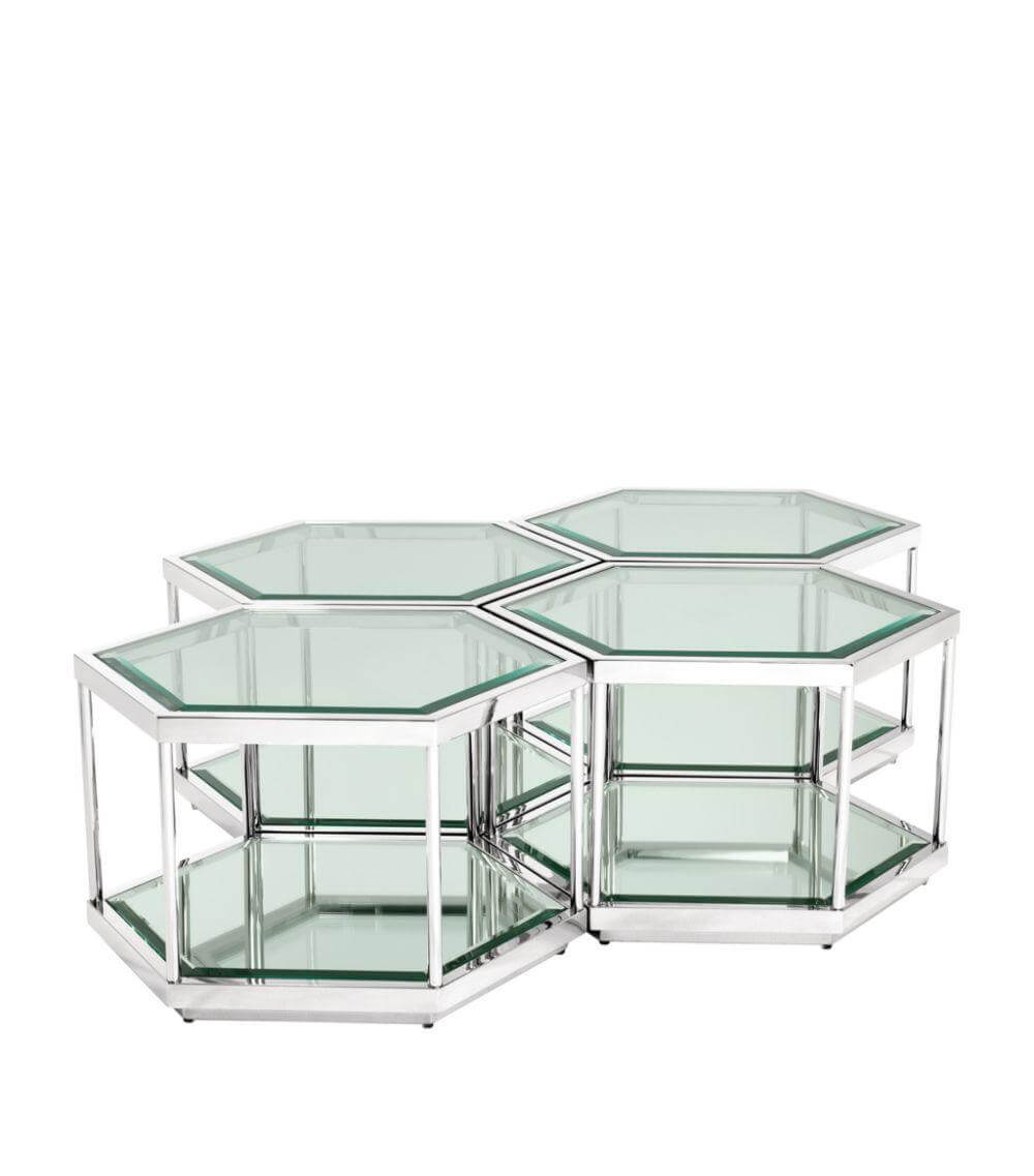 Inspired by the structure of a honeycomb, this alluring set of 4 hexagonal Saxon Coffee Tables makes your living room the place to be. Each table features a chrome or gold finished frame and a clear glass top and lower shelf. Put all tables together to create one large centerpiece, divide them…