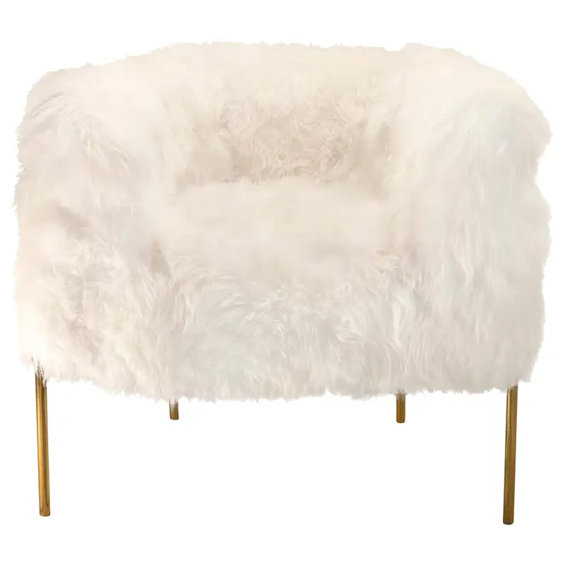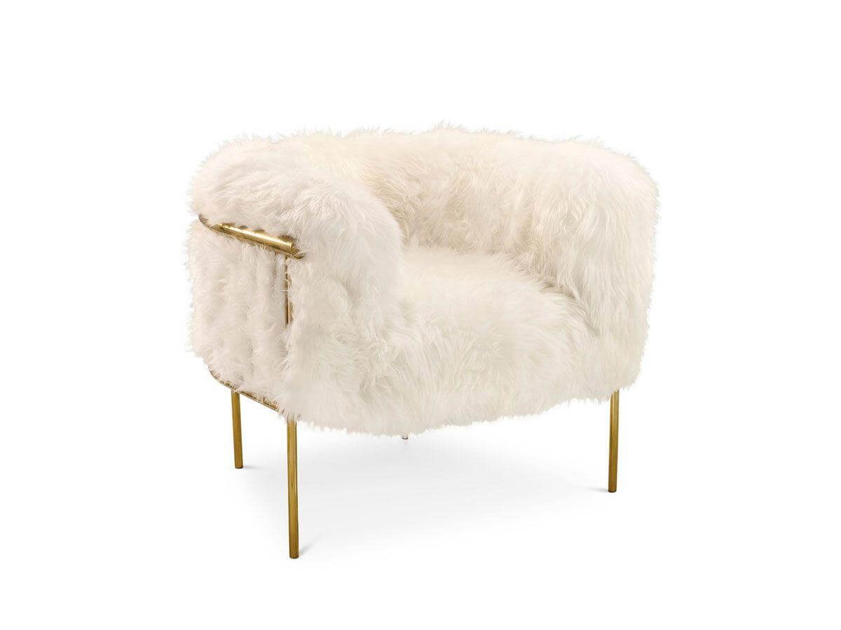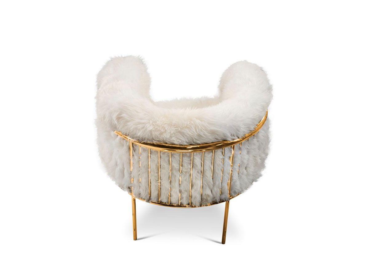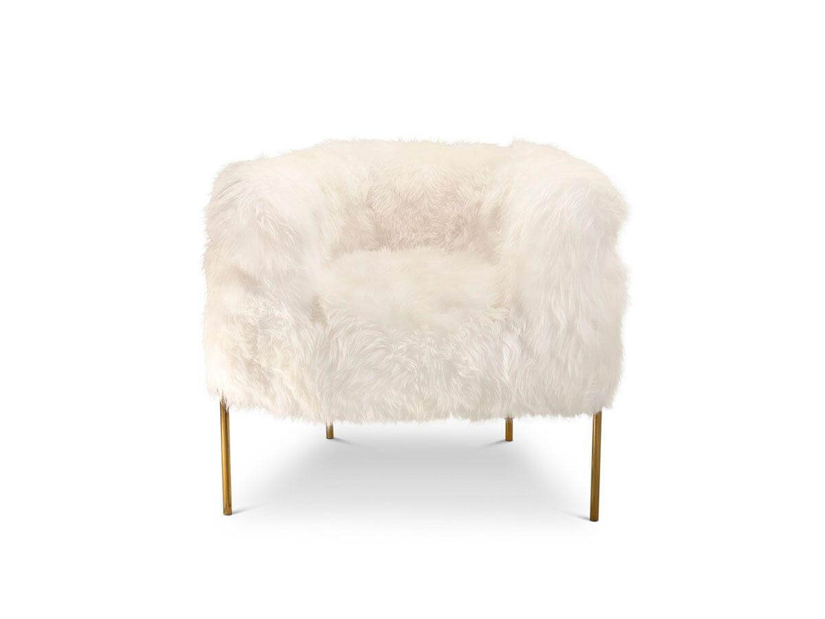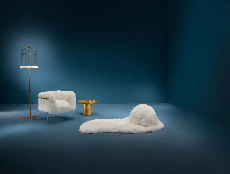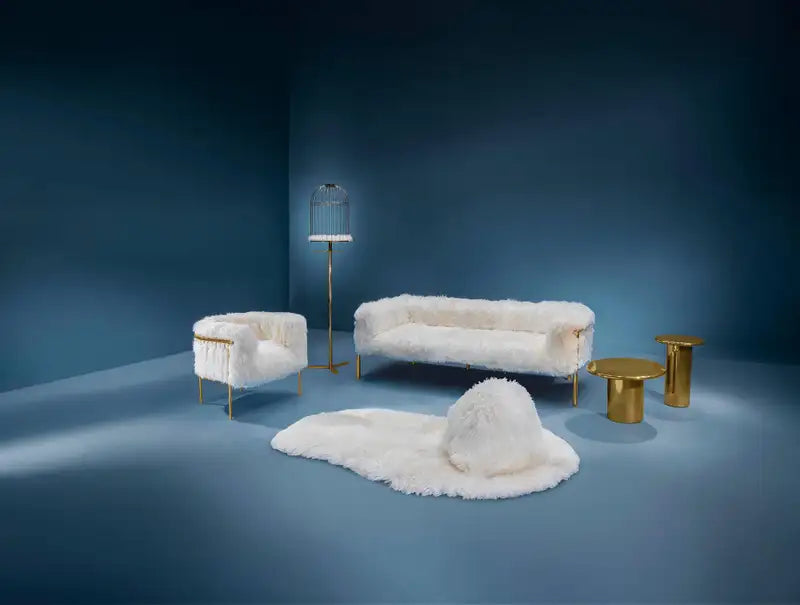 The Scarlett armchair is a comfortable seat with a soft white sheepskin upholstery and a golden metal structure. Designed by Avant Garde Furniture. The Scarlett armchair features a comfortable design like a warm embrace. AVANT GARDE has designed a collection of soft wavy sheepskin furniture and rugs held together by gold frames. Snow White is a luxurious collection that will amaze you! The Scarlett armchair is suitable for your living rooms with a sophisticated and unconventional style. We advise you to try it together with the Scarlett coffee table.