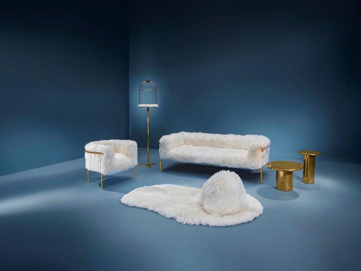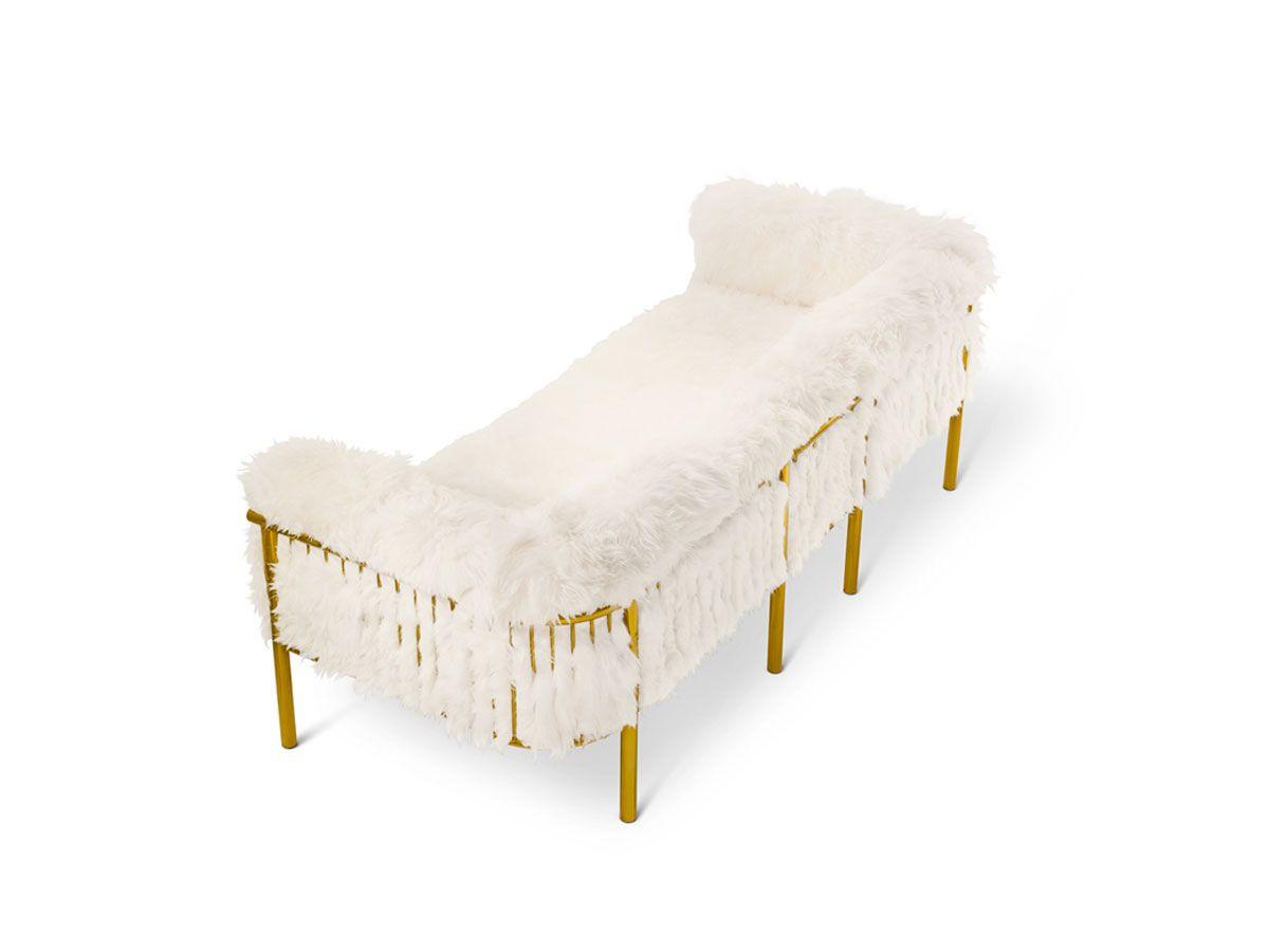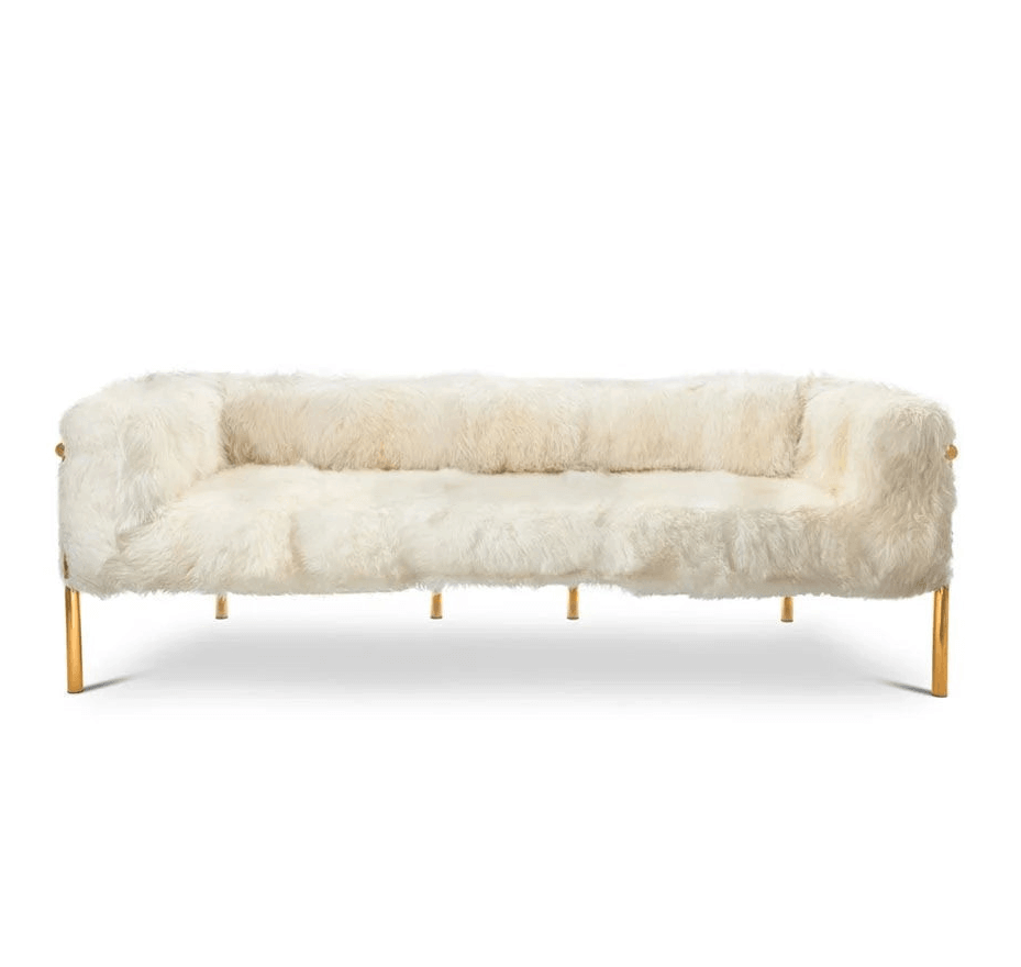Scarlett three seater sofa features a comfortable design with soft white sheepskin upholstery and golden metal frame. Scarlett sofa features a comfortable design like a warm embrace. Avant Garde Furniture Studio has designed a collection of soft wavy sheepskin furniture and rugs held together by gold frames. Snow White is a luxurious collection that will amaze you! The Scarlett sofa is suitable for your living rooms with a sophisticated and unconventional style. We advise you to try it together with the Scarlett coffee table and armchair from the same collection.