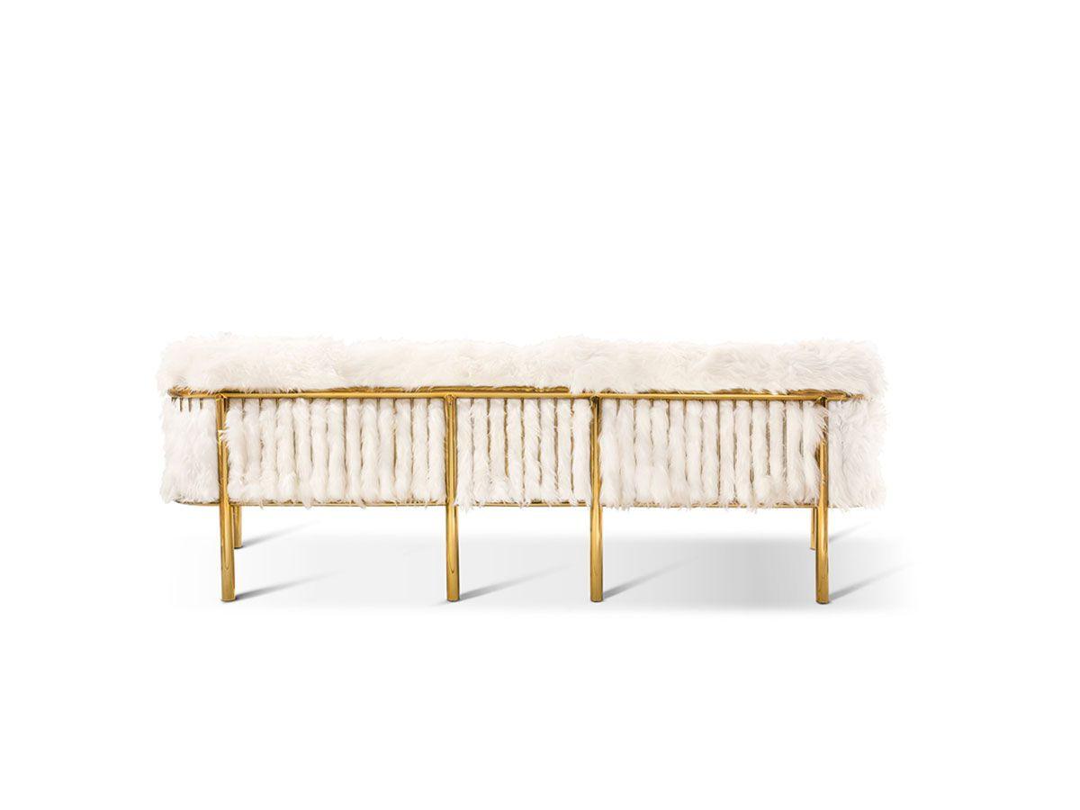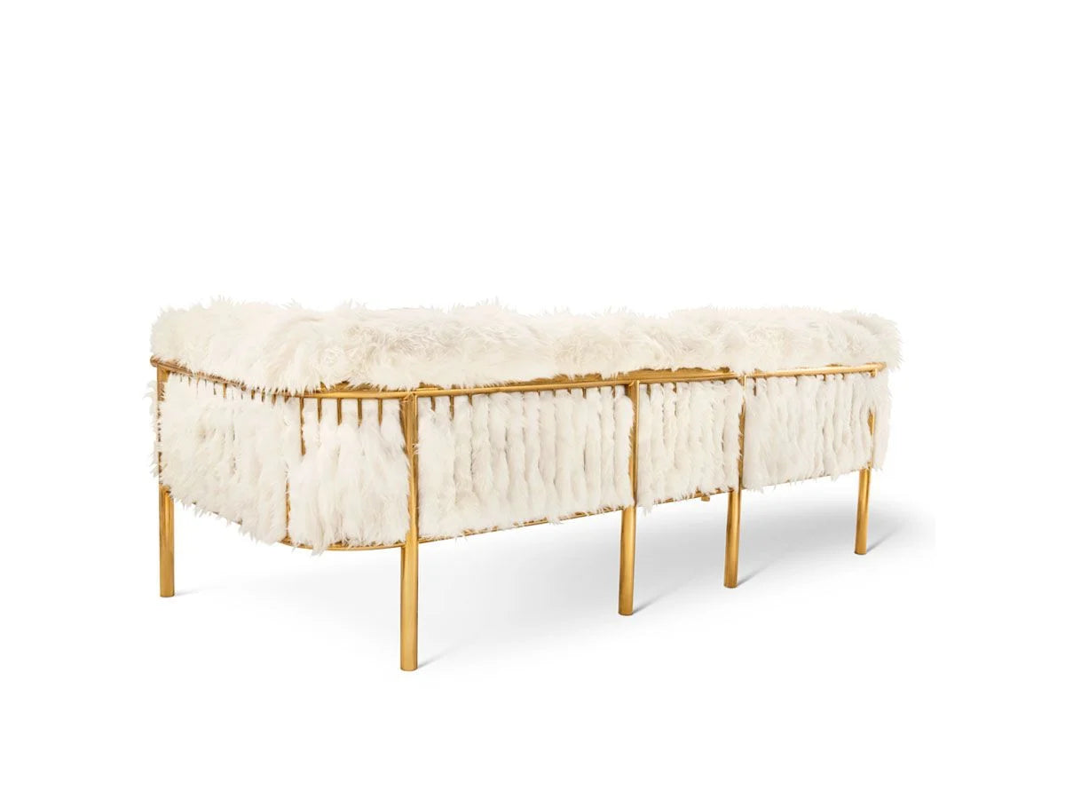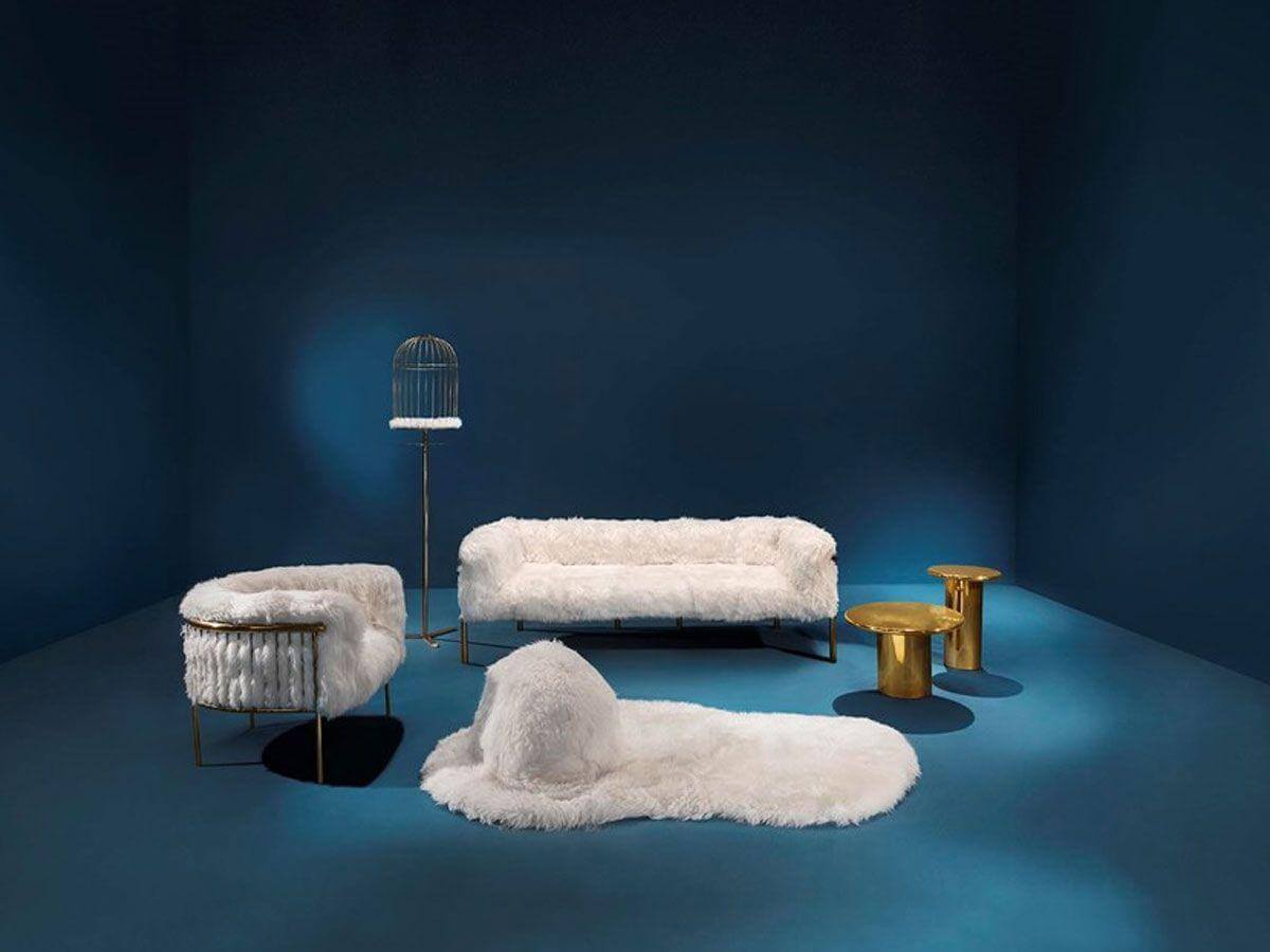 Scarlett three seater sofa features a comfortable design with soft white sheepskin upholstery and golden metal frame. Scarlett sofa features a comfortable design like a warm embrace. Avant Garde Furniture Studio has designed a collection of soft wavy sheepskin furniture and rugs held together by gold frames. Snow White is a luxurious collection that will amaze you! The Scarlett sofa is suitable for your living rooms with a sophisticated and unconventional style. We advise you to try it together with the Scarlett coffee table and armchair from the same collection.