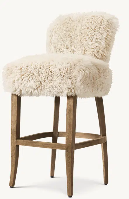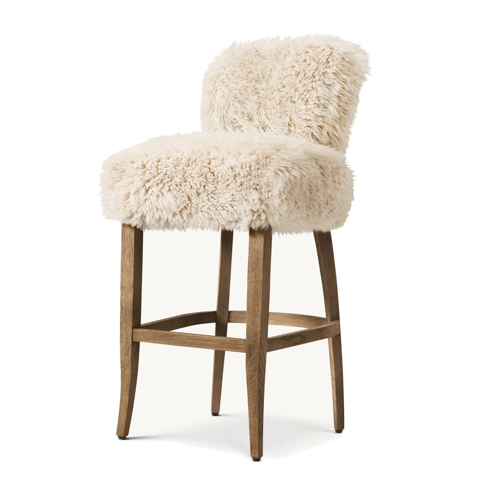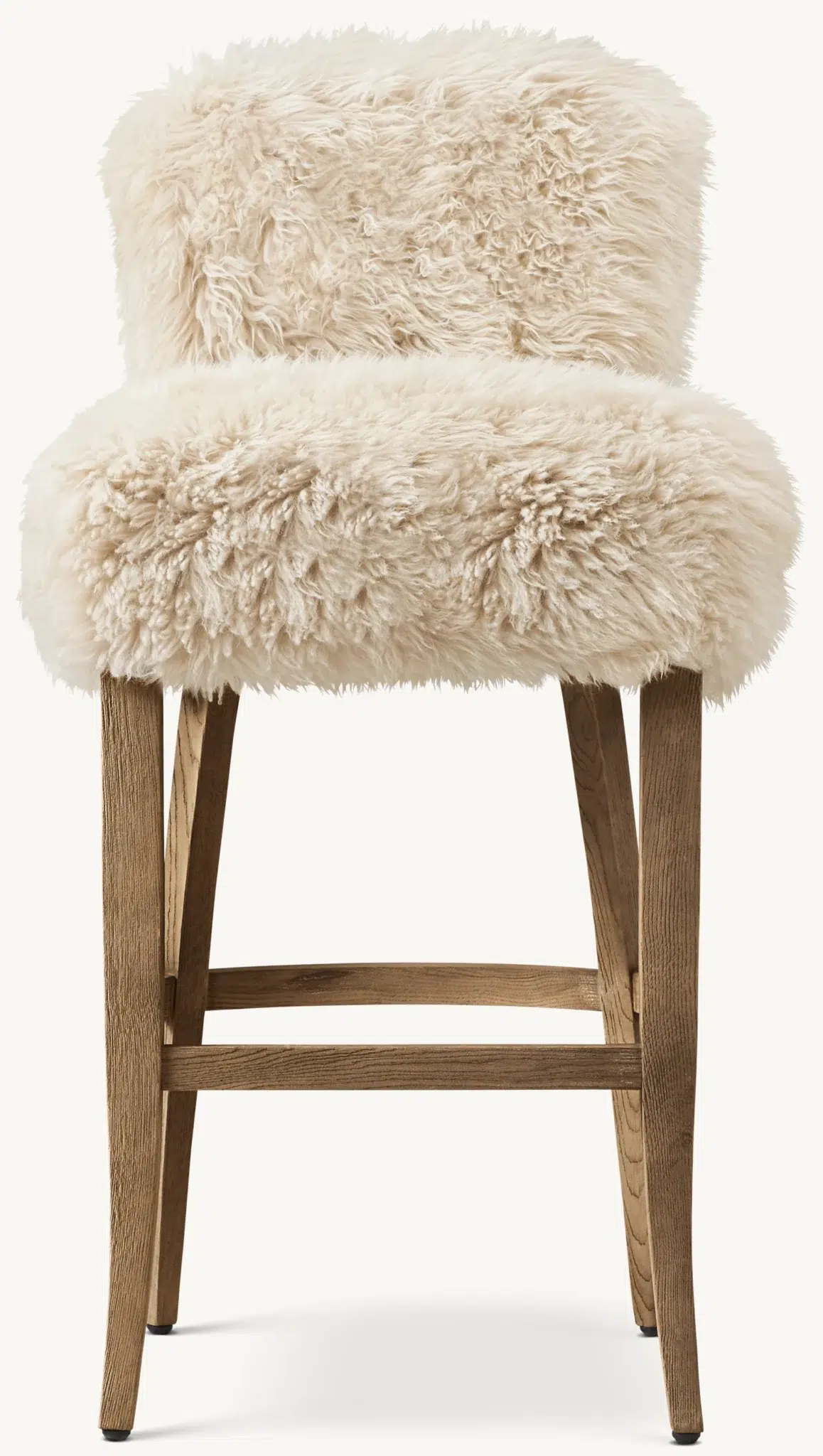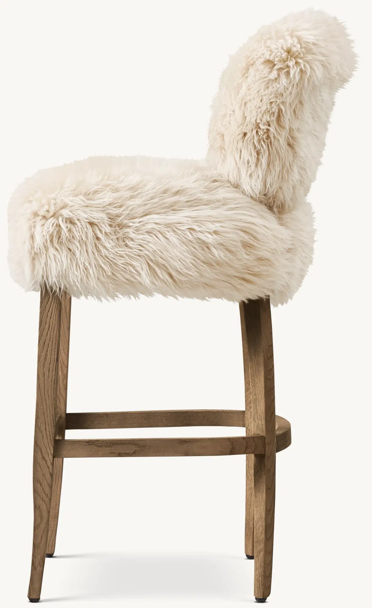 Our reproduction of a classic 1940s French dining chair cossets in comfort with its gently flared back and padded seat, both upholstered in luxe, long-haired New Zealand sheepskin. The clean-lined frame and tapered saber legs are crafted of solid oak.
