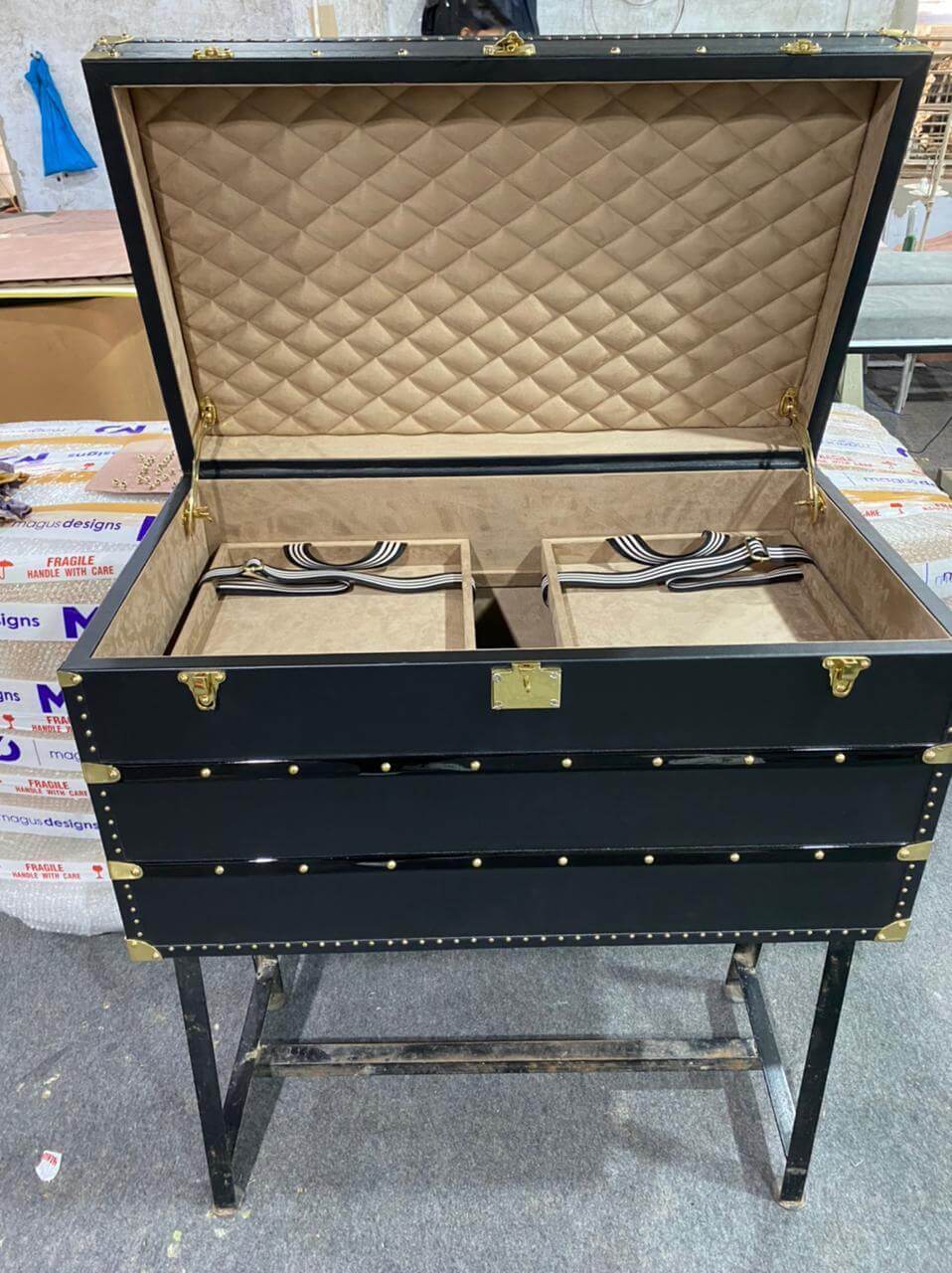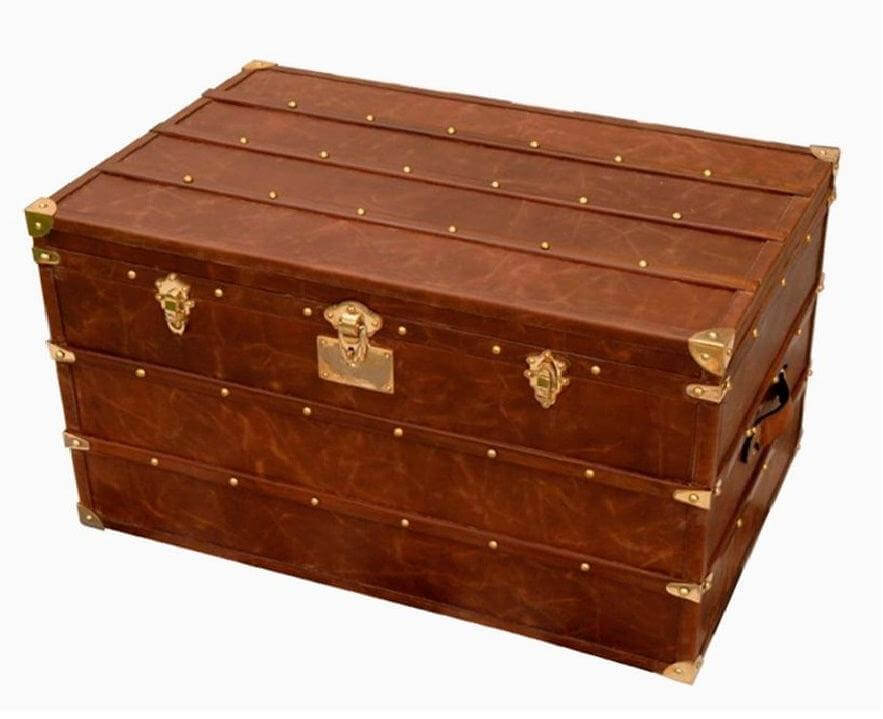 Seville Black Genuine Leather Brass Trunk 93cm. A Coffee Table Storage Trunk? What more could you ask for? Class, Style, functionality! This trunk has it all. Evoking the old world charm of long passage and romantic trunk luggage with modern sophistication, the Seville has been transformed into a functional furniture item, while preserving all the hallmarks of traditional craftsmanship in its construction and detail. Place at the end if your bed for storage, in the living room to store precious items, or as a coffee table.