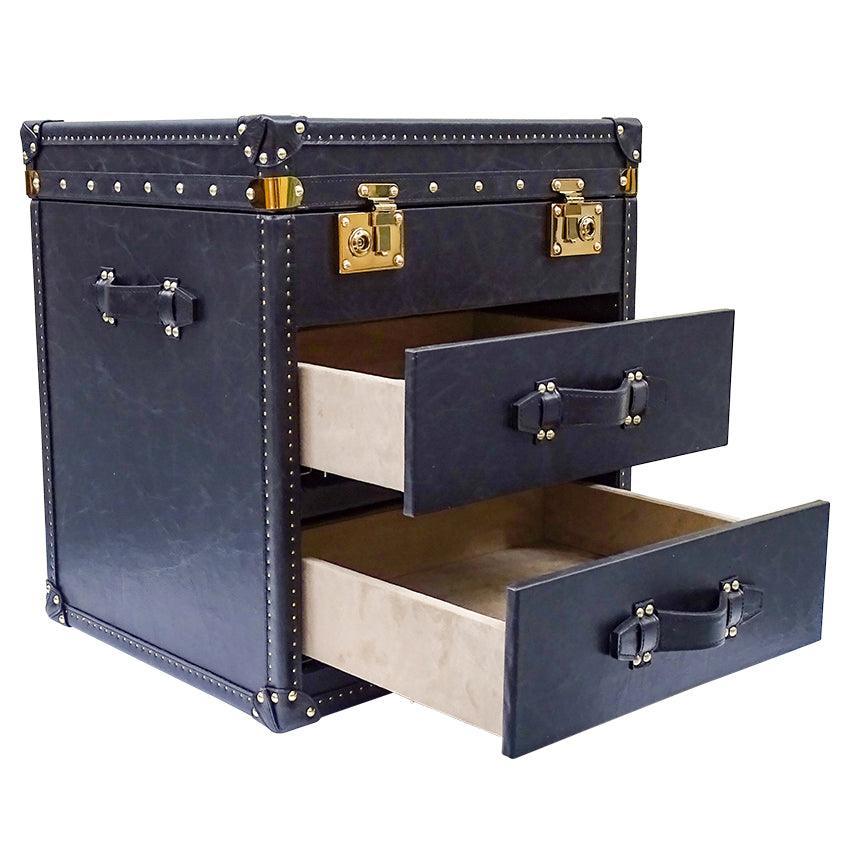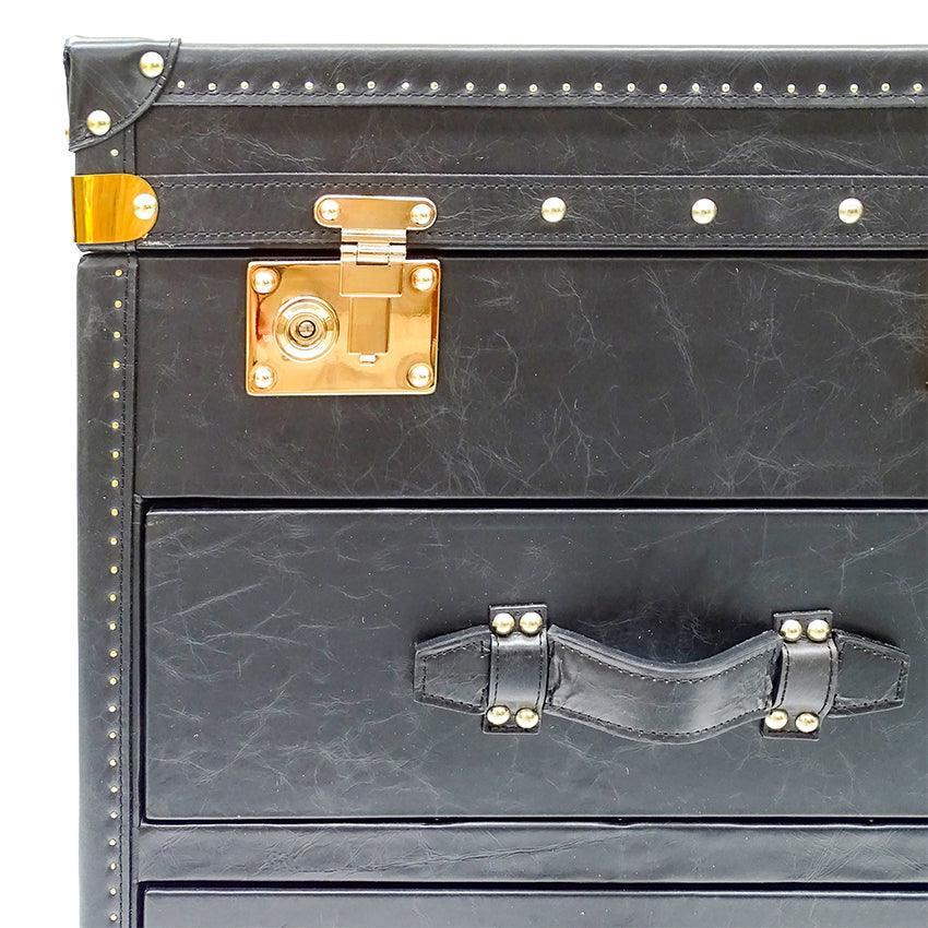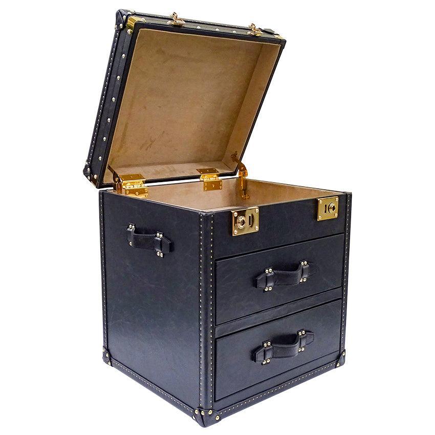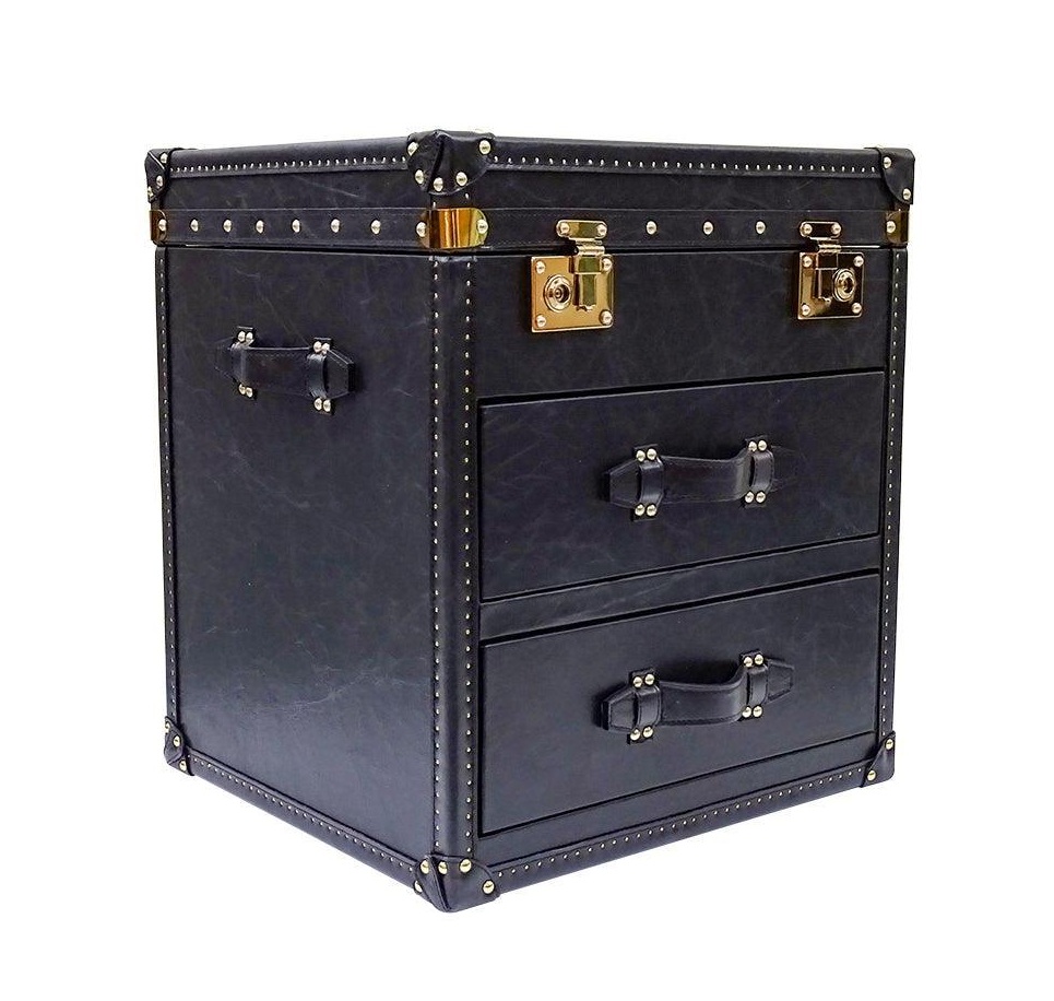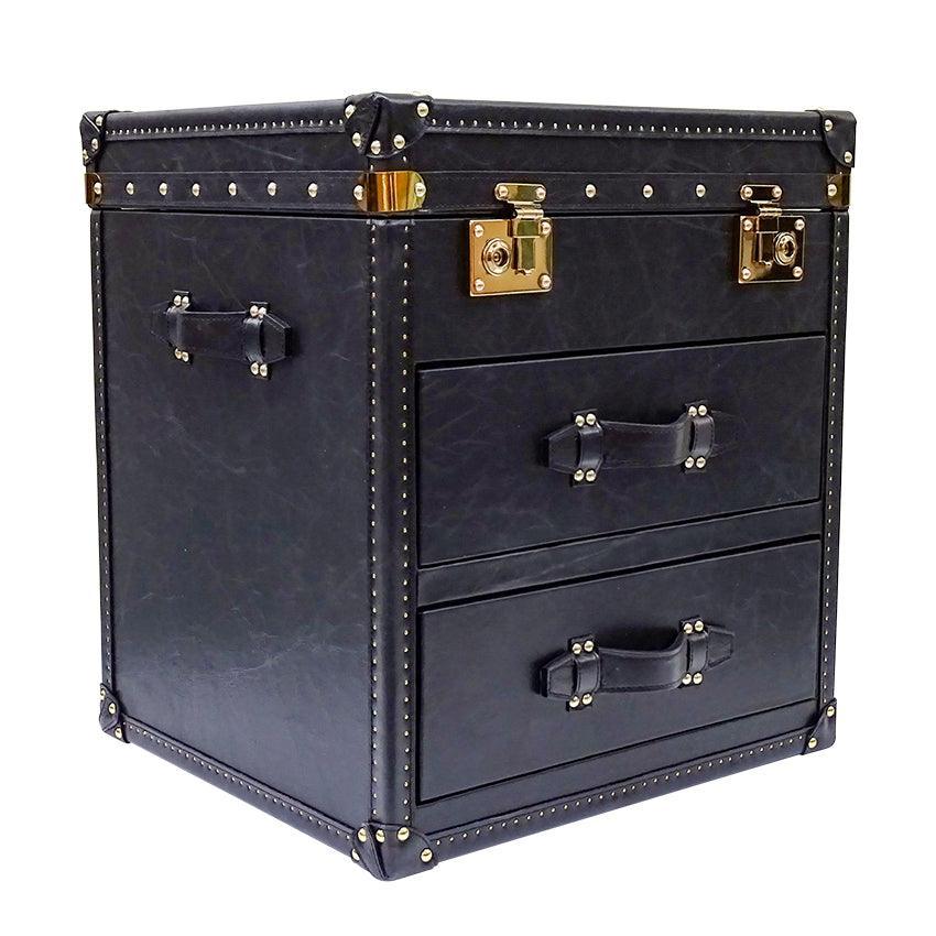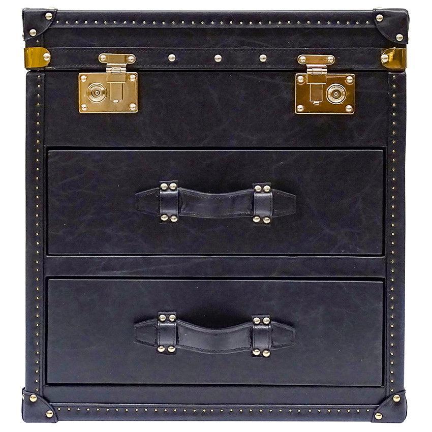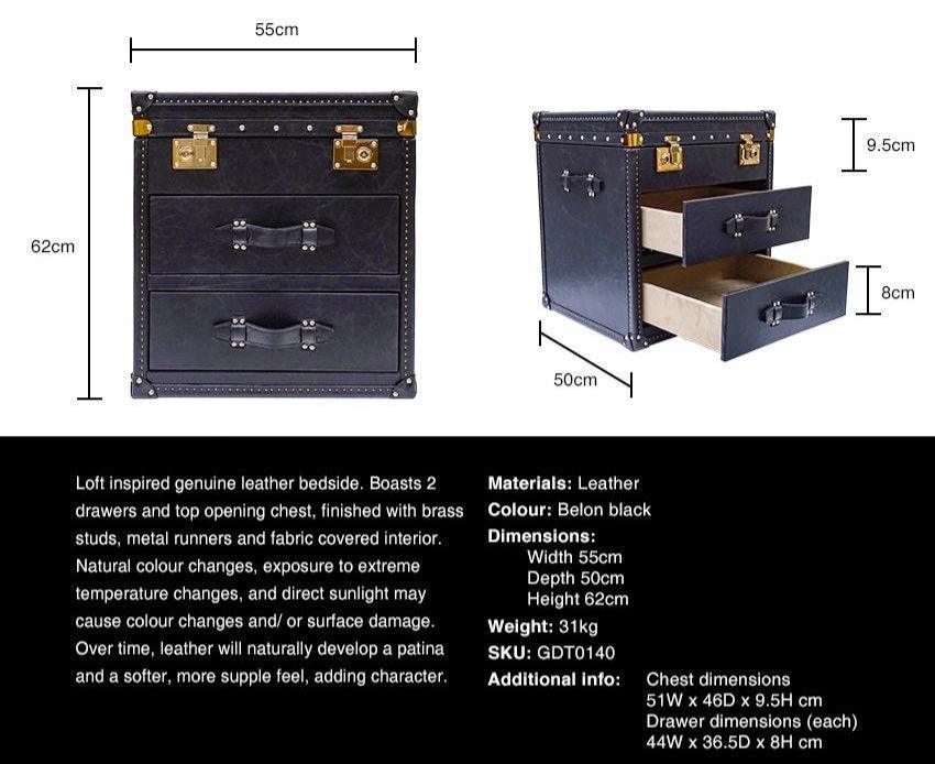 Seville Black Genuine Leather Trunk Bedside Table. Loft inspired genuine leather trunk bedside table. Boasts two drawers and top opening chest, finished with brass studs, metal runners and fabric covered interior.