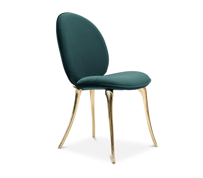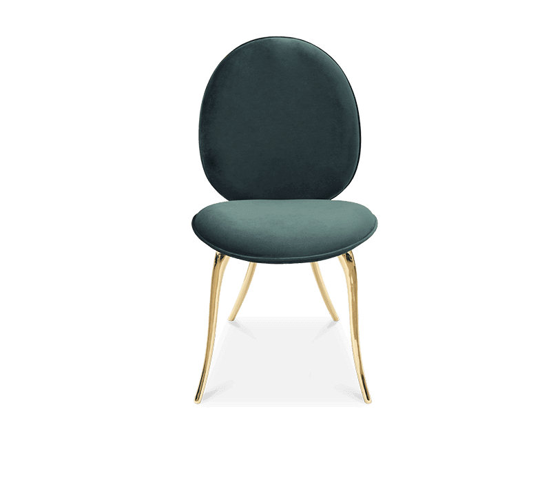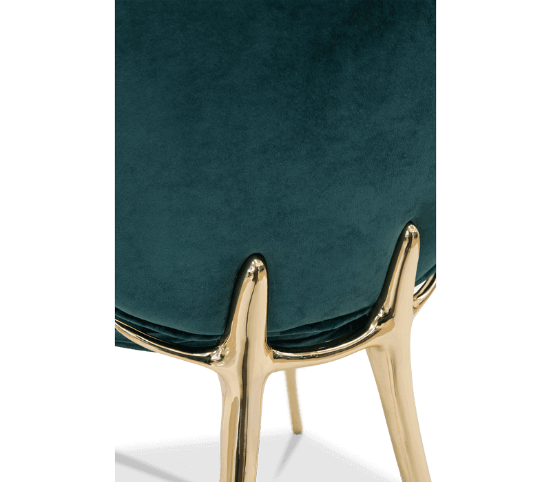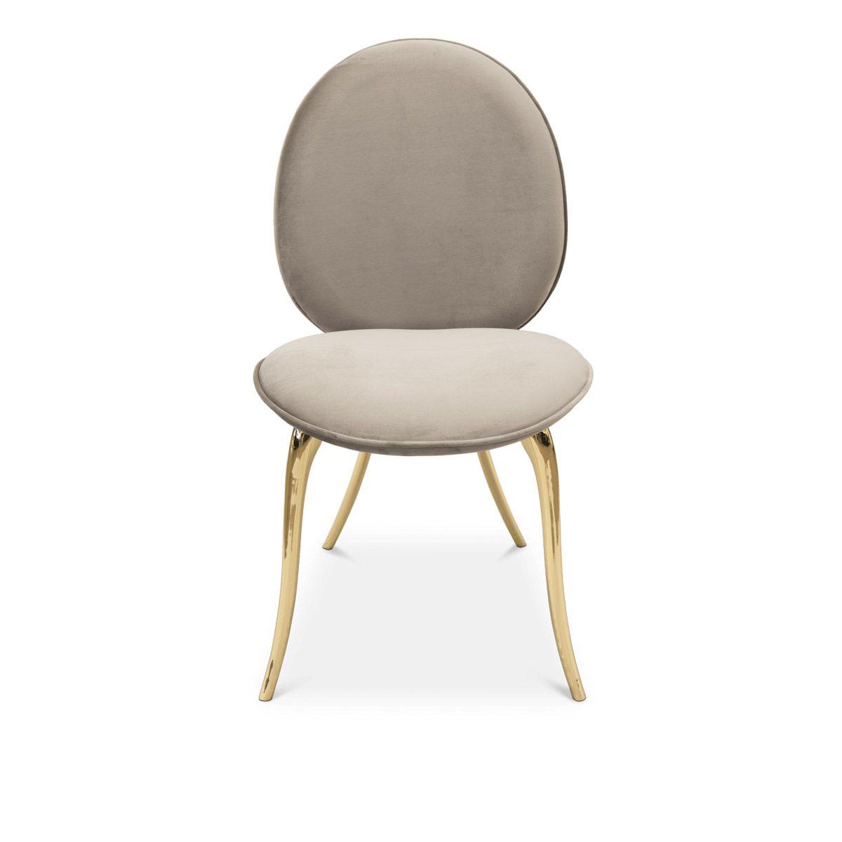 Soleil modern chair is a synthesis of styles and senses. Inspired by the spirit and mission of the famous Cirque du Soleil, the purpose is to invoke, provoke and evoke. Made with solid cast brass with velvet fabric.