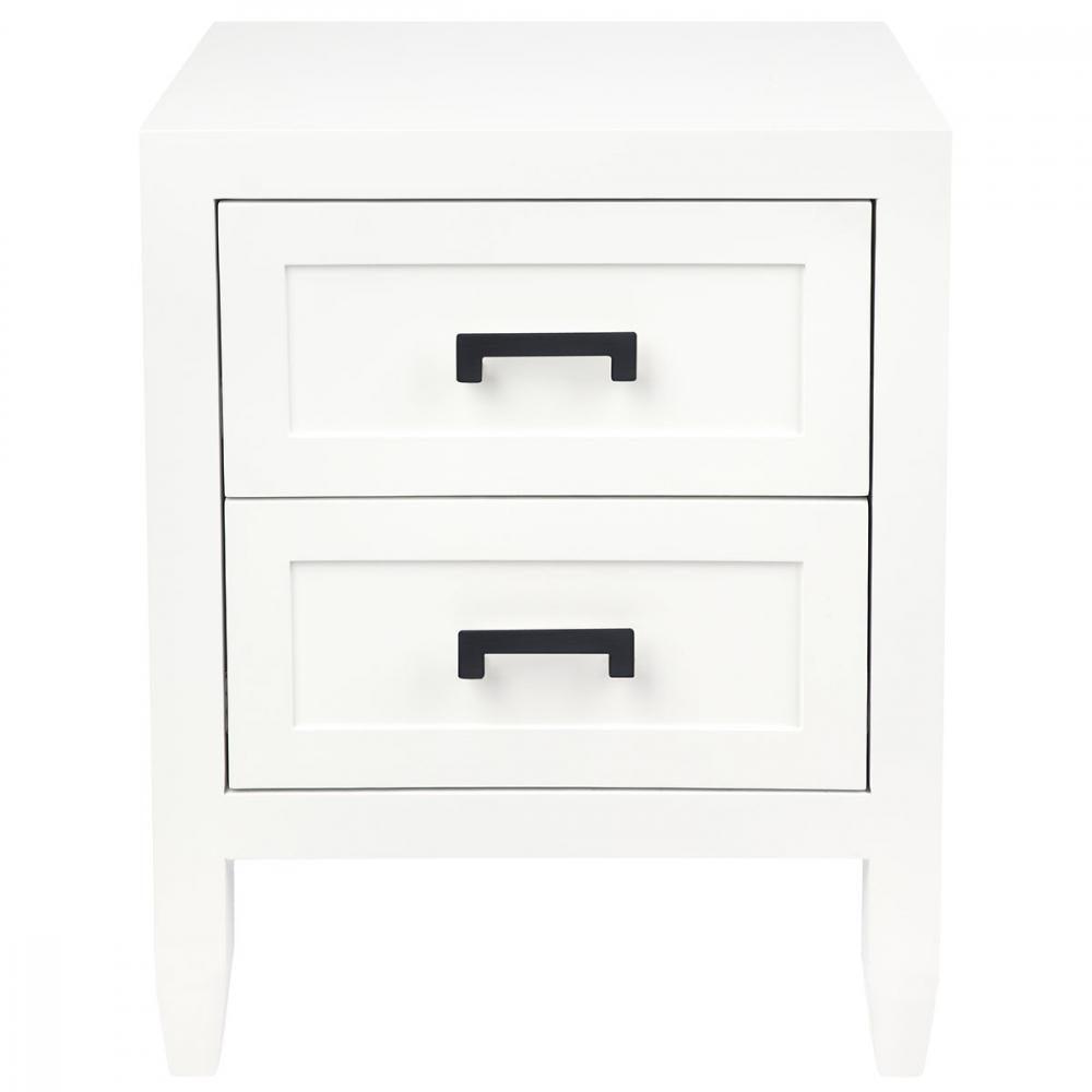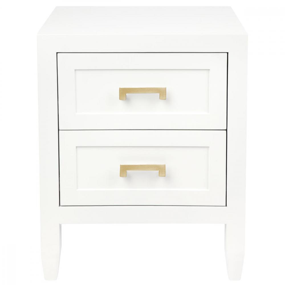 This elegant two drawer bedside table in a satin white painted finish features classic shaker drawer panelling, gently tapered legs and complimented with an option between brushed brass and black powder coated handles