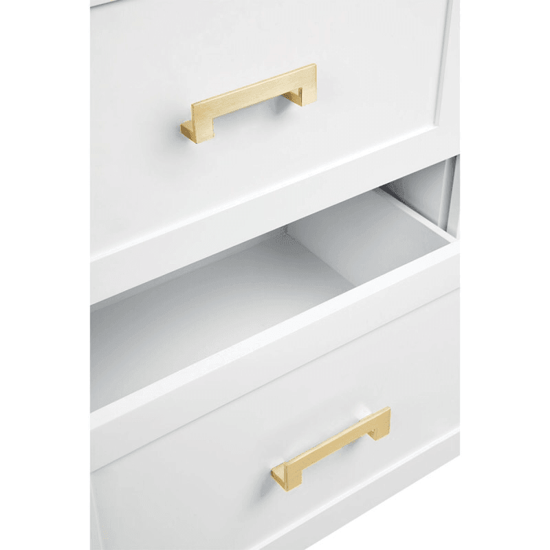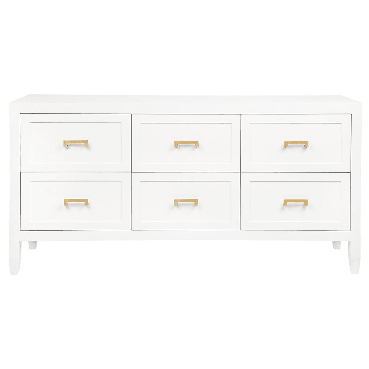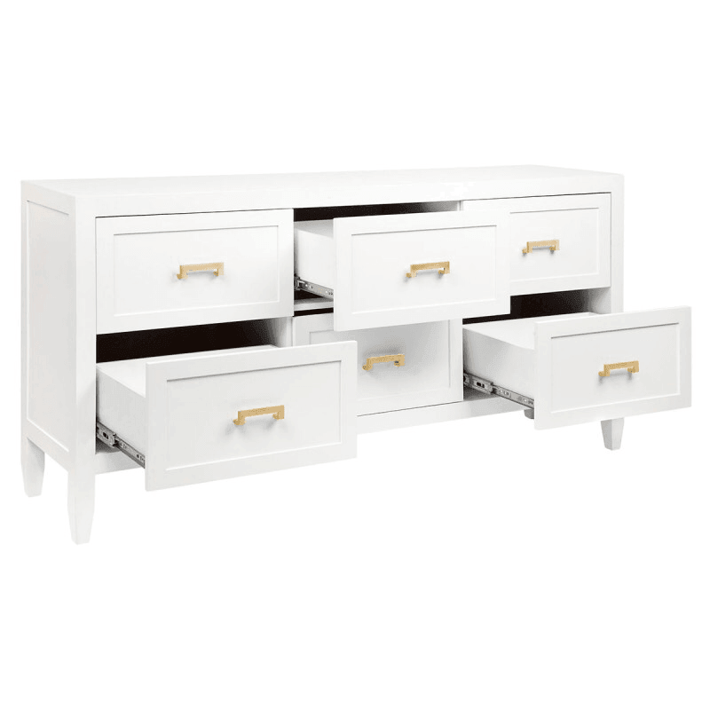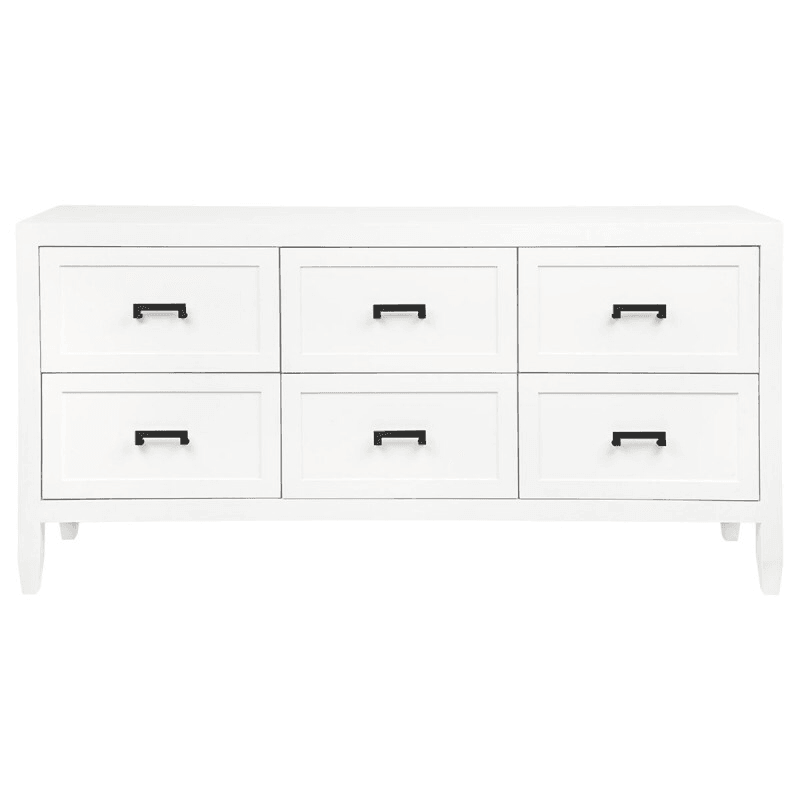 This elegant six drawer chest in a satin white painted finish features classic shaker drawer panelling, gently tapered legs and complimented with an option between brushed brass, brushed silver and black powdercoated handles. The classic and timeless detail of this design allows for practical and sleek storage.