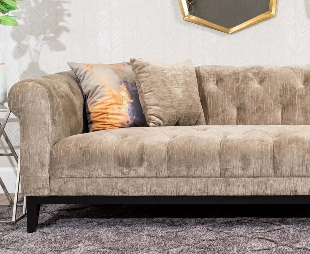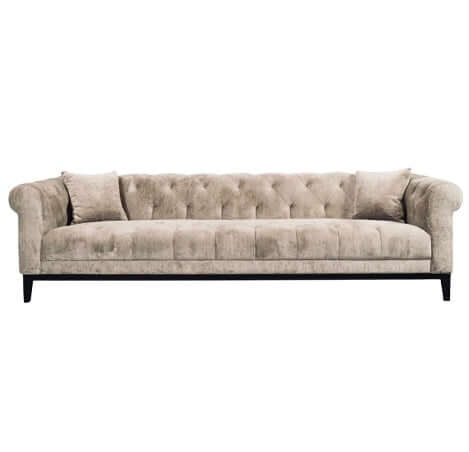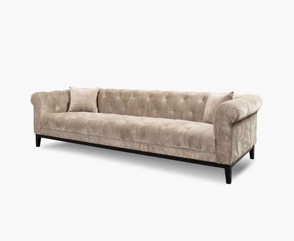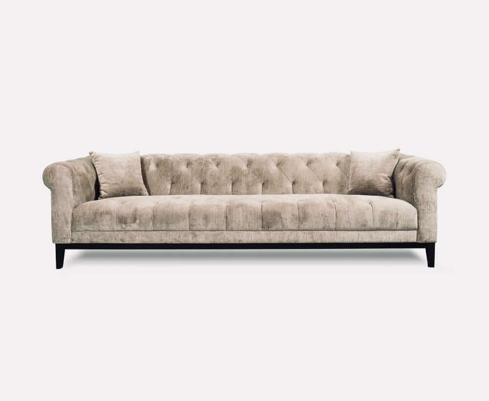 The Sparrow extra long sofa is a traditional design and an all time classic. It has tufted seats and back rest and round scroll arm rests. The fabric used is unique in its texture which has a velvet like feel but with more detail. It is a very neutral colour that will blend in with most settings. The sofa sits on a powder coated frame and comes with two complementary cushions. The comfort is gently firm, easy to get on and off with both back and bottom support which will allow for hours of relaxation in absolute comfort.