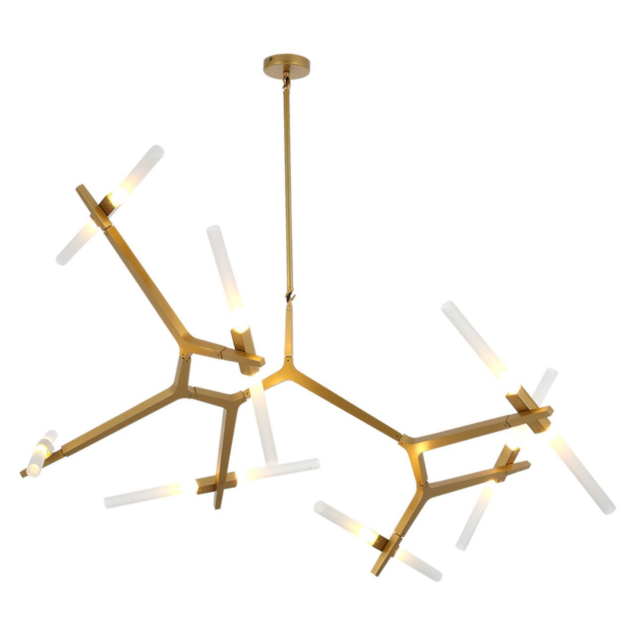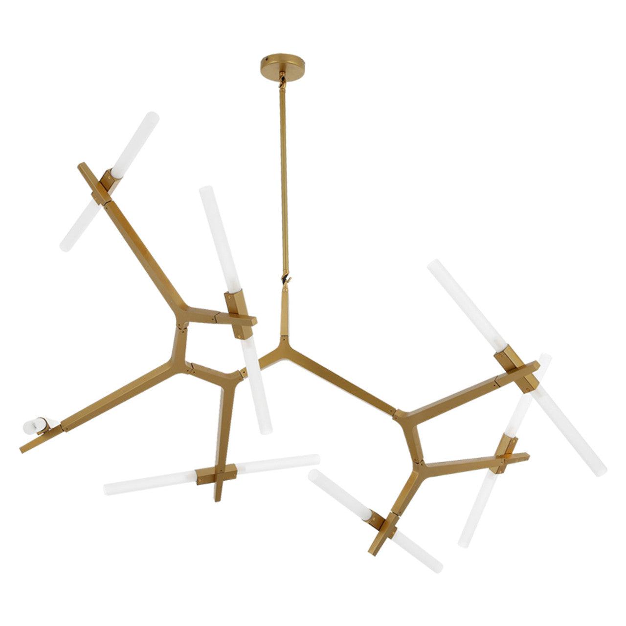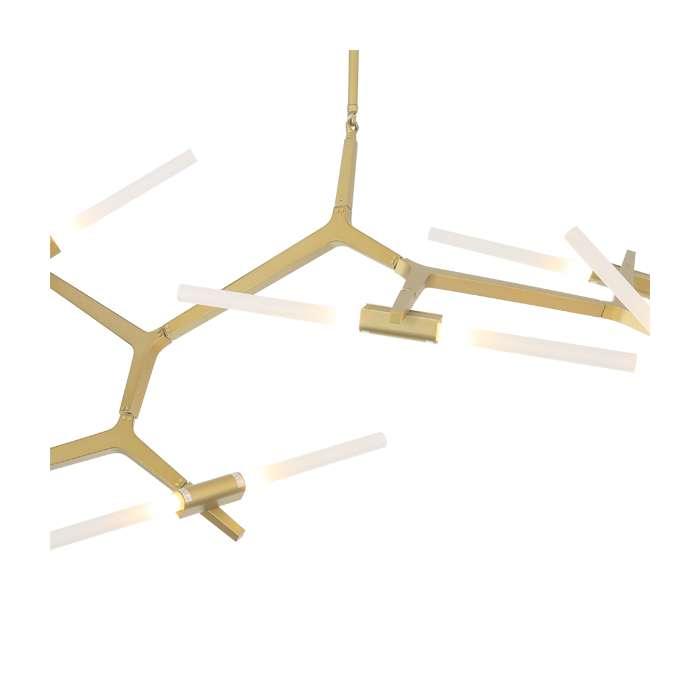 A stunning pendant lamp designed for versatility. Its joint enables extreme flexibility – rotate and arrange in whatever way you desire. This aspect of the lamp makes it an ultra-versatile piece that is suitable for any contemporary environment. Available in brushed brass – perfect for neutral contemporary environments. A modular system of metal parts that support a swarm of tubular glass lights. Glass tubes were inspired by the light’s origins as a candelabra. Made of the highest quality metal and glass that is durable and attractive. A stunning feature piece for your contemporary spaces. 10 glass tubes that can be adjusted to suit your needs – both stylish and functional. Soft white glass cylinders encase the light source.