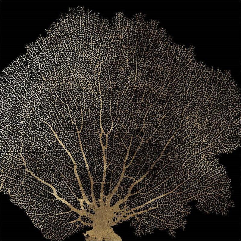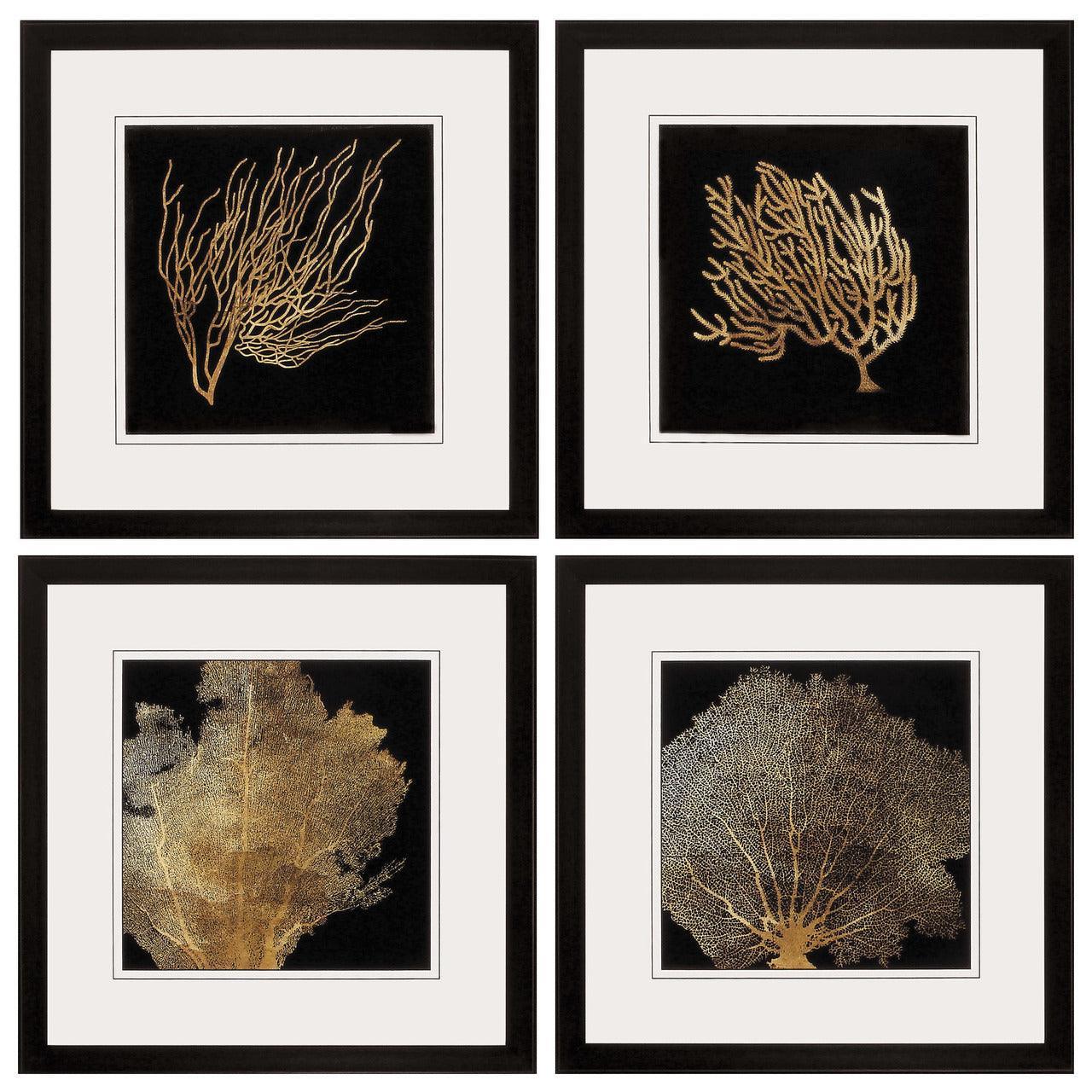 This striking set of four square coastal wall art prints on paper featuring lacy coral against dark grounds are completed in black finish frames. Delicate gold coral against a black ground creates a dynamic look in this set of four wall art prints. The white mats are accented with v-grooves to complement the look of this wall art set. Mounted under glass, this square wall art set is completed in sleek black finish frames. Perfect for a monochromatic room or as a counterpoint to any color scheme.