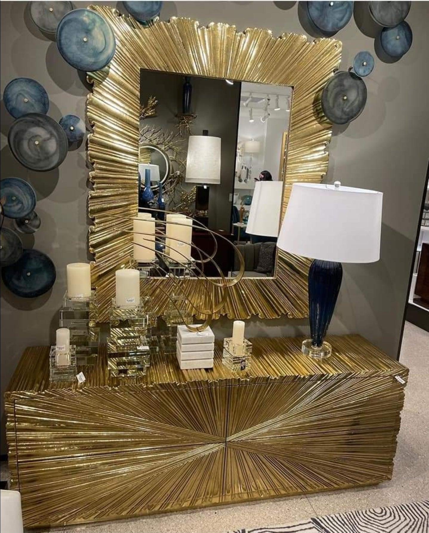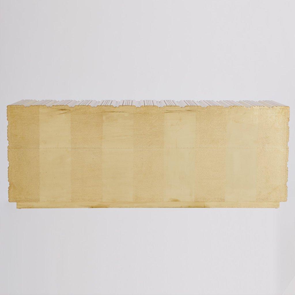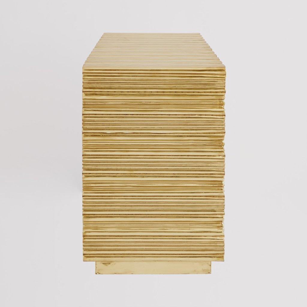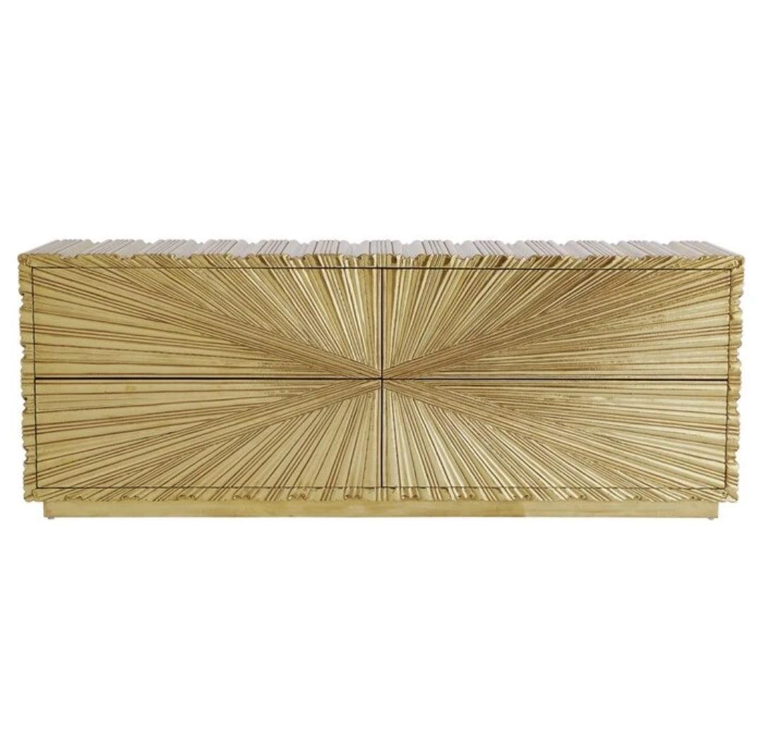 Starburst Brass Large Credenza Buffet, Limited Edition Starburst Brass metal chest drawer has an Art Deco inspired look with textured starburst pattern made of Brass metal with a protective coating. Four push open metal glide drawers. Also available in 4 door cabinet model.
