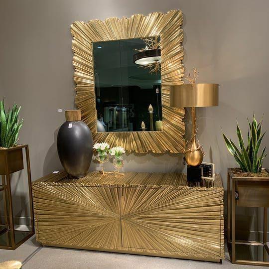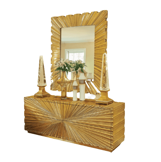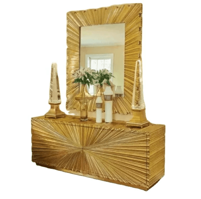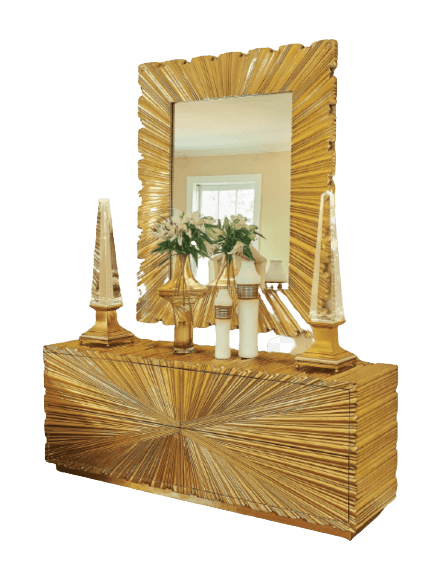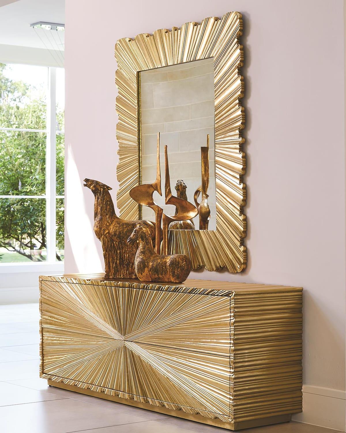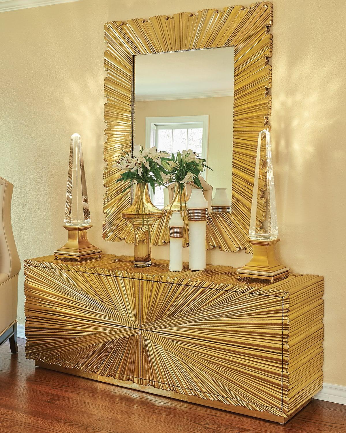 Starburst Brass Large Credenza Buffet, Limited Edition Starburst Brass metal chest drawer has an Art Deco inspired look with textured starburst pattern made of Brass metal with a protective coating. Four push open metal glide drawers. Also available in 4 door cabinet model.