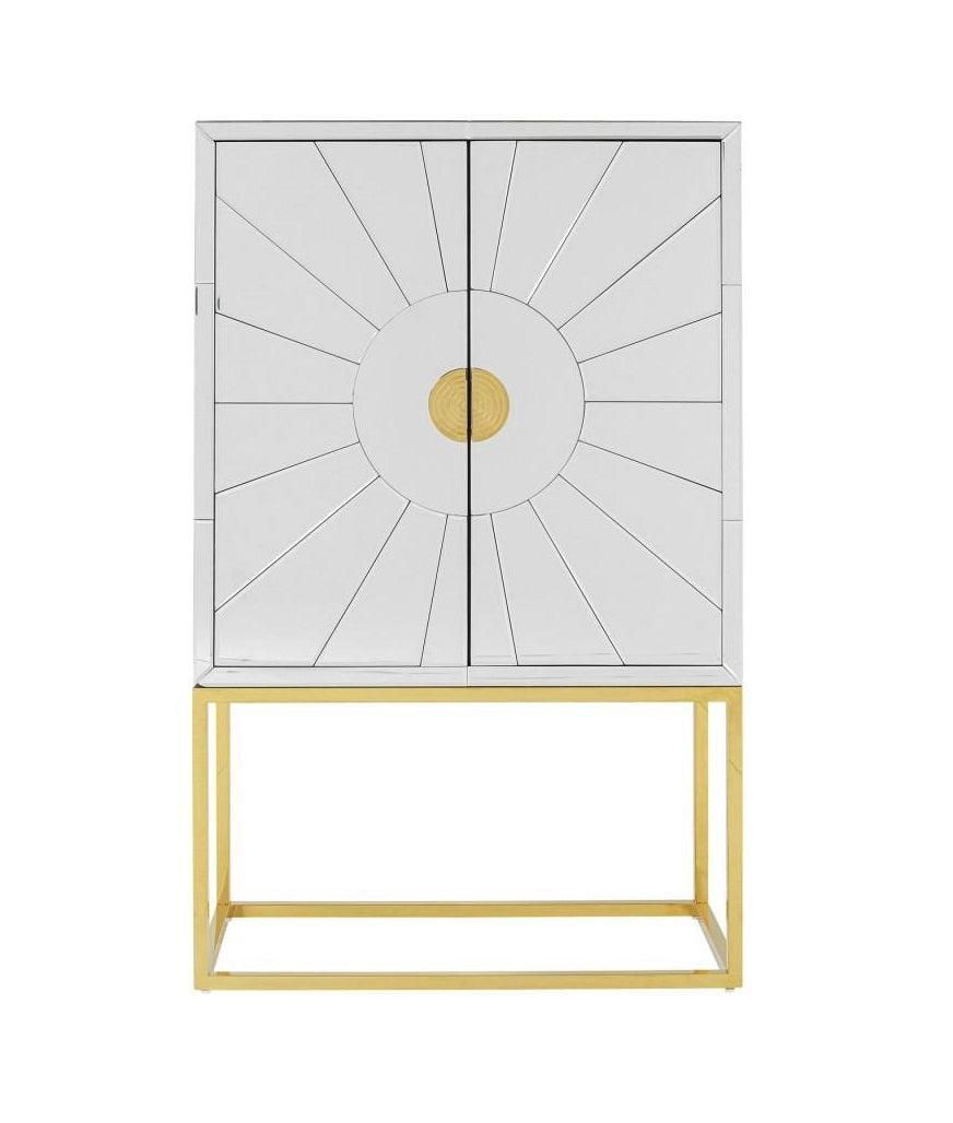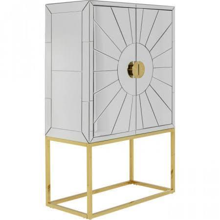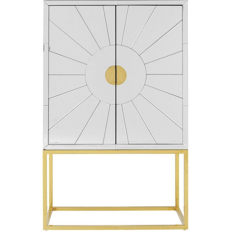 This bar cabinet has an elegant elegant not only allows you to store your glasses, fine wines and spirits but also to contemplate yourself in its mirror front. With its two handles that form a sunburst between the mirrored panels, it will fit into any sophisticated interior. sophisticated interior. Four adjustable glass shelves. Rails for glasses with feet. Delivered unassembled.