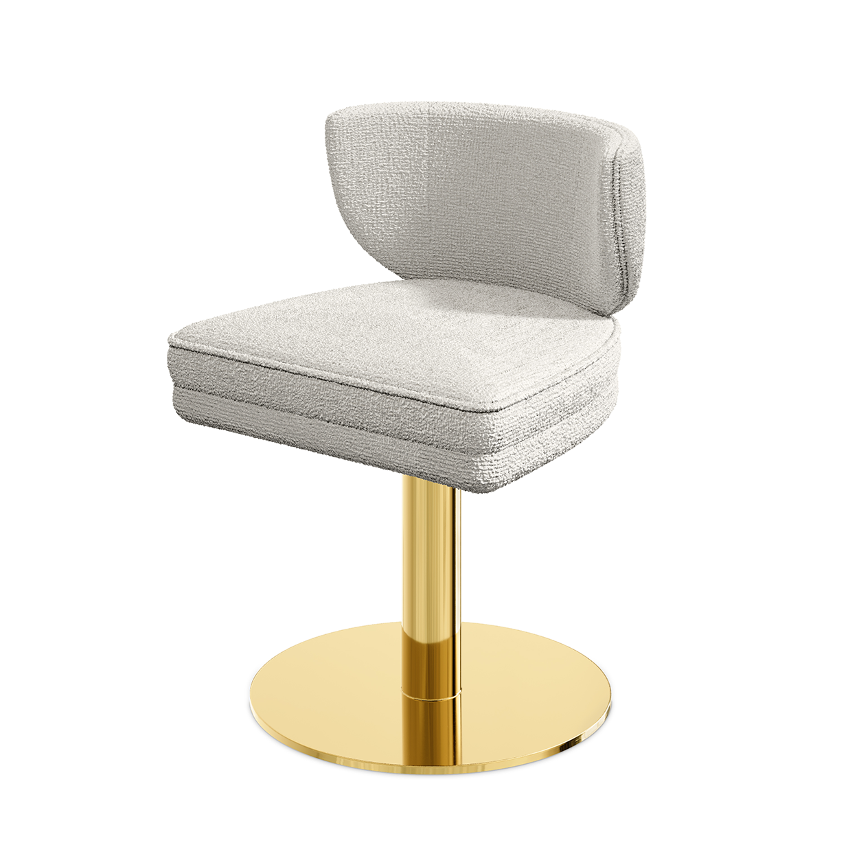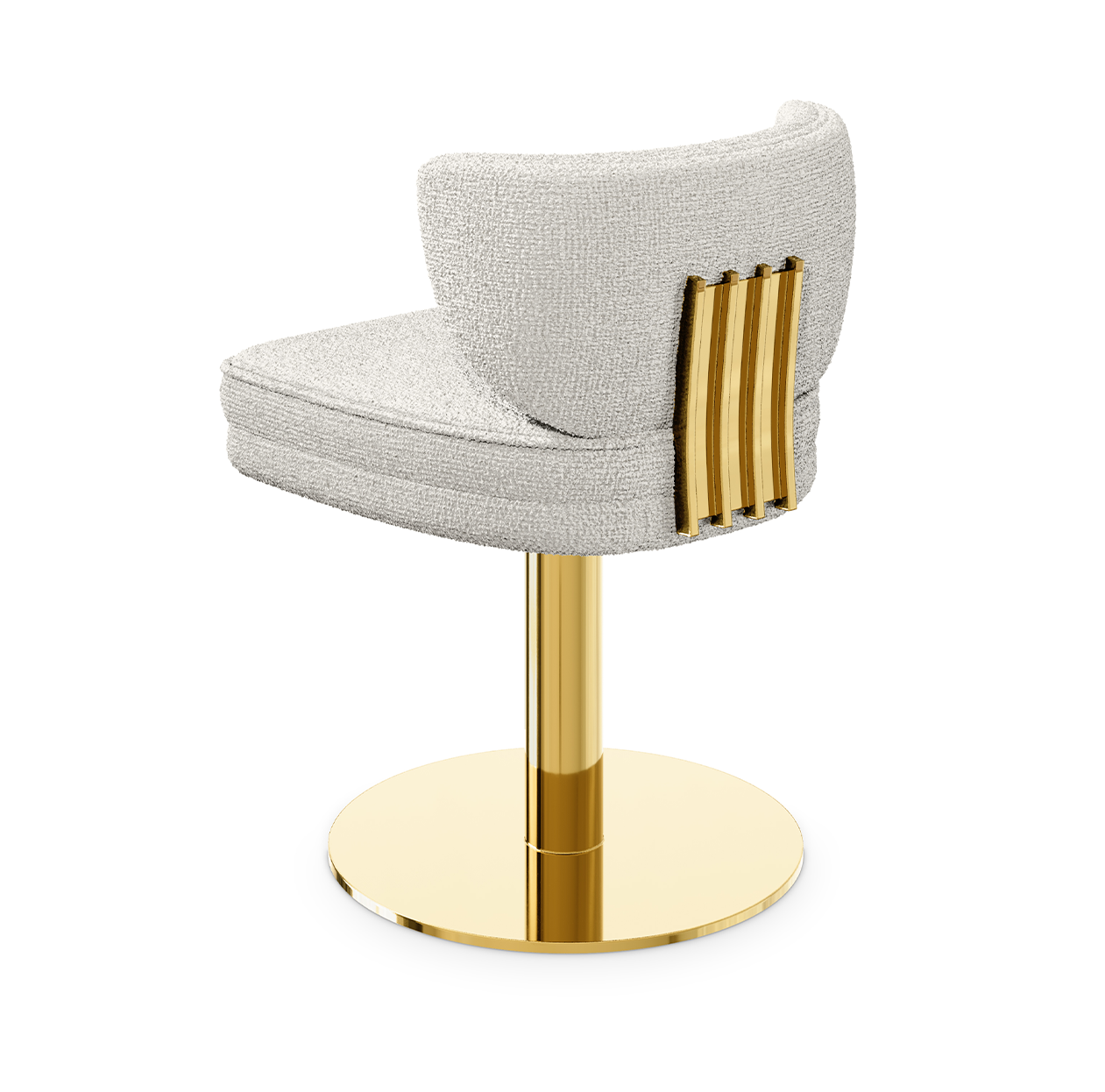 The swivel dining chair exudes sophistication with its plush, curved seat upholstered in a warm, muted fabric. This stylish piece features an ergonomic, semi-enclosed backrest that provides ample support while maintaining a sleek silhouette. The base, crafted from polished gold metal, is a striking contrast, adding a touch of luxury and seamlessly complementing the surrounding decor.