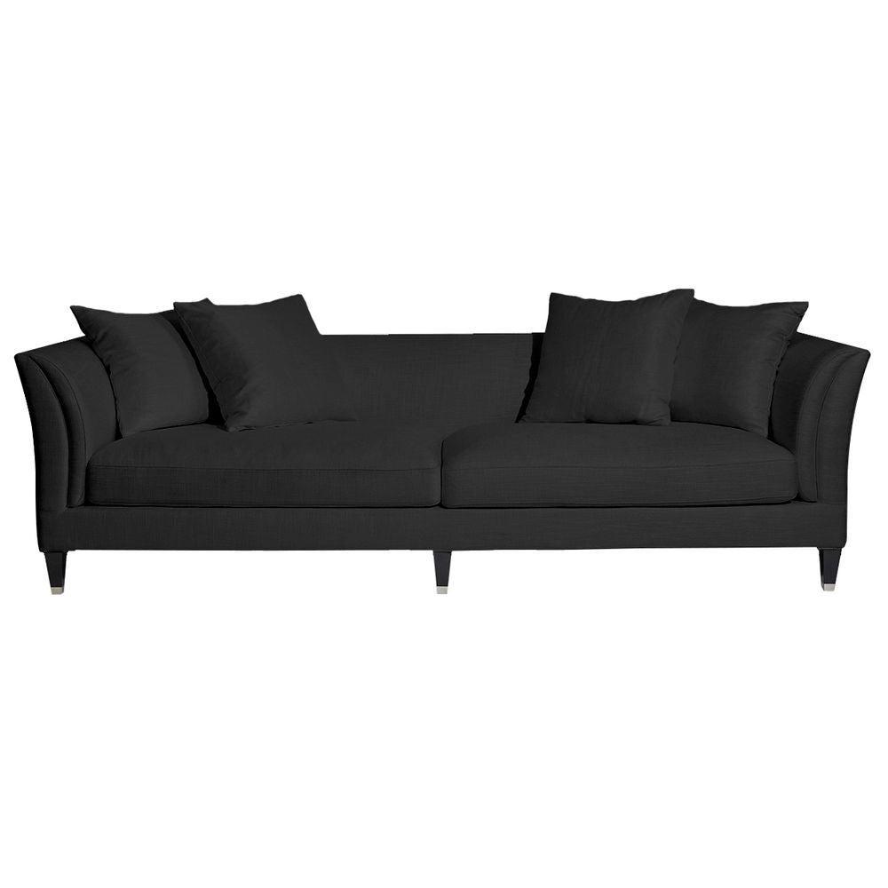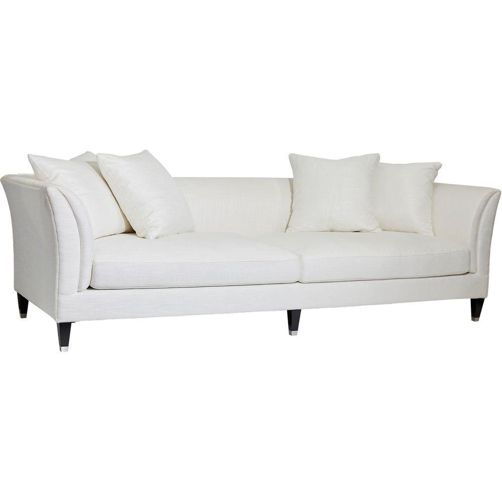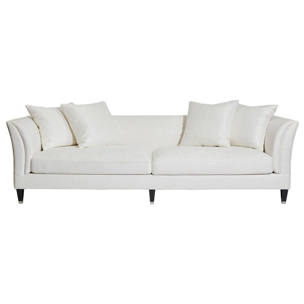 White linen/viscose upholstered 3 seater sofa. Low back sleek design with rounded wedge arms. Complete with 4 large matching scatter cushions. Timber legs with silver caps