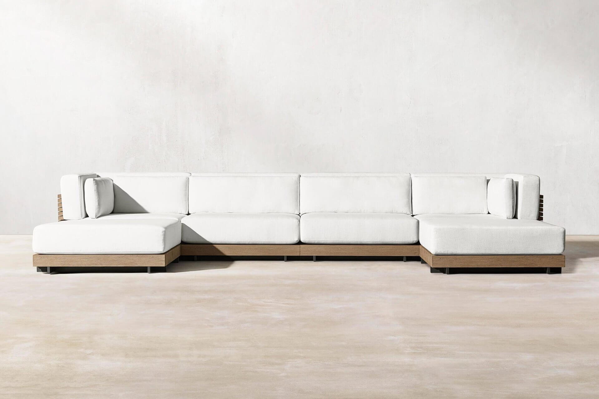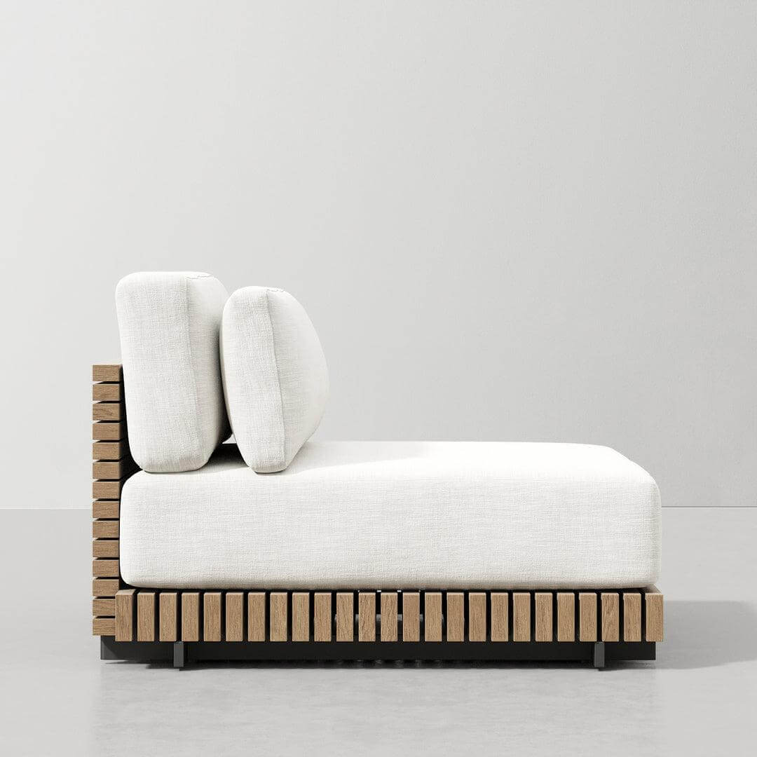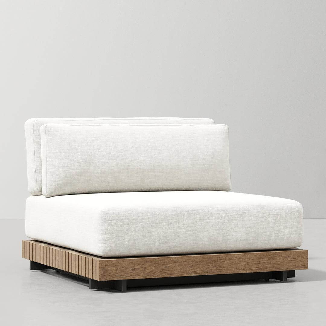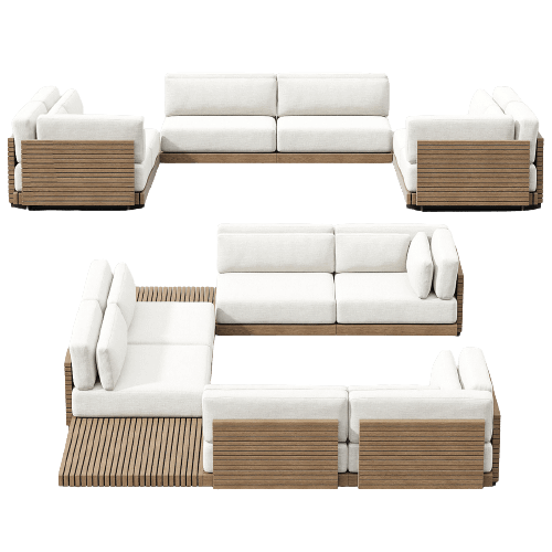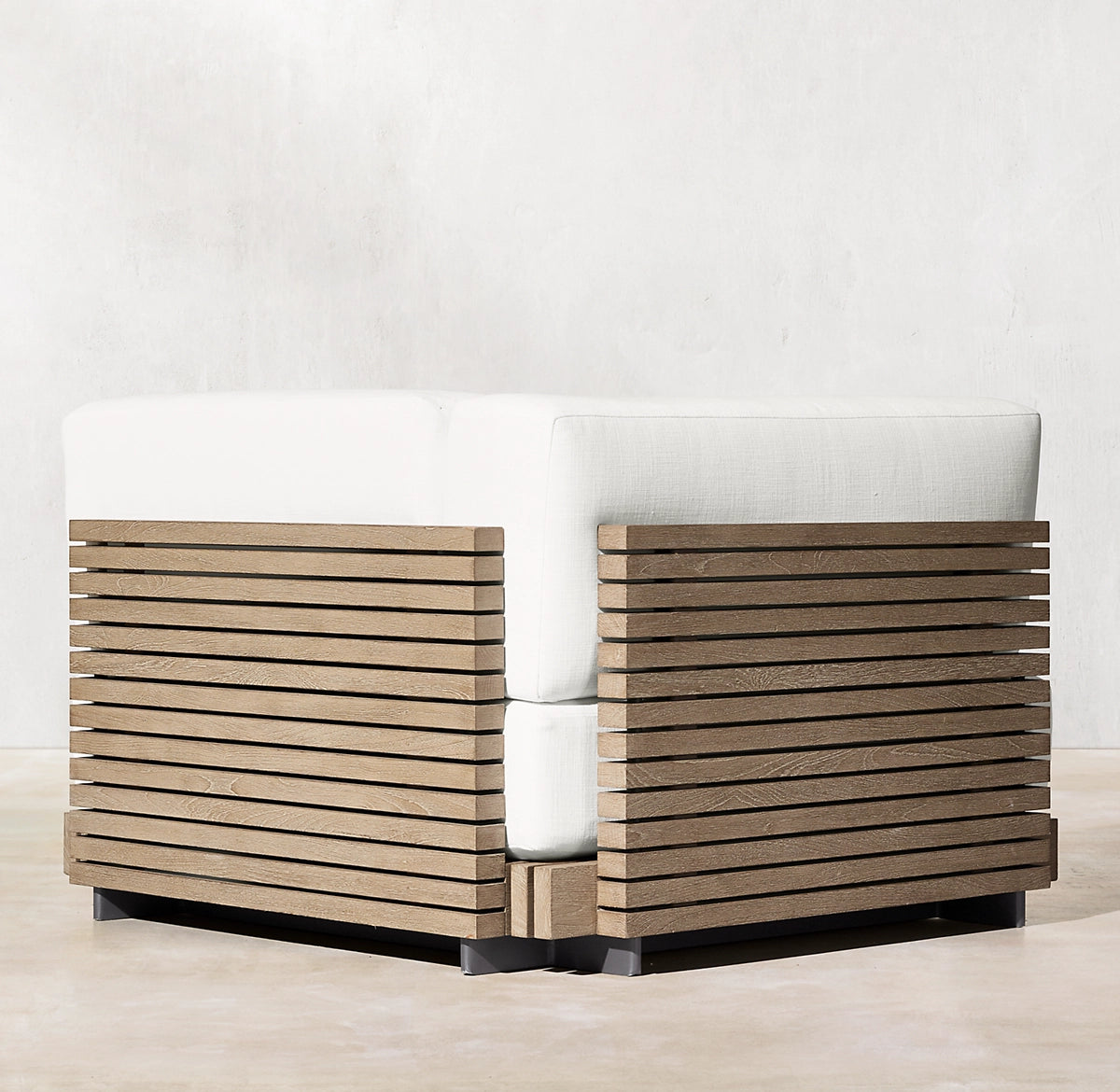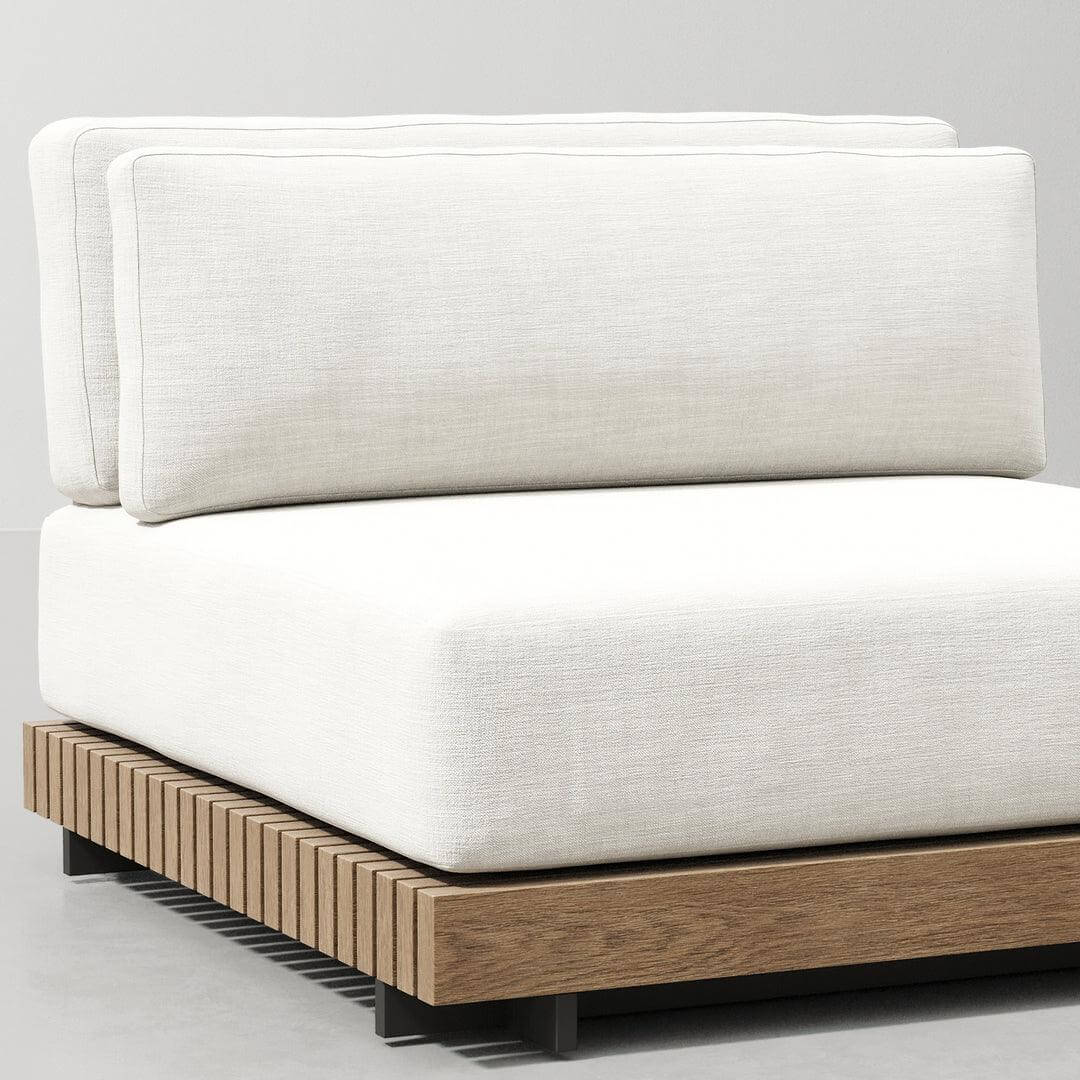 Teakwood Outdoor White Fabric Modular Corner sofa. Handcrafted with Premium weather resistant materials with waterproof powder coasted black aluminium base and linear Weatherproof teak wood in Natural finish.