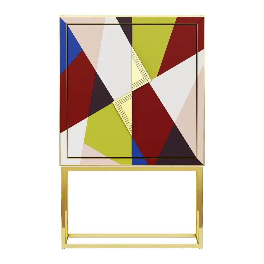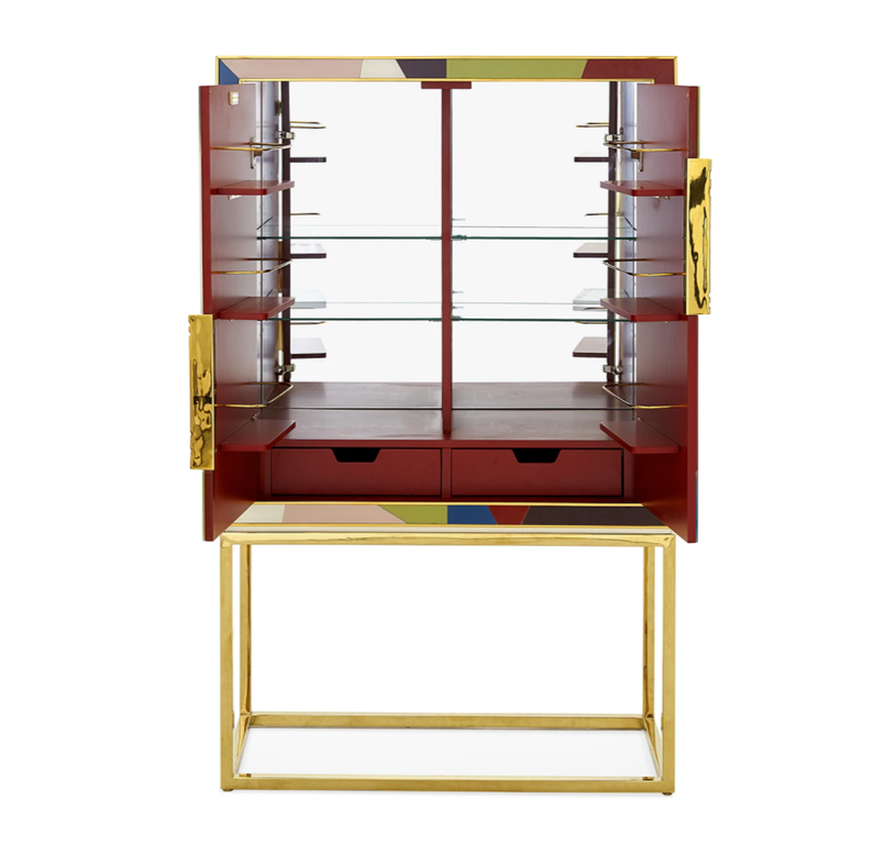 Tempo Muti-Colour Glass Gold Bar Cabinet. Multi-colored glass with polished gold base featuring our intoxicating pop art palette are set in gleaming polished gold framework. Fitted with adjustable tempered glass shelves, plus six wire-bound drinking glass shelves inside the doors. Two soft slide tray drawers keep your mixing accouterments at hand. Think Halston, think Studio 54, think Egon von Fürstenberg—totally 70s, totally today.