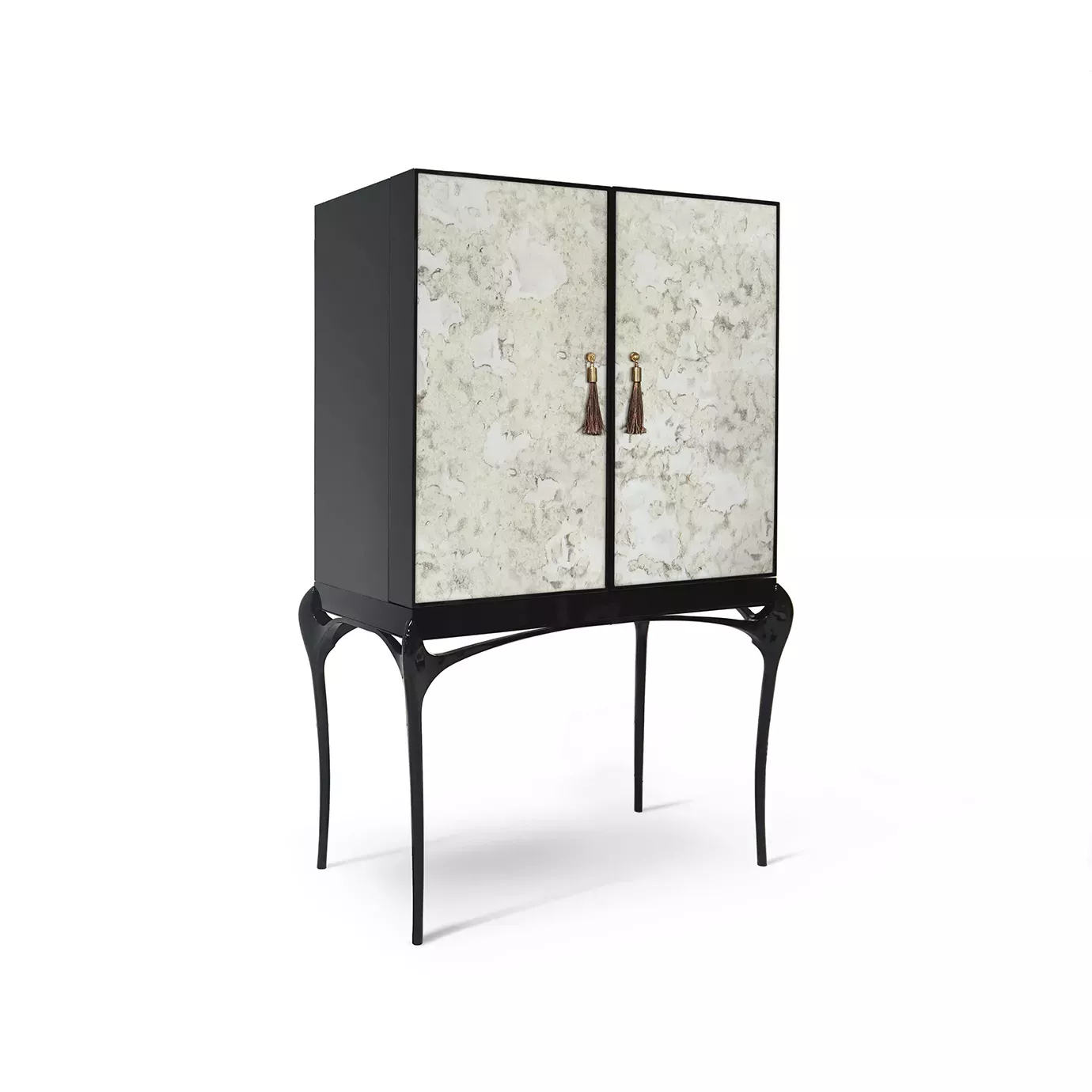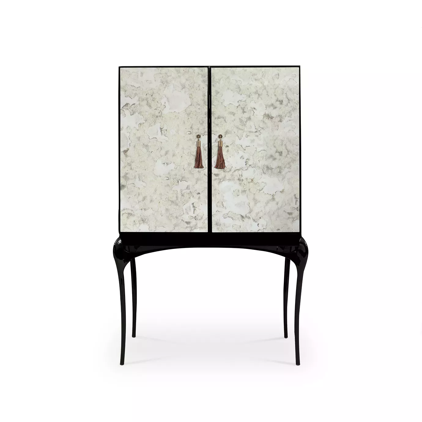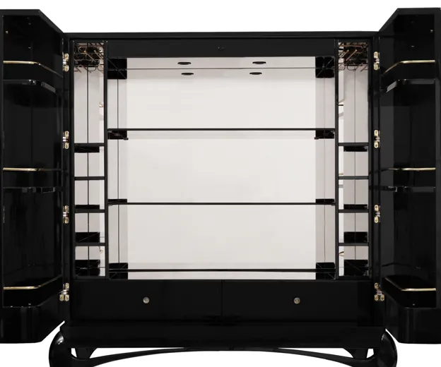 Enticing admirers with its exotic doors and sexy curved lacquered legs, the Temptation Bar Cabinet will steal cocktail hour. The chic black and gold interior is perfectly designed to store your wine and cocktail accoutrements. Open or closed with its flirty tassel pulls exposed, this bar cabinet is ready for a party or a romantic night in. Cheers!