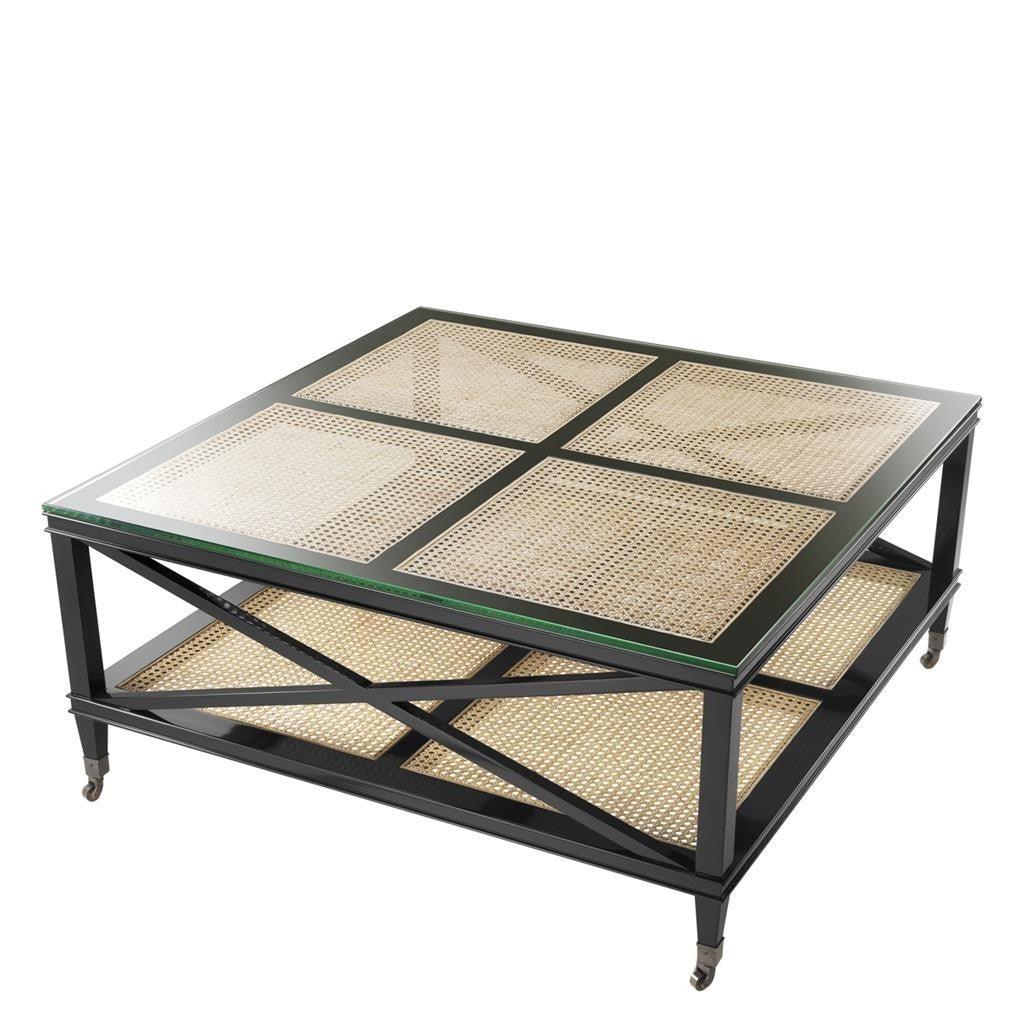 Townsend black coffee table with black hardwood, natural cane and clear glass top with antique bronze wheels. Matching designs in this collection available.