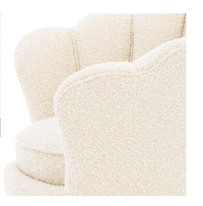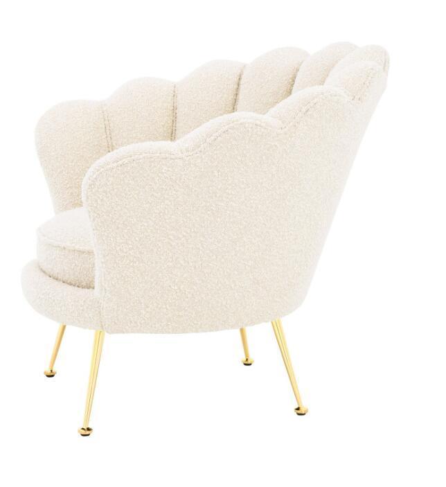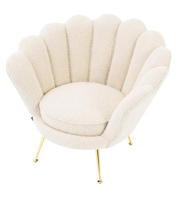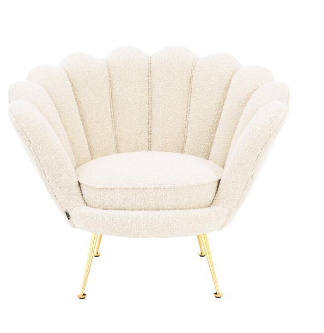 The Trapeze boucle shell shaped chair comes with fun sea shell shaped back and brass legs and can transform a room from dull to stylish with its unique shape and colouring.