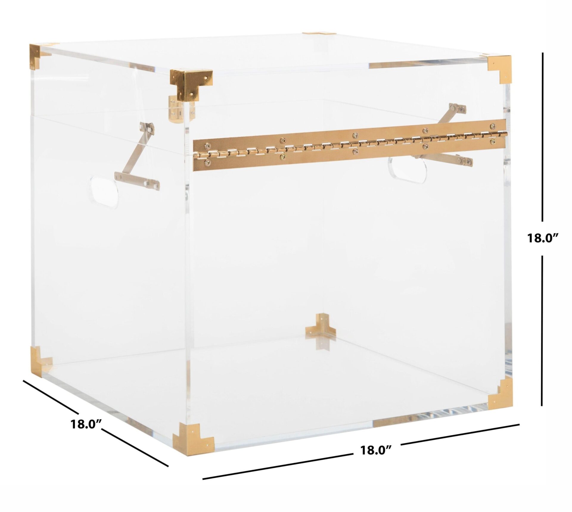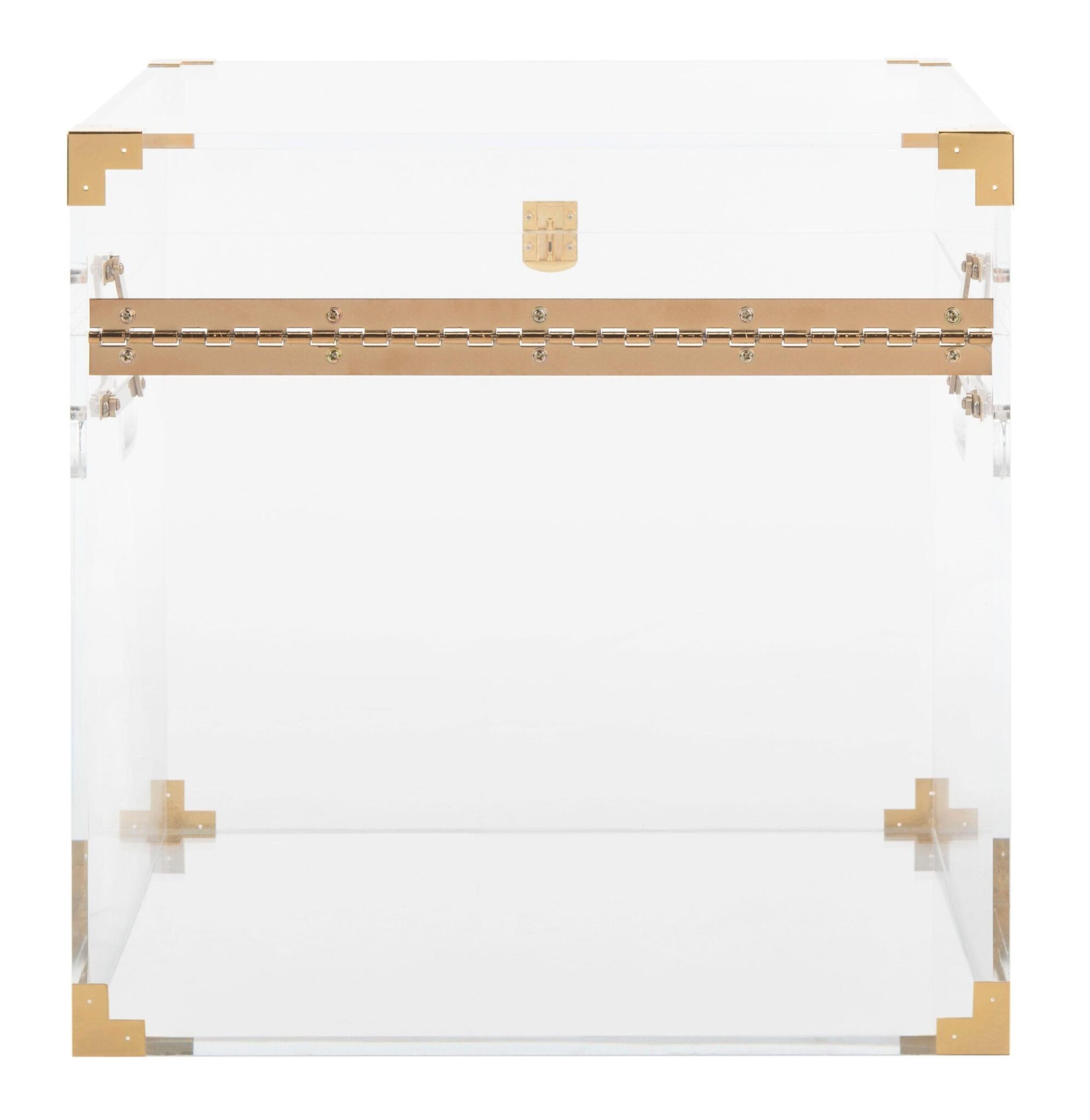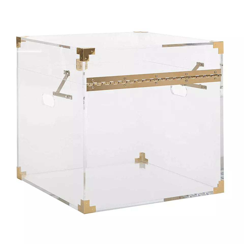 The stylish Trend Trunk End Table by Art Deco Home immediately exudes glamour and elegance in any space. Clear Lucite box design features a stunning high-gloss finish with gorgeous gold leaf brass hardware. High-quality Lucite and Electroplated metal construction. Place fragile accents inside for protected admiration. Elegant, trendy design brightens any living room or bedroom ensemble to display your decorative accents in style. Available in Gold or Chrome finish hardware. Place fragile accents inside for protected admiration. Elegant, trendy design brightens any living room or bedroom ensemble to display your decorative accents in style. Available in Gold or Chrome finish hardware.