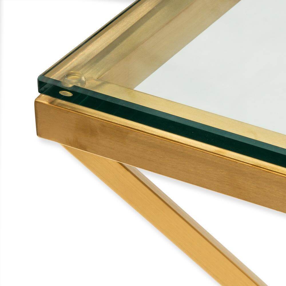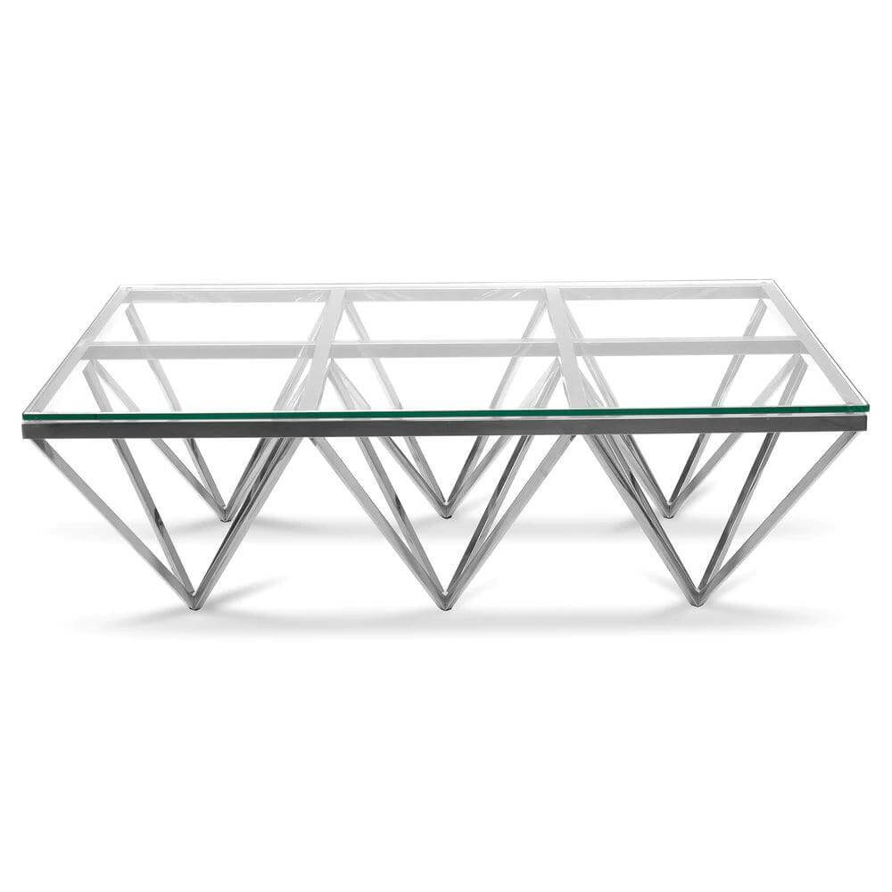 Vendome Chrome Rectangle Coffee Table. Durable clear tempered glass table top. Intricate brushed chrome finish diamond base frame adds interest to an ordinary ambience. Silver hues offer a delicate contrast to the glass. Feet protectors included preventing slipping or scuffing.