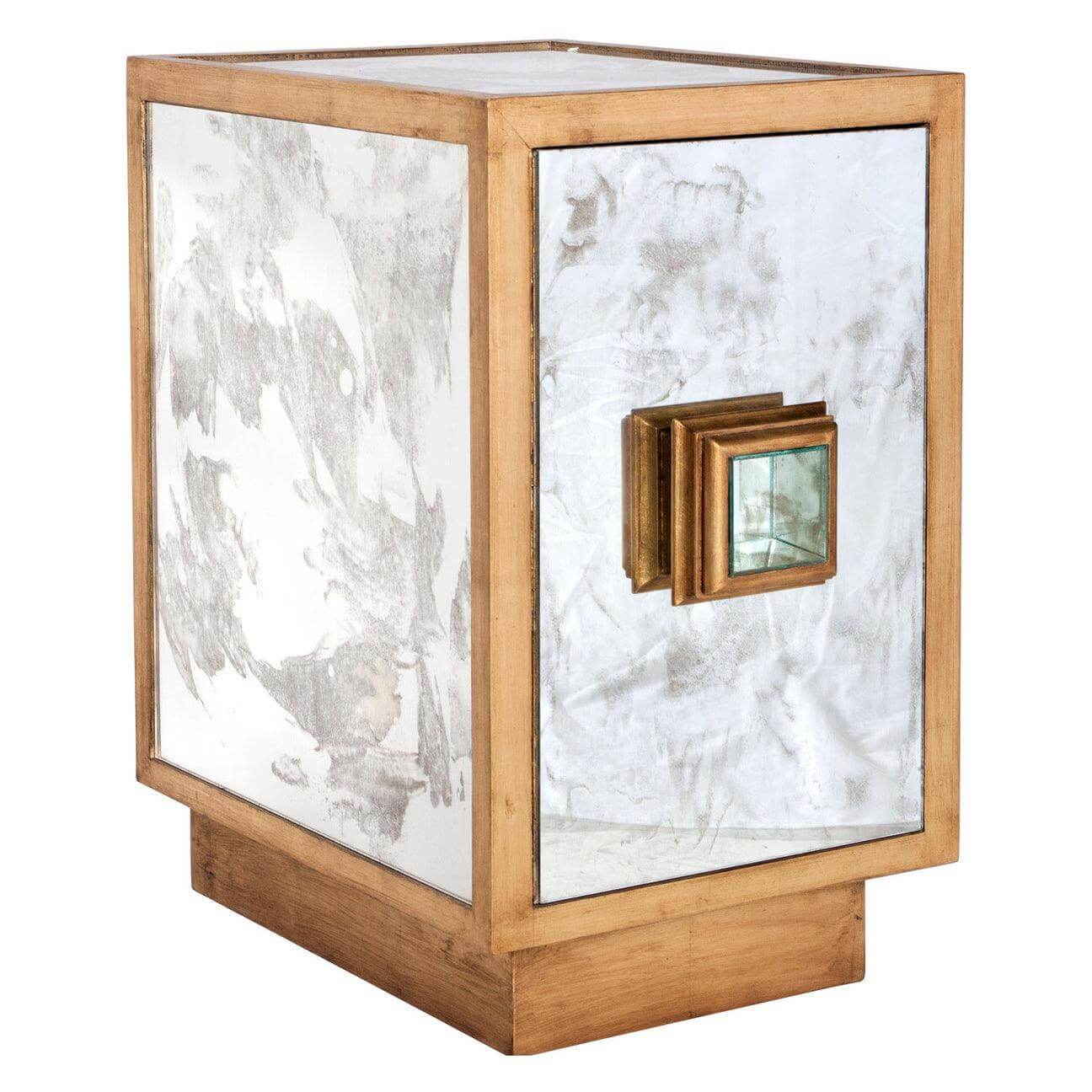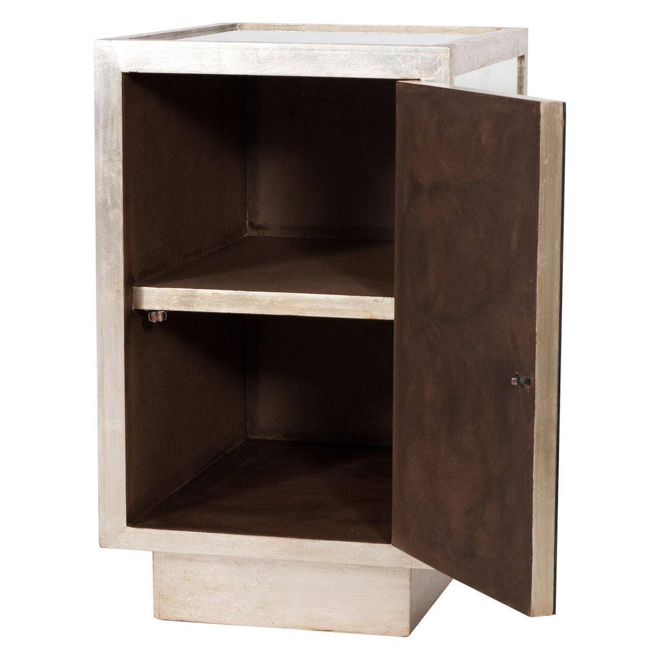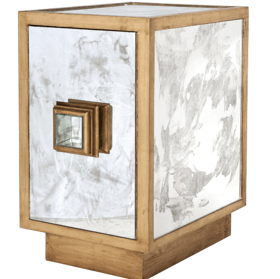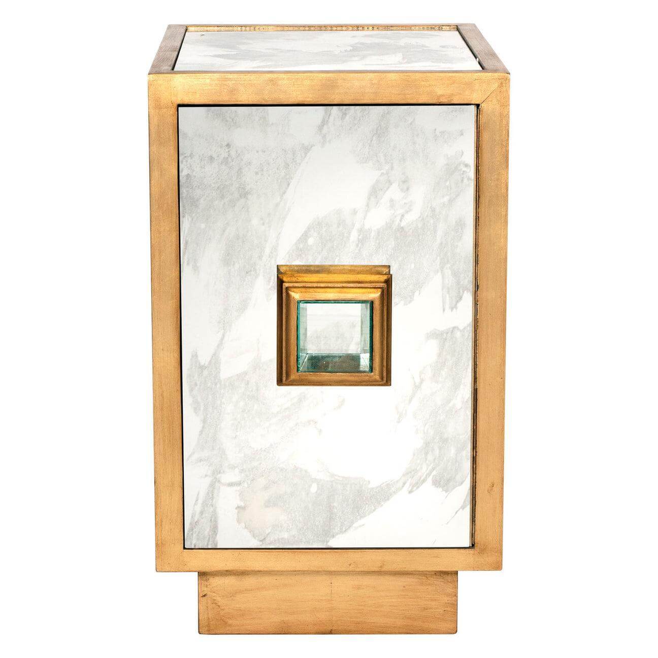Contemporary glamor comes to life upon this gorgeous side table. Its eclectic textures complement a range of styles, making it the perfect addition to a bedroom or living room. Clean, elegant lines give this furnishing an elevated finish. One door cabinet with antique mirror and gold leaf or silver leaf edging.