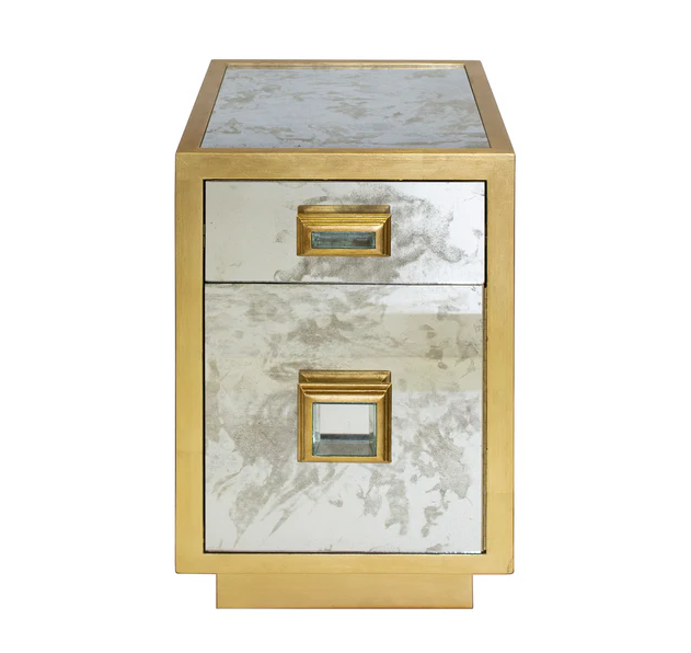 Contemporary glamor comes to life upon this gorgeous side table. Its eclectic textures complement a range of styles, making it the perfect addition to a bedroom or living room. Clean, elegant lines give this furnishing an elevated finish. One door cabinet with antique mirror and gold leaf or silver leaf edging.