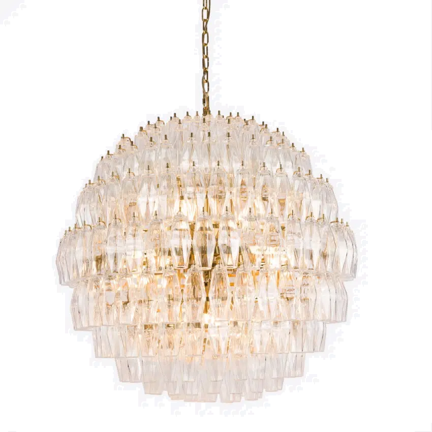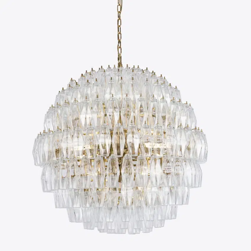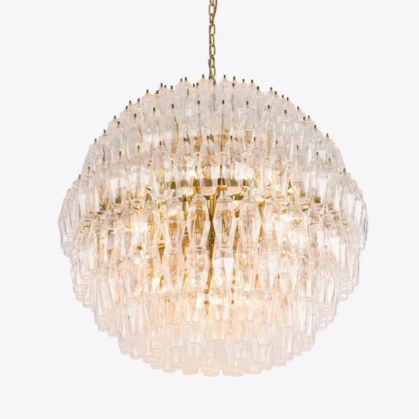 Our Vertier chandelier is a show stopping, vintage inspired lighting piece. This vintage design chandeliers are comprised of tiers of coloured glass polyhedrons, each of which is individually bolted to a brass finish frame.