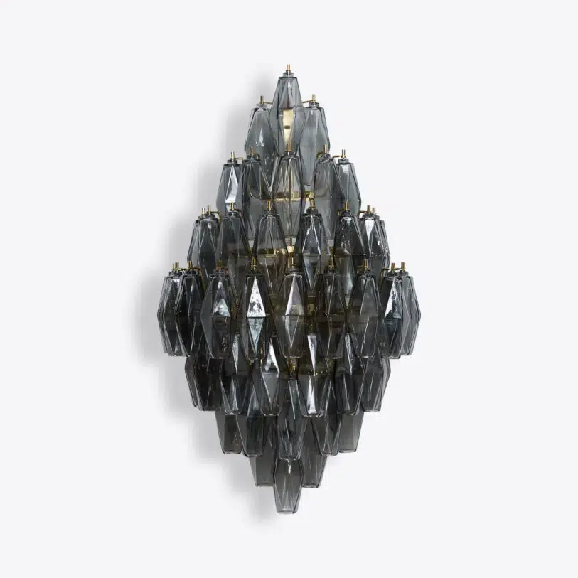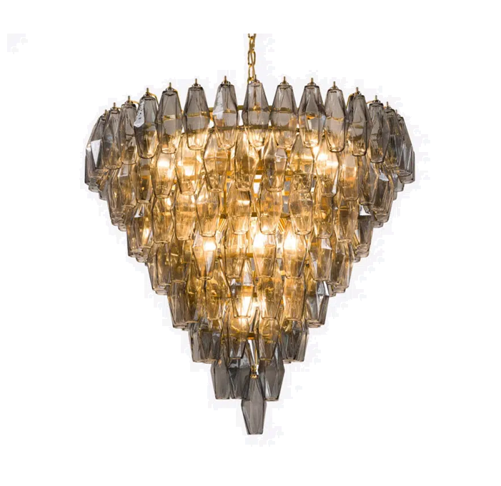 Vertier Smoked Fluted Glass Brass Large Chandelier. Our Vertier chandelier is a show stopping, vintage inspired lighting piece. This vintage design chandeliers are comprised of tiers of coloured glass polyhedrons, each of which is individually bolted to a brass finish frame.