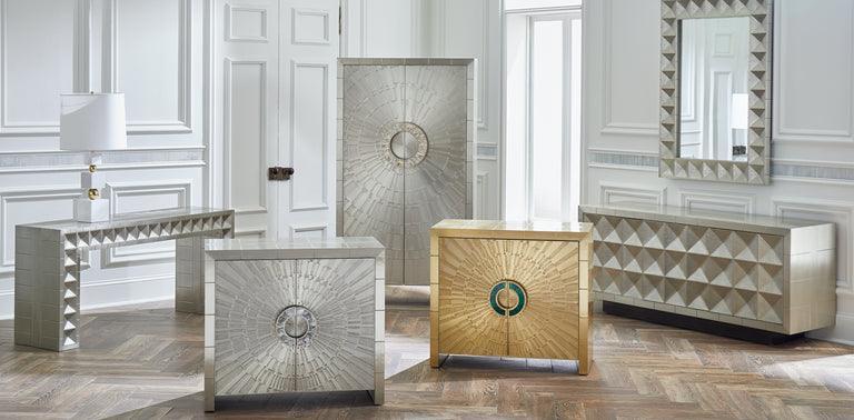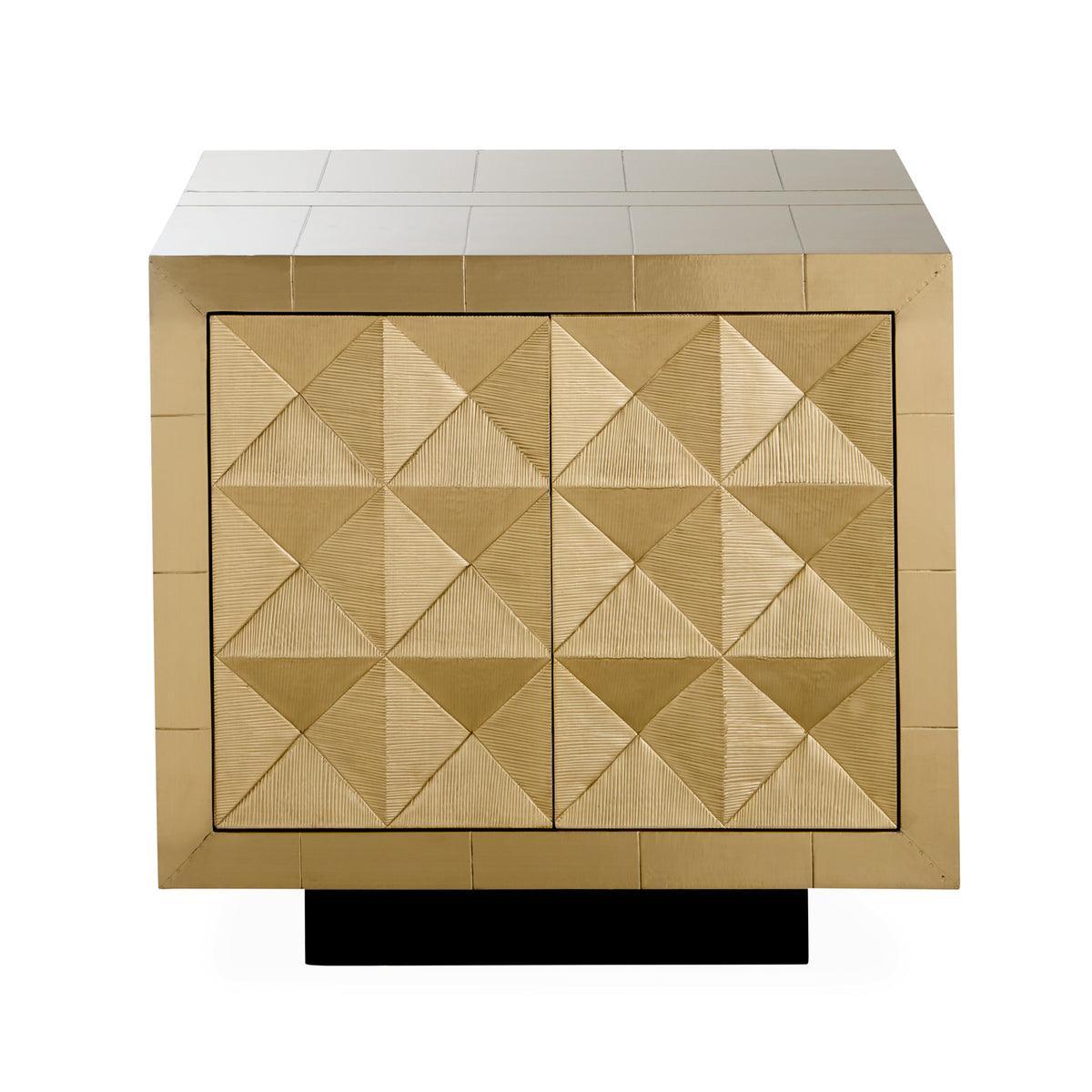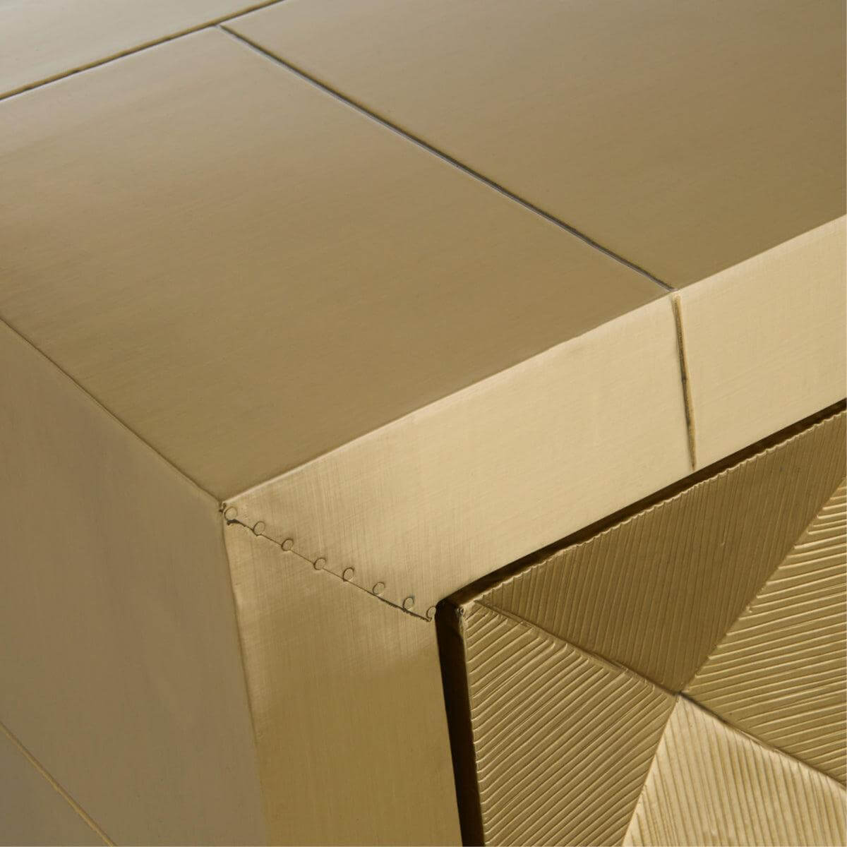 Vertigo Brass Small Cabinet features minimalist forms wrapped in hand-stamped metal in 3D stud patterns. The brass-plated metal surface is reminiscent of gold leaf— the brass finish radiates glamorous warmth. Both are wonderfully durable with a solid presence, but still feel light and elegant. Eye-catching as an entry chest, let the geometric stud pattern shine in a glamorous lair or read more rock ‘n’ roll in a more minimalist space.
