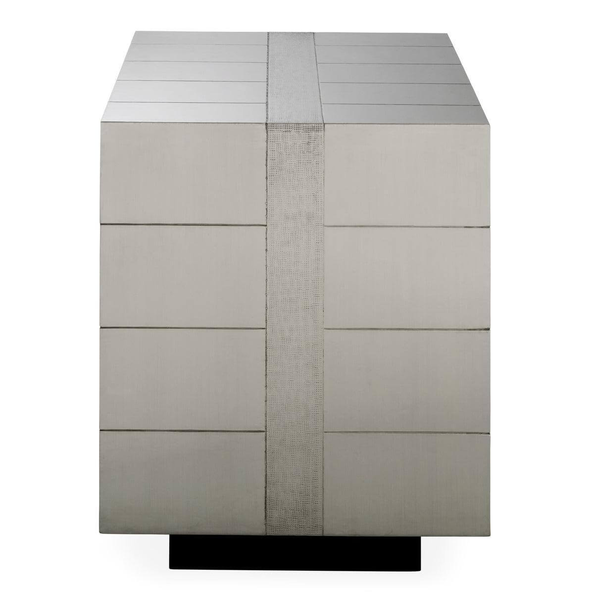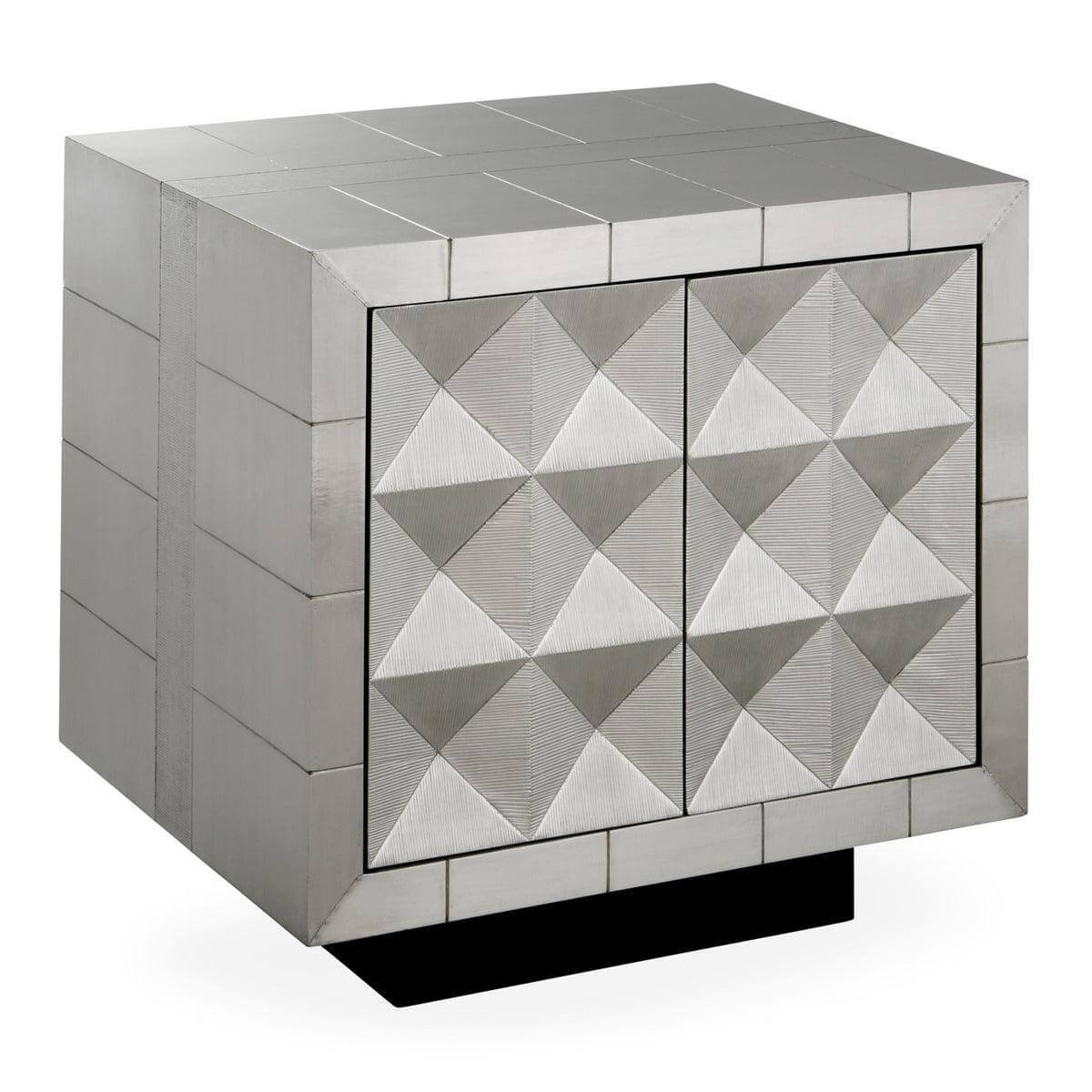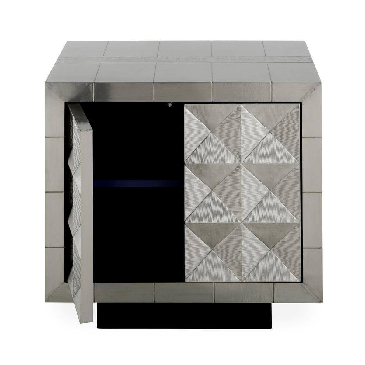 Vertigo Brass Small Cabinet features minimalist forms wrapped in hand-stamped metal in 3D stud patterns. The brass-plated metal surface is reminiscent of gold leaf— the brass finish radiates glamorous warmth. Both are wonderfully durable with a solid presence, but still feel light and elegant. Eye-catching as an entry chest, let the geometric stud pattern shine in a glamorous lair or read more rock ‘n’ roll in a more minimalist space.