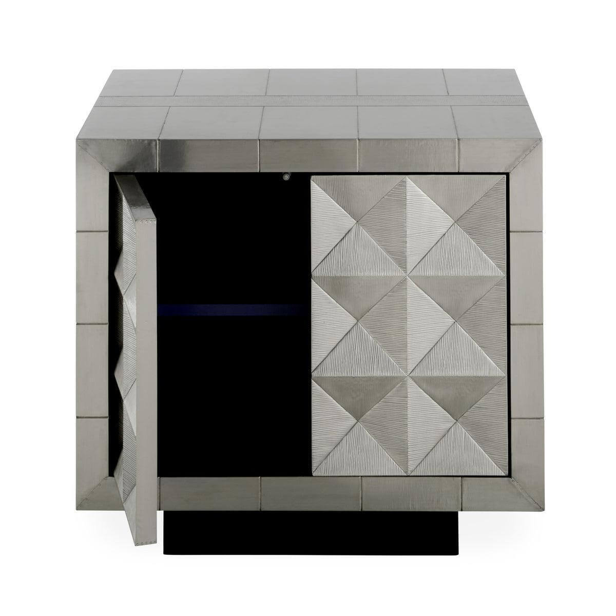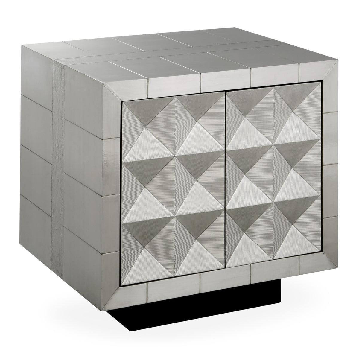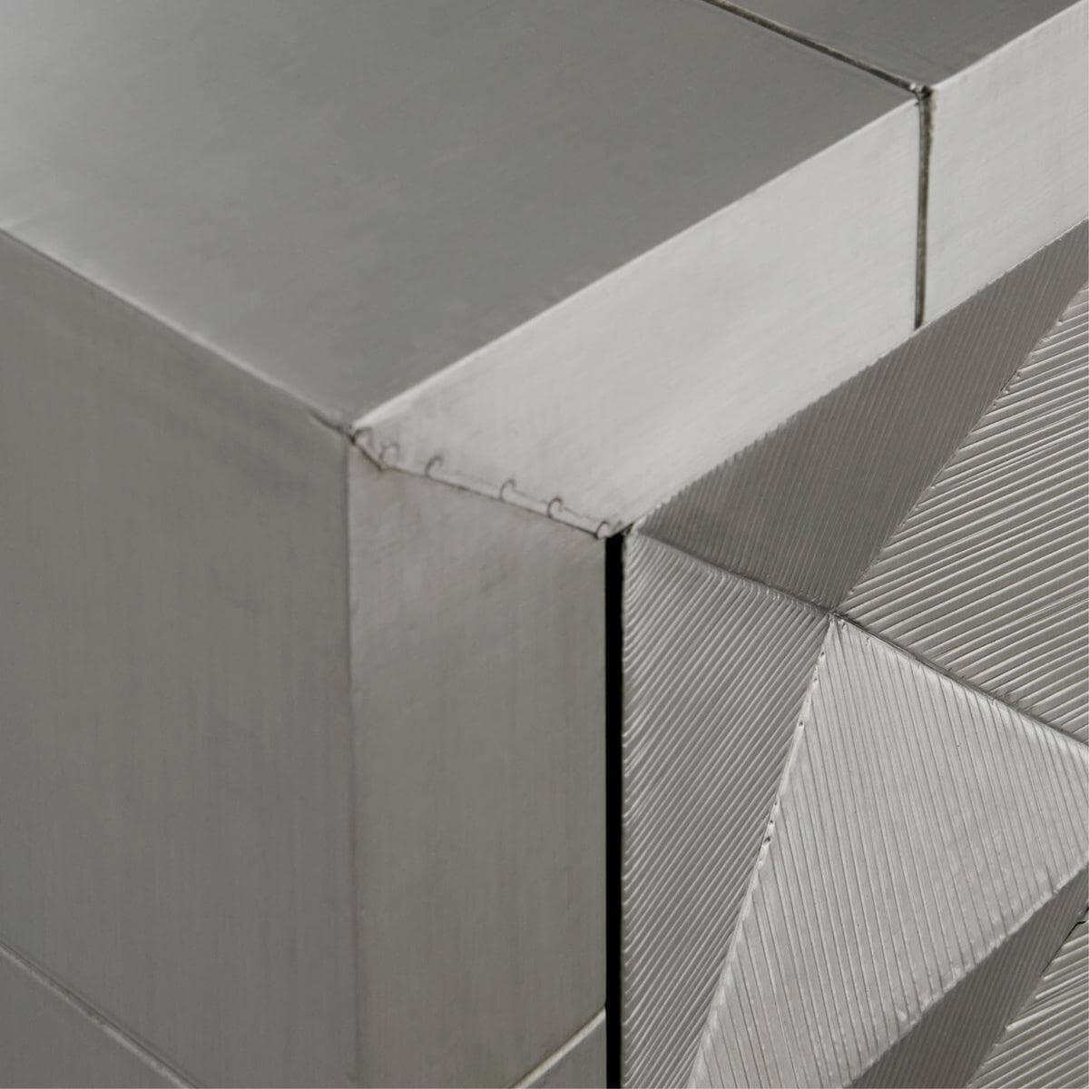 Vertigo Nickel Cabinet features minimalist forms wrapped in hand-stamped metal in 3D stud patterns. The nickel-plated metal surface is reminiscent of silver leaf—it emits that same lustrous glow—while the brass finish radiates glamorous warmth. Both are wonderfully durable with a solid presence, but still feel light and elegant. Eye-catching as an entry chest, let the geometric stud pattern shine in a glamorous lair or read more rock ‘n’ roll in a more minimalist space.